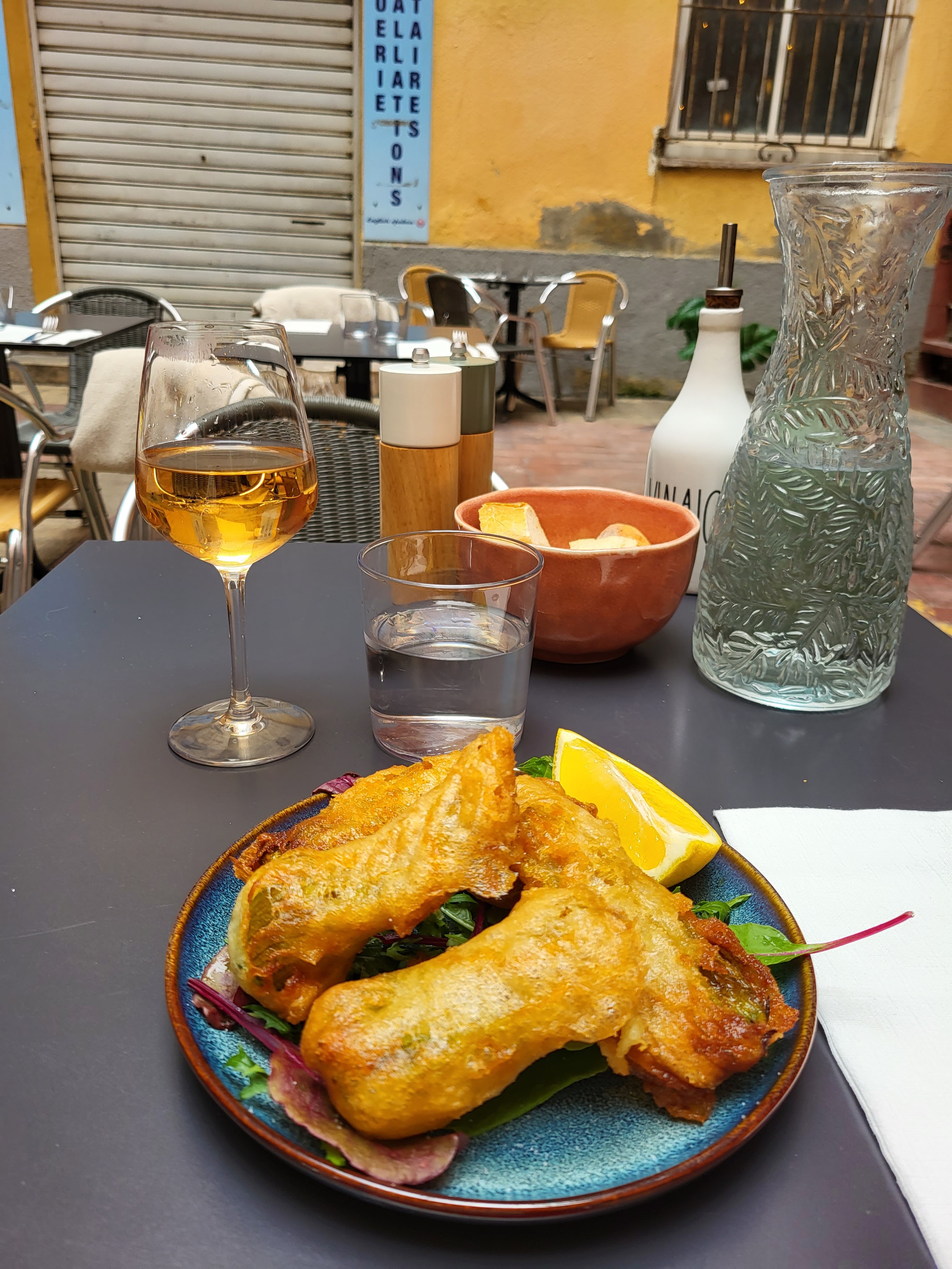Beignets de fleurs de courgette bons mais trop gras (huile qui coule dans la bouche quand on mord dedans), gnocchis baignant dans le beurre et l'huile, assez fades. Personnel sympathique néanmoins.