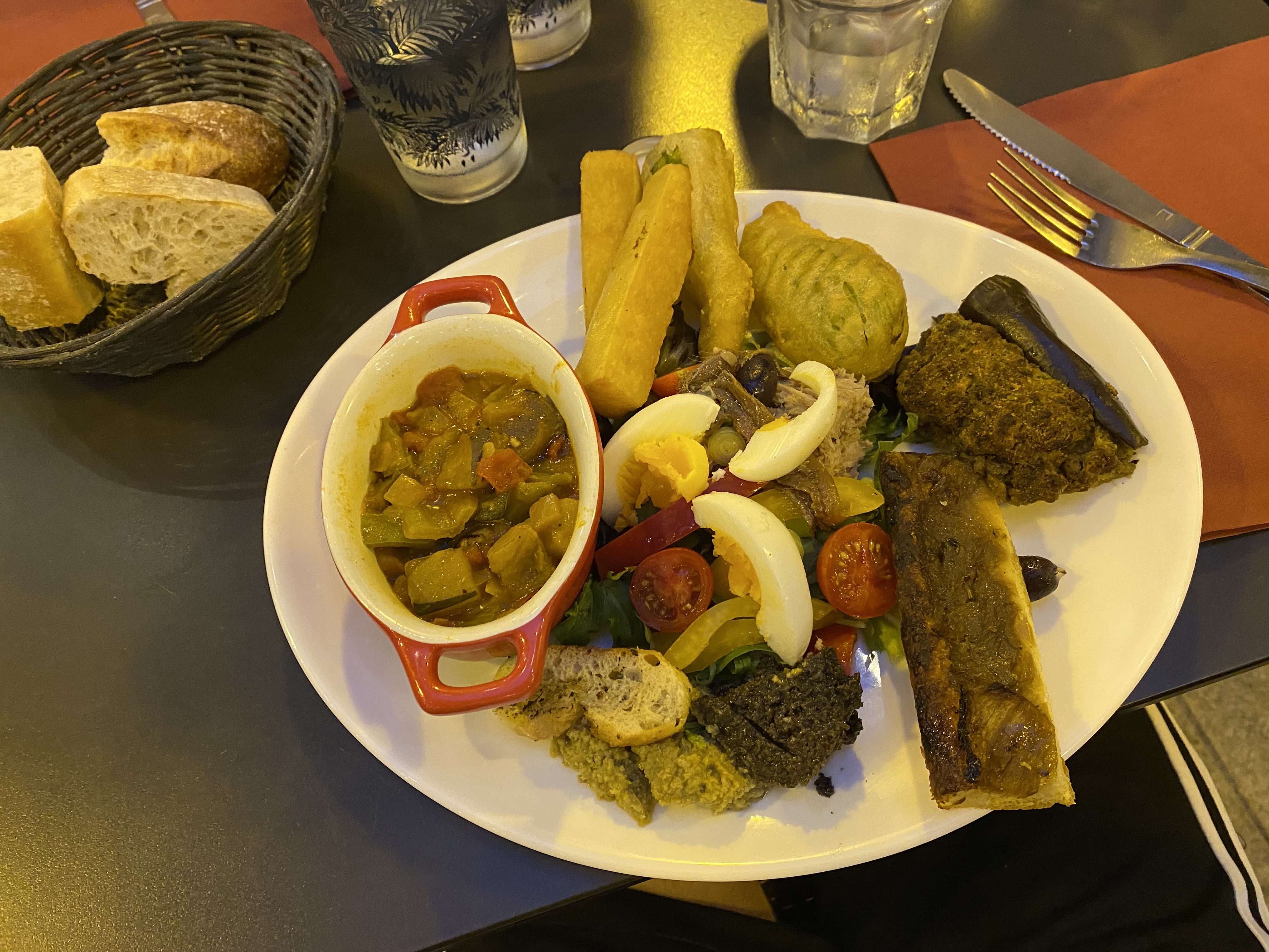 Dans l'ensemble, c'était plutôt sympa. La nourriture a mis du temps à venir mais c'était exactement l'heure du déjeuner et l'endroit était plutôt plein, donc 100% compréhensible. La ratatouille était plus grasse que je ne l'aurais souhaité mais à part ça, tout allait bien. Le reste de la nourriture était également très bon. J'ai aussi pris un thé, je l'ai choisi au hasard, donc je n'ai aucune idée de quel thé il s'agissait car je comprends très peu le français, mais le thé était divinement bon.