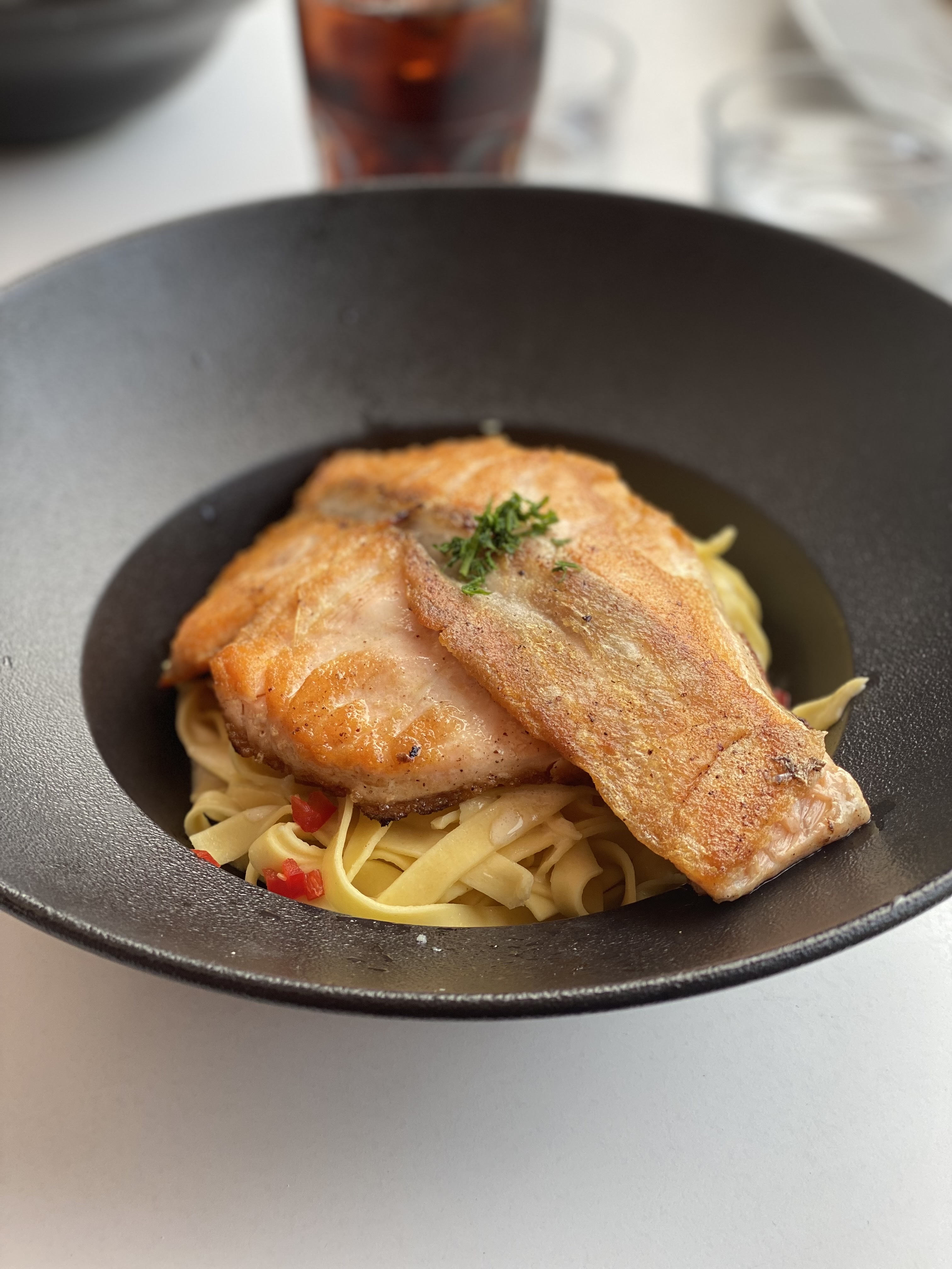 Nos deux serveurs étaient très serviables et sympathiques. Les plats étaient copieux et de bonne qualité. Les sardines grillées, le saumon aux pâtes fraîches et le tiramisu en dessert étaient délicieux. Superbe endroit où déjeuner après une belle matinée à la plage !