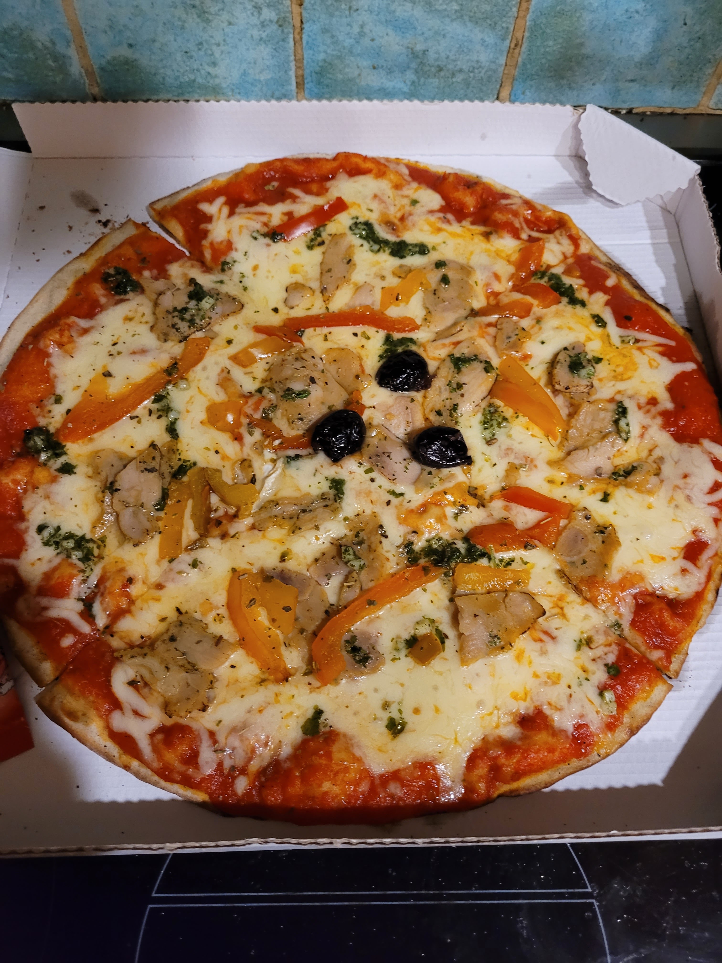 (Repas en vente emporté)Pizza bien garnis. Voir même un peu trop ça devient vite écœurant. La pâte de la pizza est plus que moyenne (mole). Bref cela passe mais c est pas extraordinaire par rapport au prix.