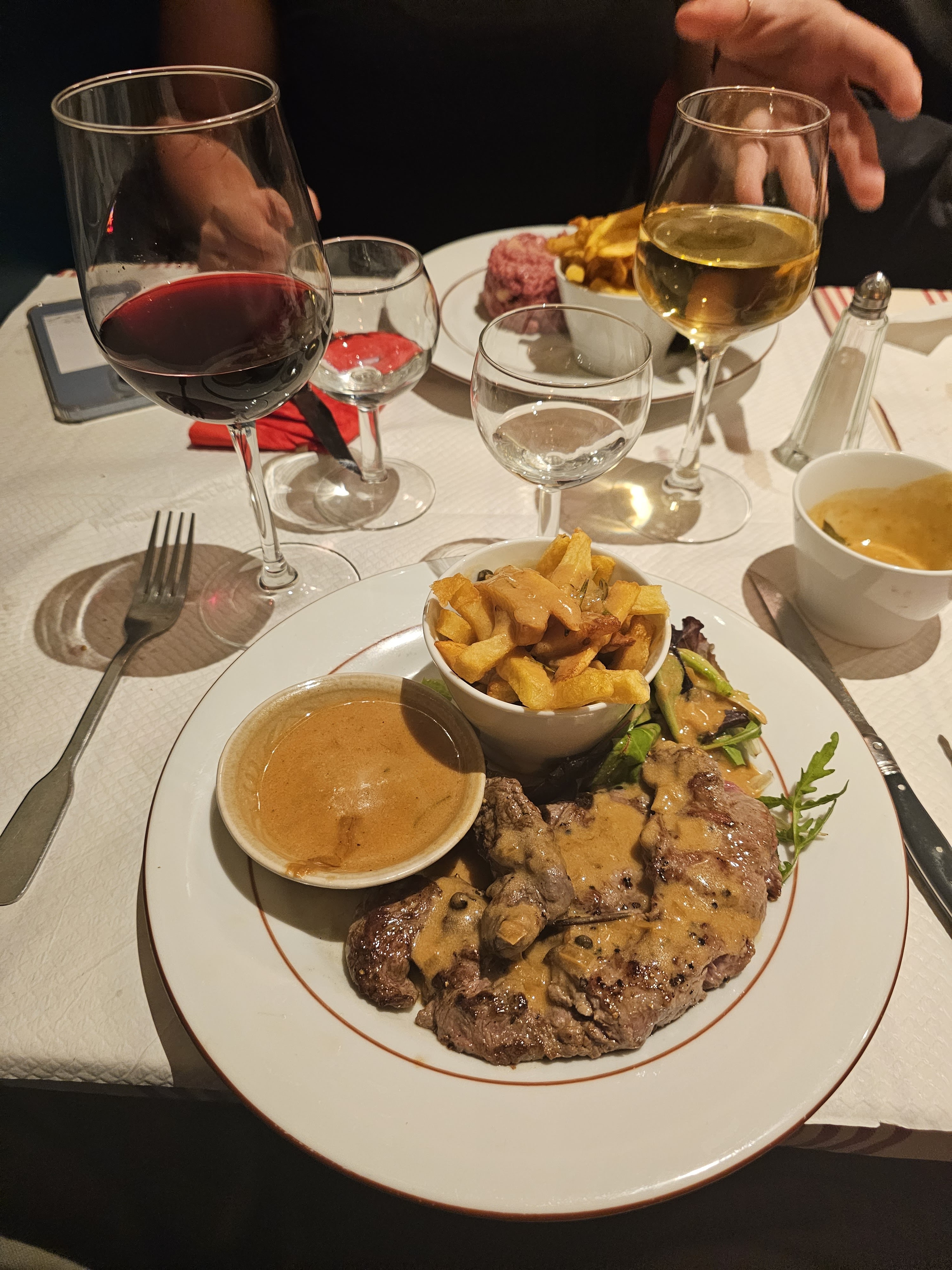 Super endroit français confortable avec une ambiance familiale locale. Obtenez les steak frites juste pour la sauce, OMG c'était tellement bon. Je n'avais jamais su ce que pouvait être une sauce à steak jusqu'à présent. Je pensais que la coupe latérale était généreuse au début, mais j'en souhaitais plus à la fin en y trempant mes frites. Le repas des enfants coûtait 10 € et comprenait un mocktail, une galette de burger avec des frites et un dessert. Mon fils a eu la glace à la pêche, la saveur de pêche était hors de ce monde, elle avait le goût, le goût et la jutosité d'une pêche d'été. Nous avons également fait le gâteau au rhum sur de la crème vanille, wowza, un gagnant c'est sûr.