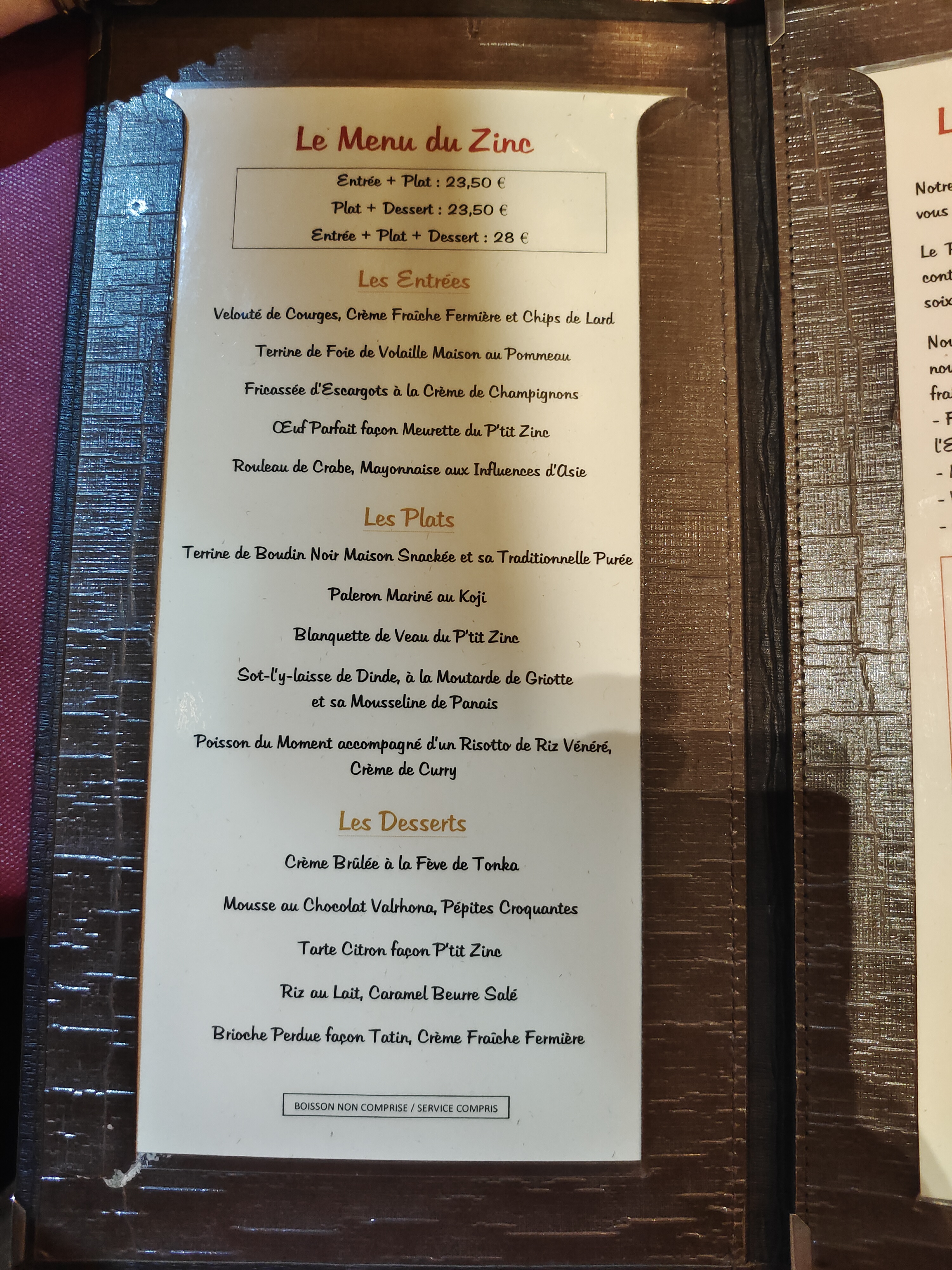 Belle soirée au Petit Zinc. Accueil agréable bien que nous soyons arrivés en plein feu sans avoir réservé un samedi soir. Plat de tête de veau revisitée avec succès. Le vin rouge servi à la bonne température... il nous a même proposé de le décanter alors qu'ils avaient beaucoup de clients. Merci et bravo.
