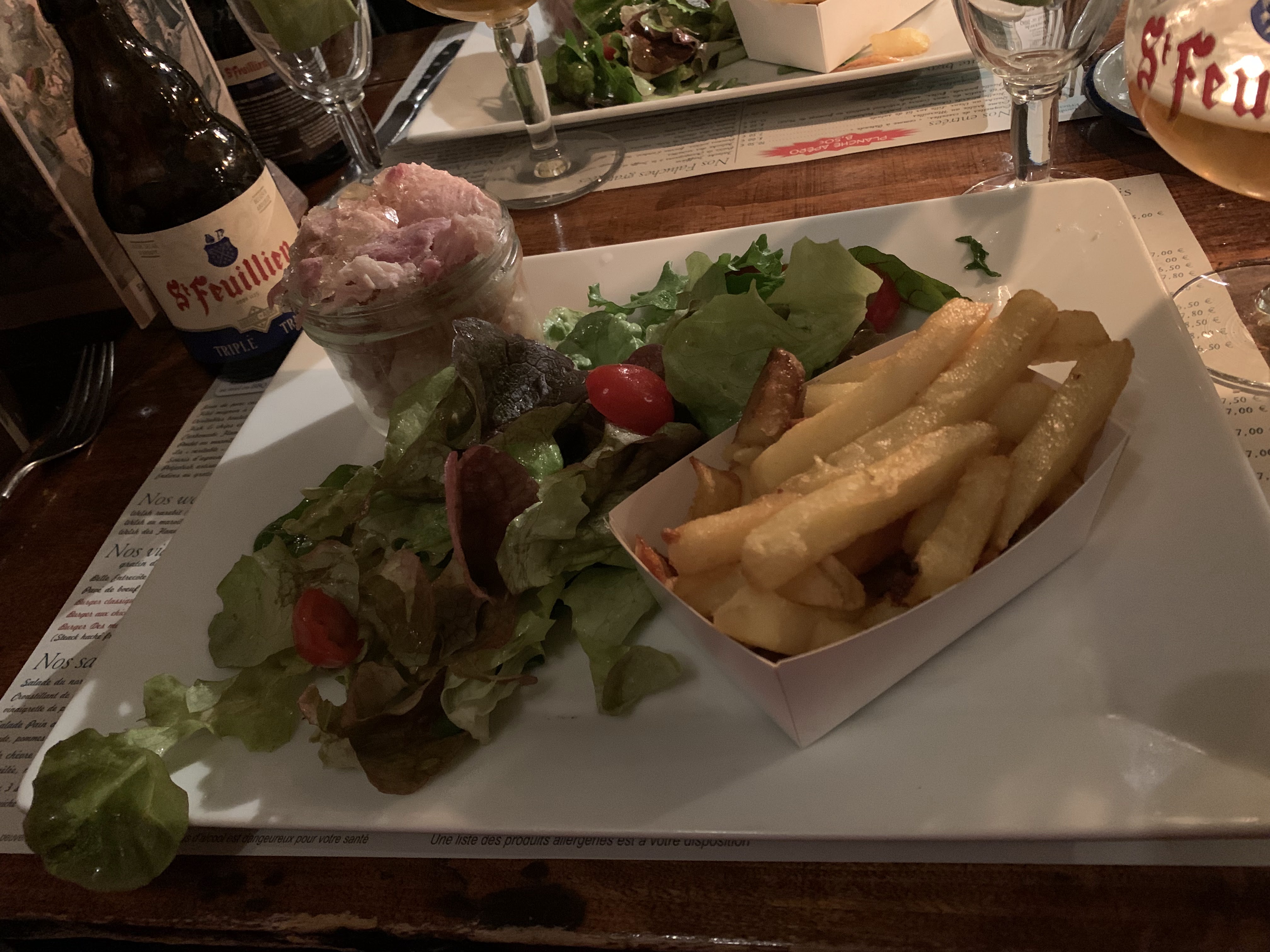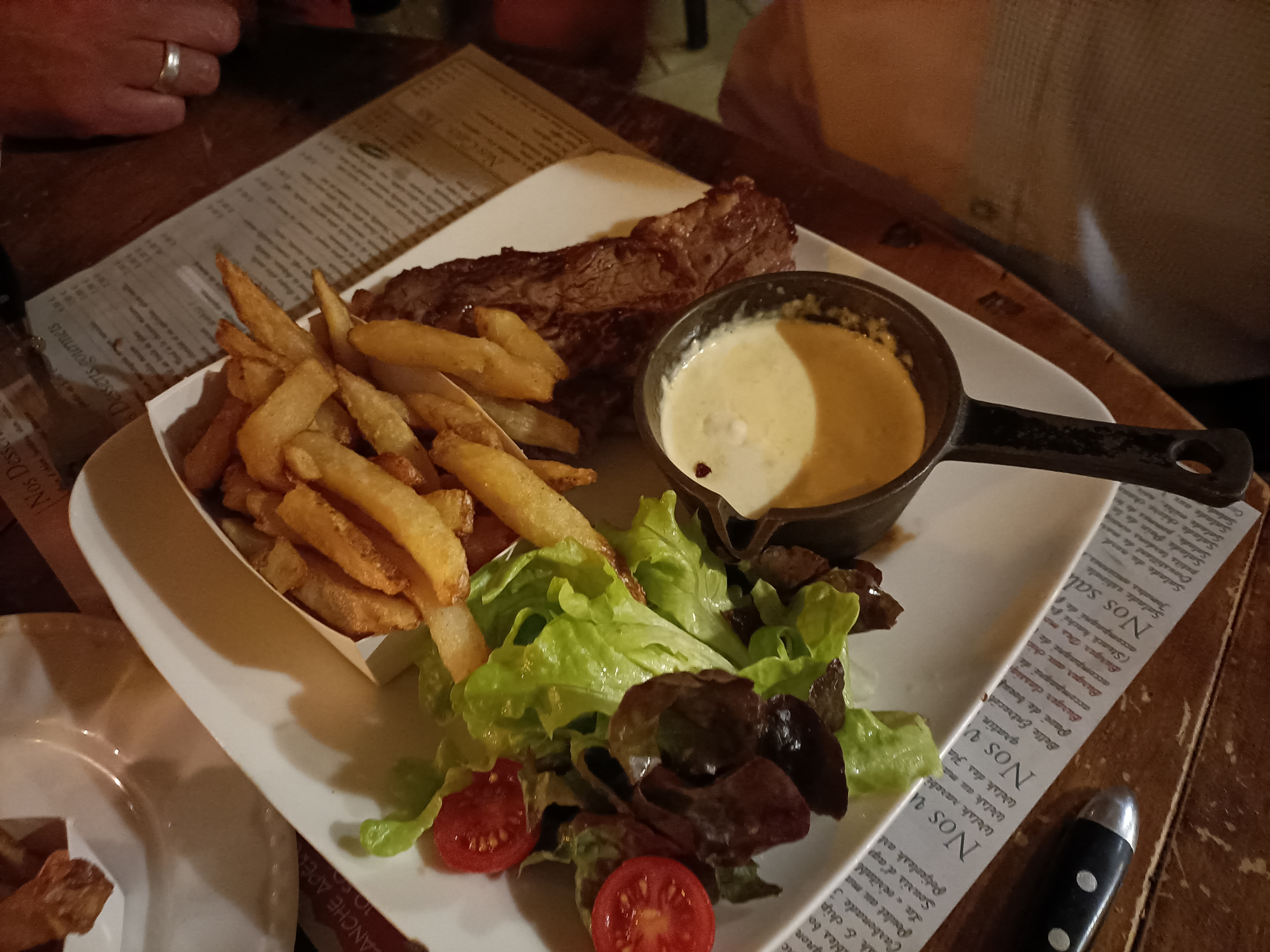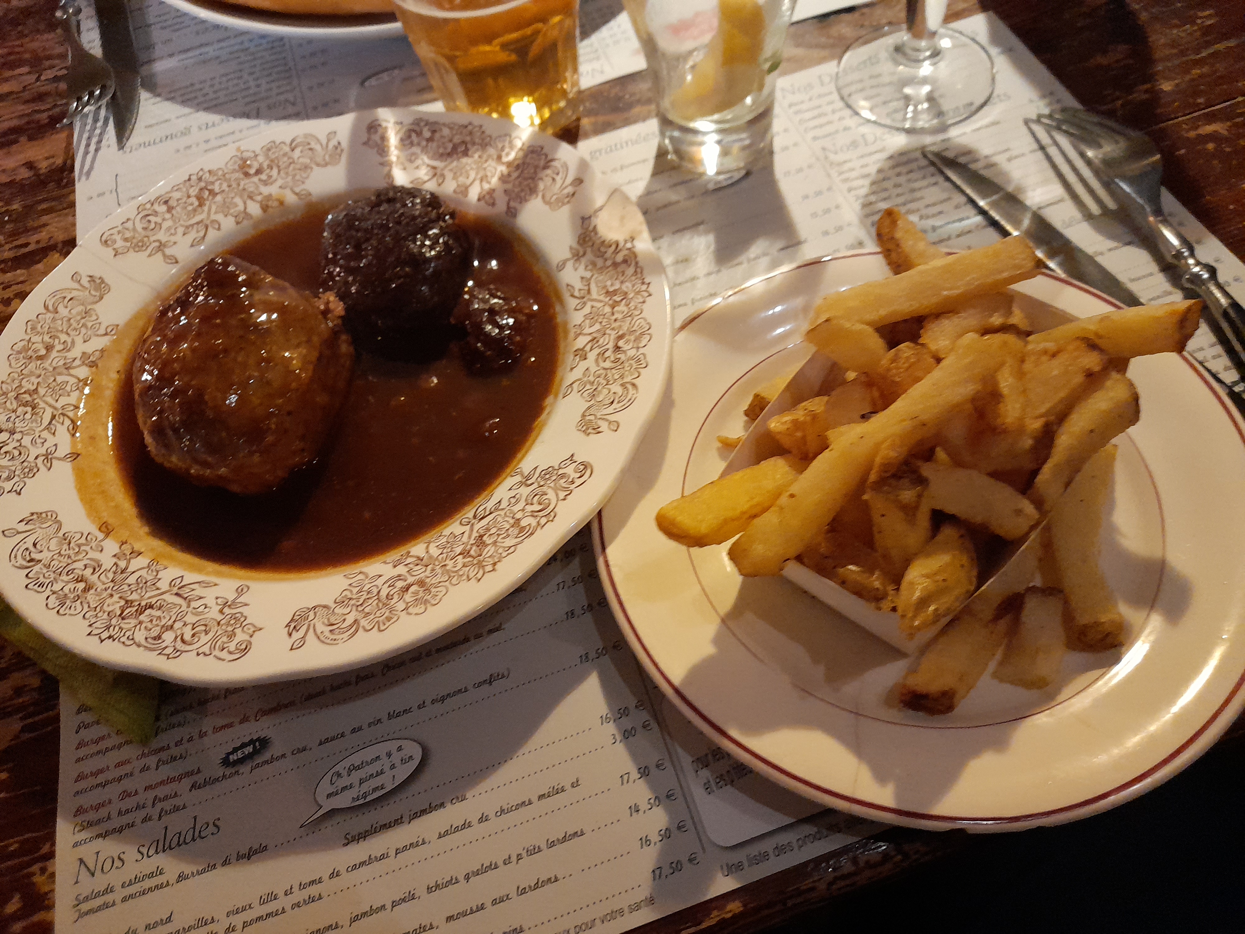 Nous avons très bien mangé, c'est très bon. Seulement les portions de frites ne sont pas très copieuses, nous avons eu une mini carafe d'eau pour 4 (1/4 de verre chacun pour tout le repas) et de toutes petites tasses de café à la fin du repas. C'est un peu regrettable pour le prix mais vraiment nous nous sommes régalés et l'ambiance cosy du restaurant est très agréable.