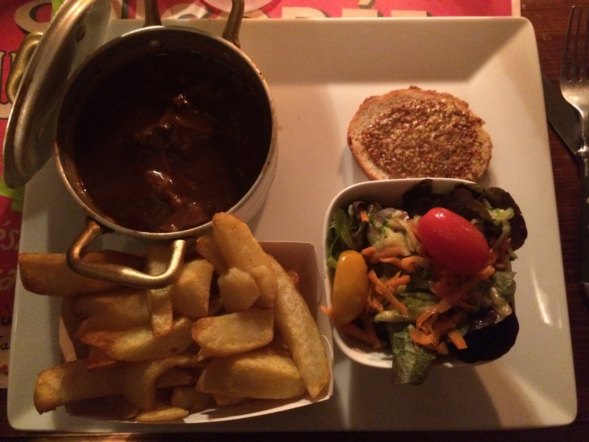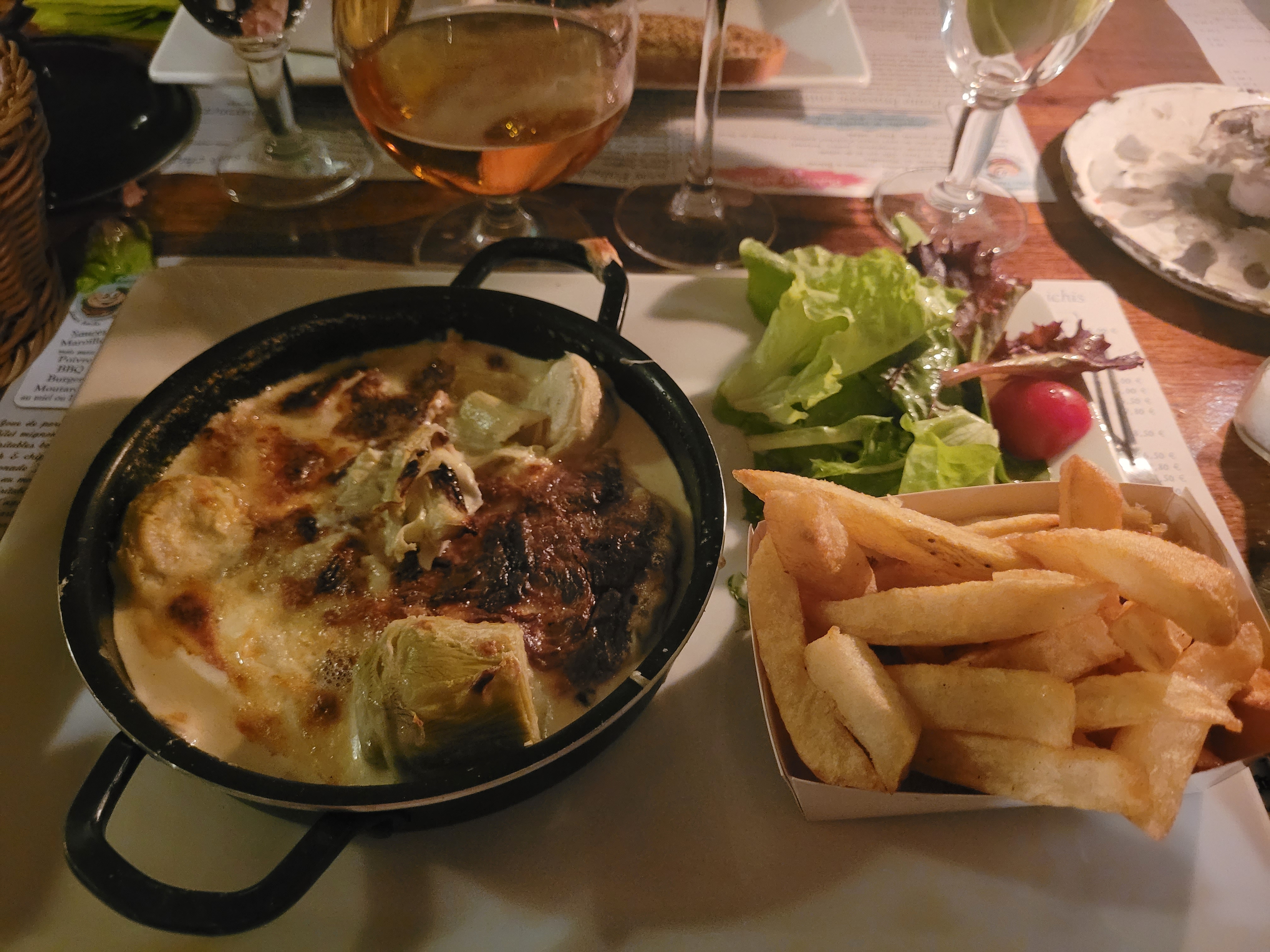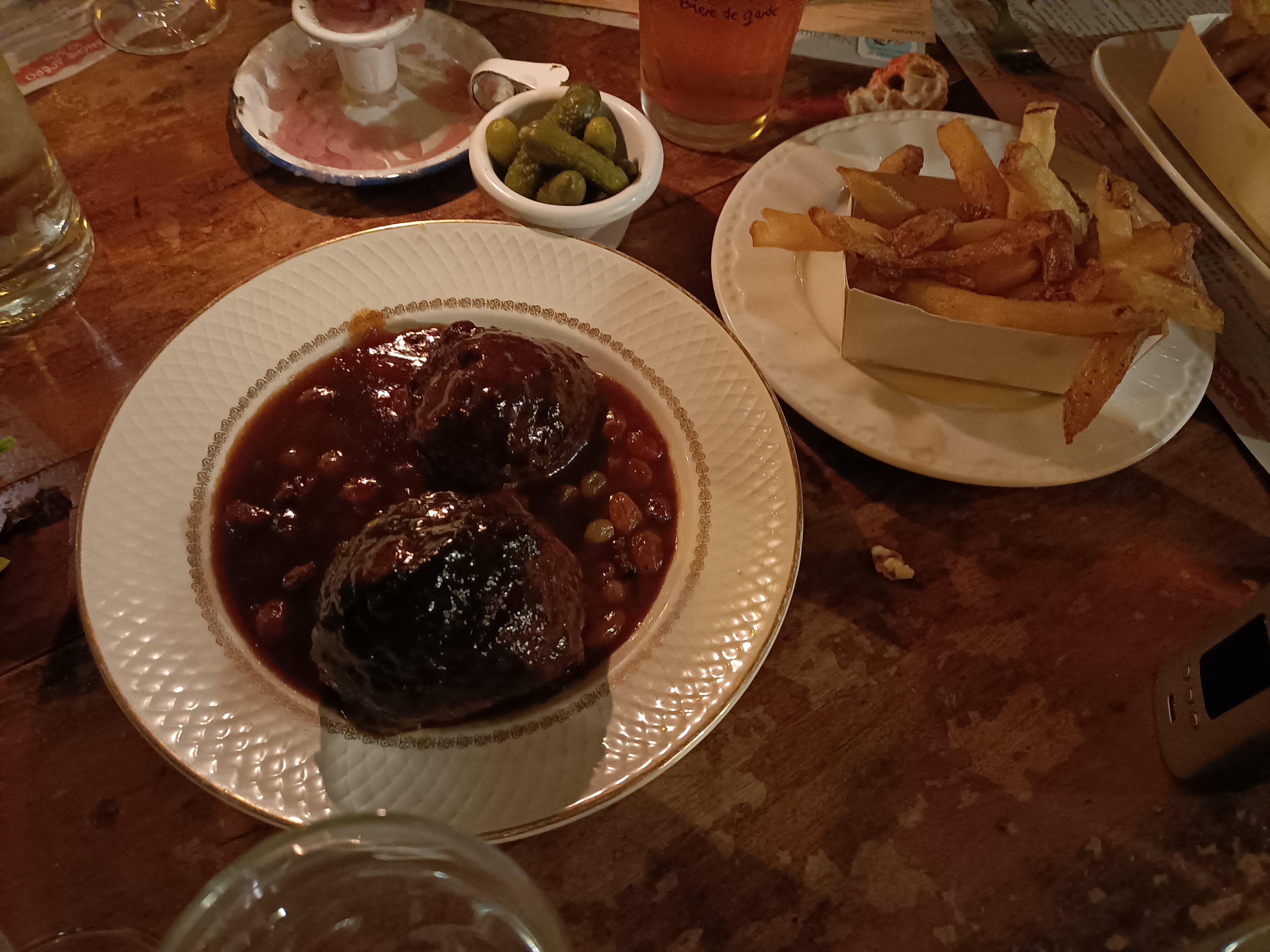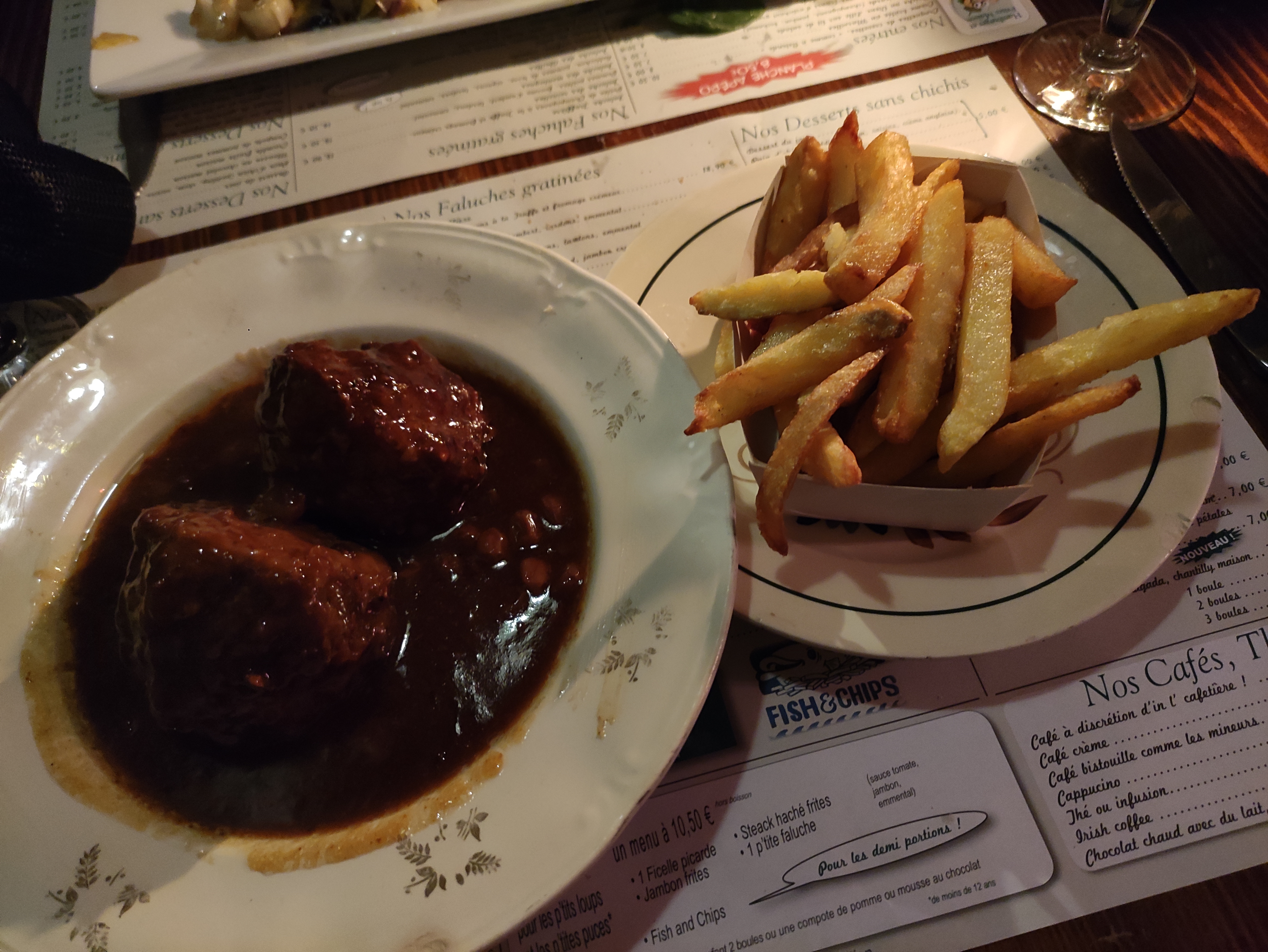 Nous avons très bien mangé, c'est très bon. Seulement les portions de frites ne sont pas très copieuses, nous avons eu une mini carafe d'eau pour 4 (1/4 de verre chacun pour tout le repas) et de toutes petites tasses de café à la fin du repas. C'est un peu regrettable pour le prix mais vraiment nous nous sommes régalés et l'ambiance cosy du restaurant est très agréable.