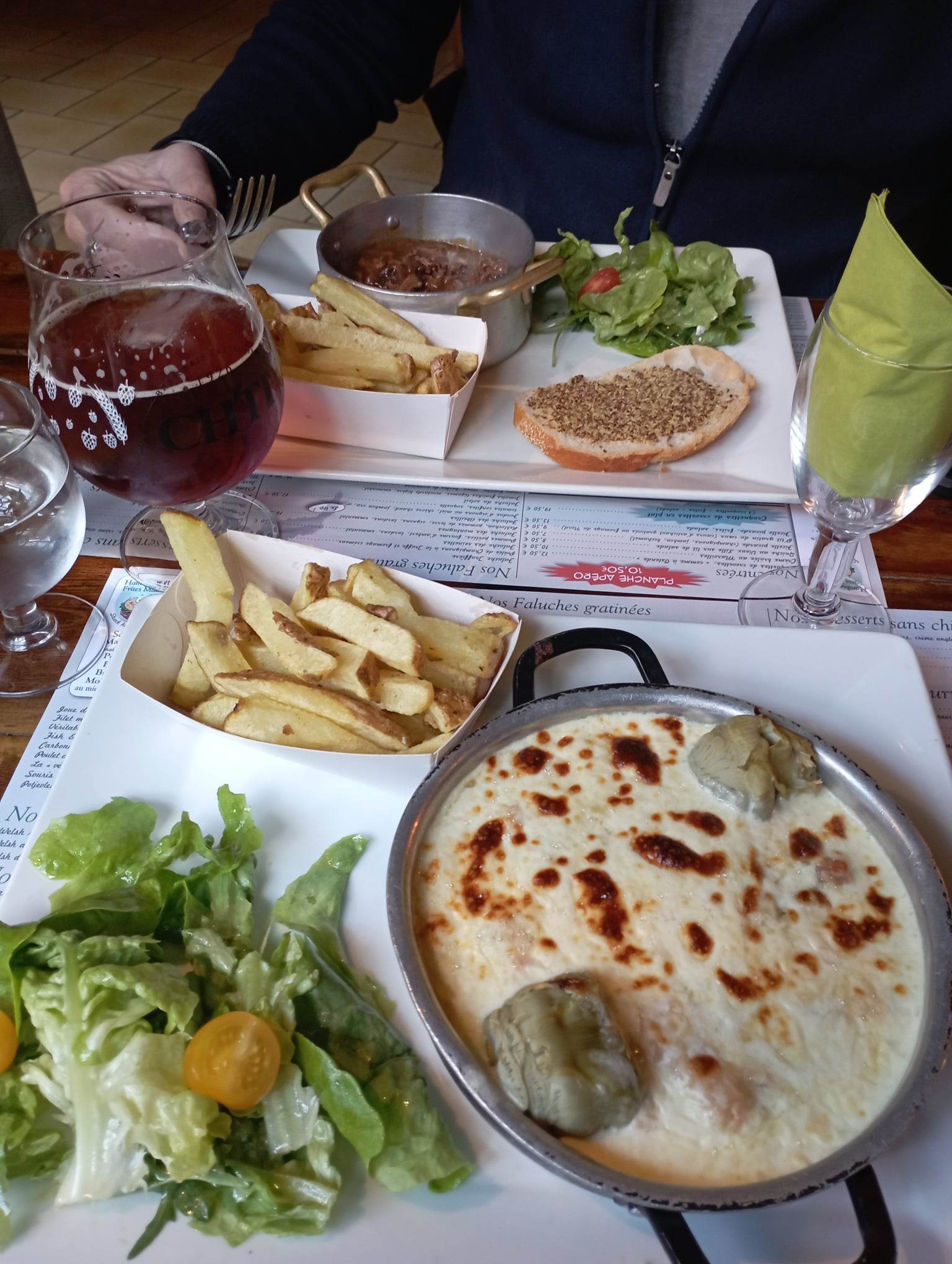 Découverte du restaurant, planche apéritive limite petit pot de rillettes sevie avec des morceaux de baguette grillée (attention à vos dents!!!) Bâtonnets de fromage, 3 saucissons. Pour le plat j'ai pris une faluche super salée, bref un peu cher pour une faluche, j'admets que le cadre est sympa
