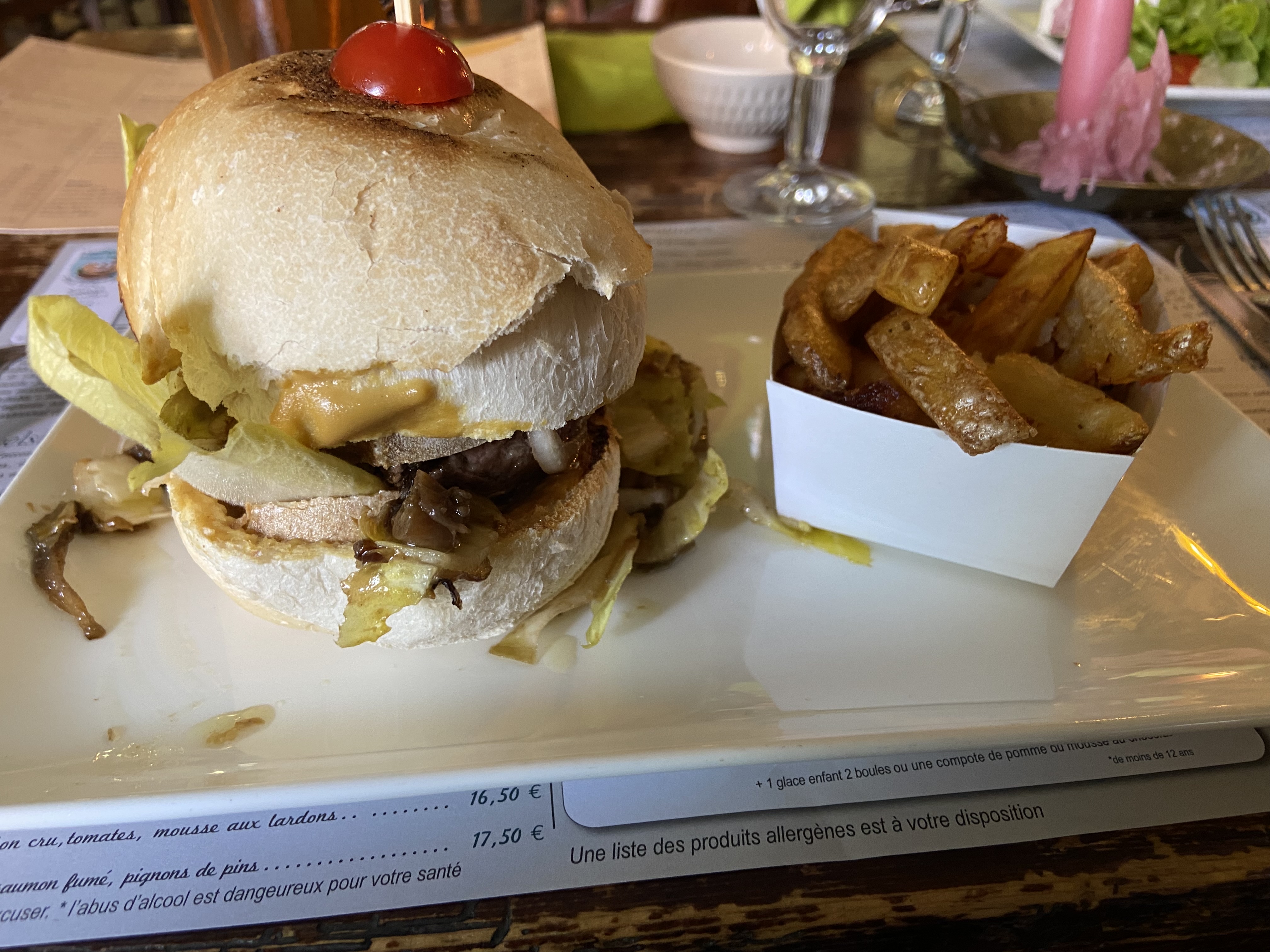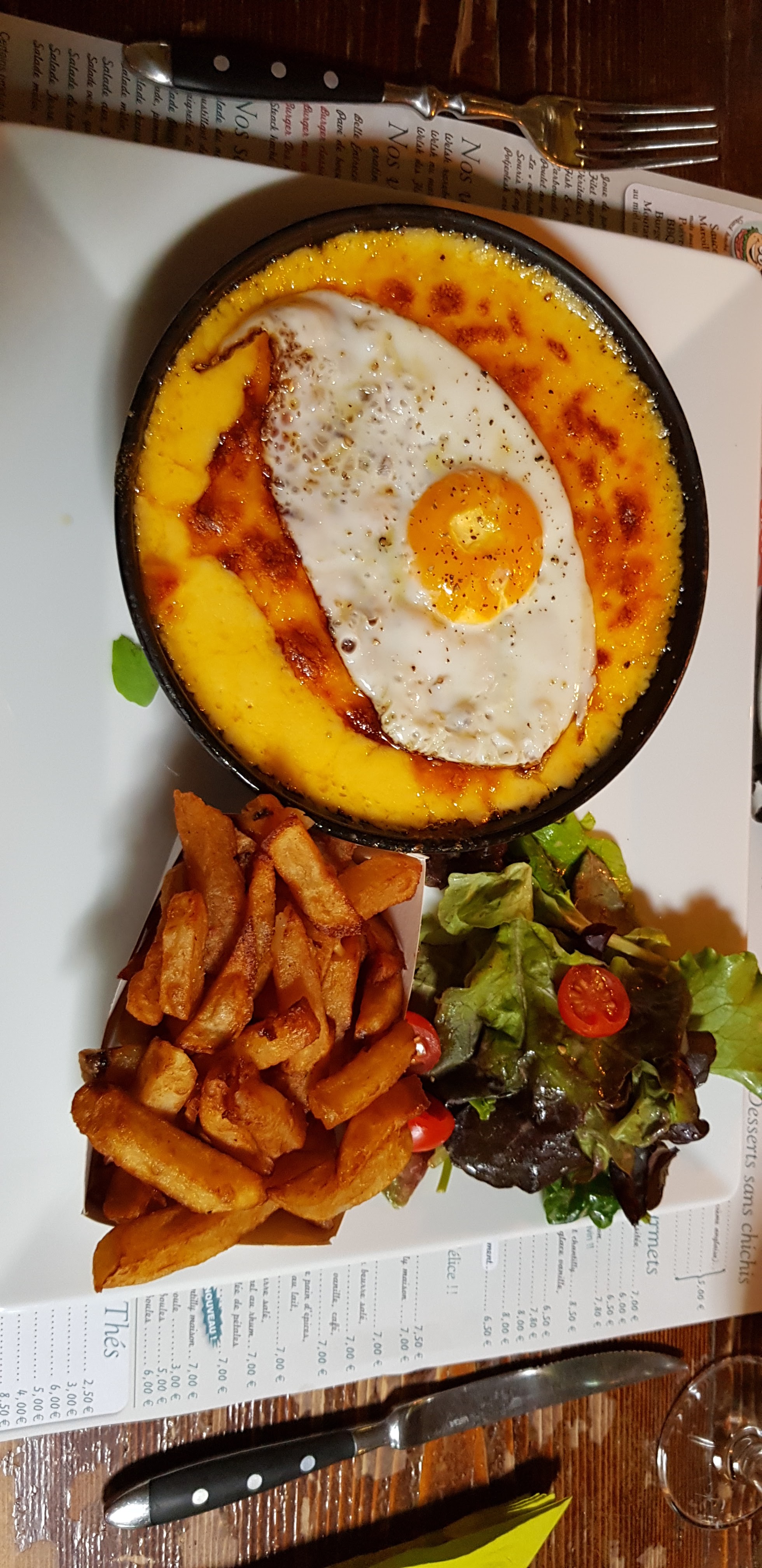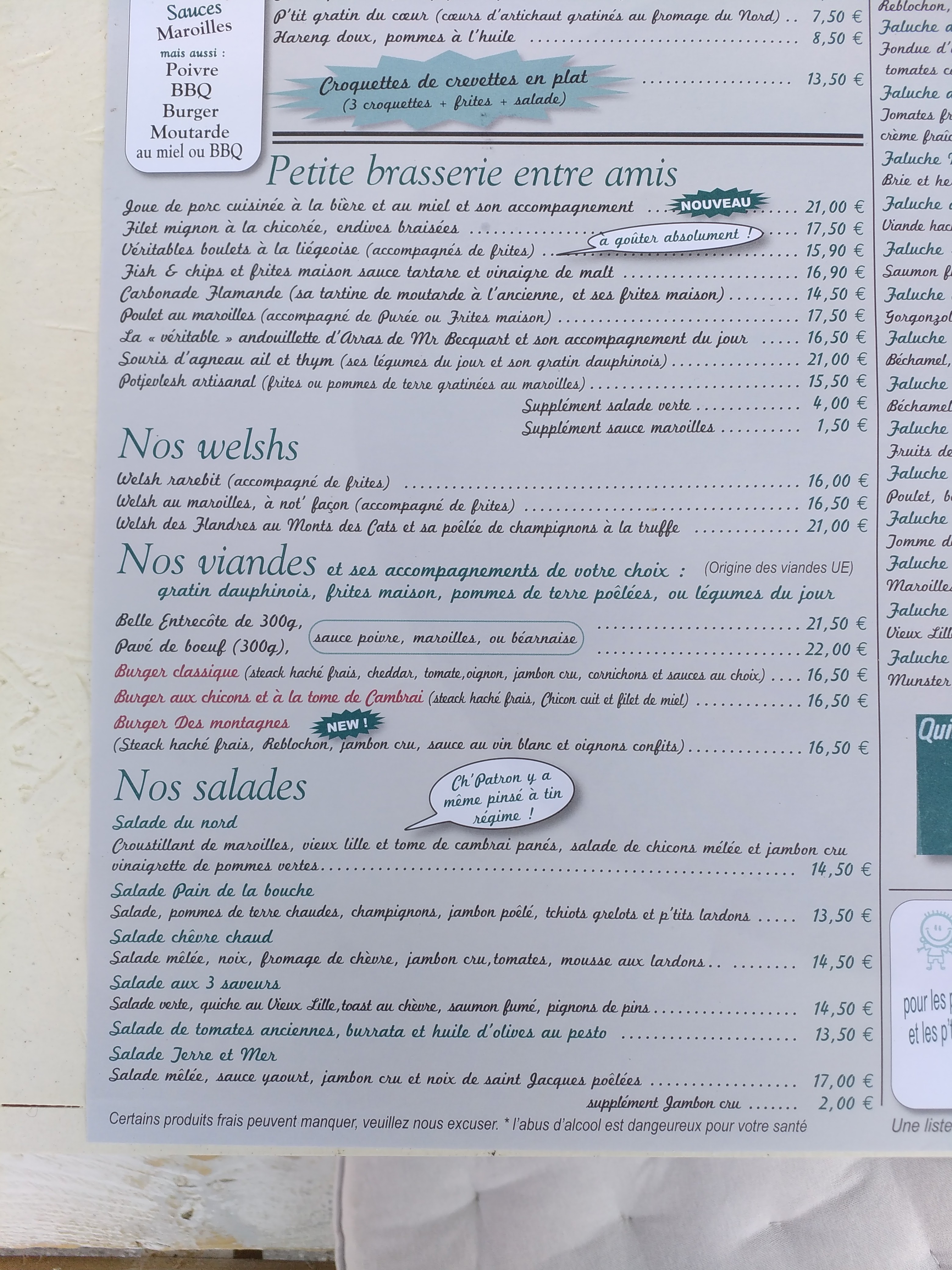 Très bonne table, jolie décoration. Pas de menus mais à la carte. Plats, entrée et desserts du Nord. Seul bémol qui aurait donné 5 * : pas assez de frites et supplément payant. Sauce Maroilles de fou presque en plus grande quantité que les frites 😉