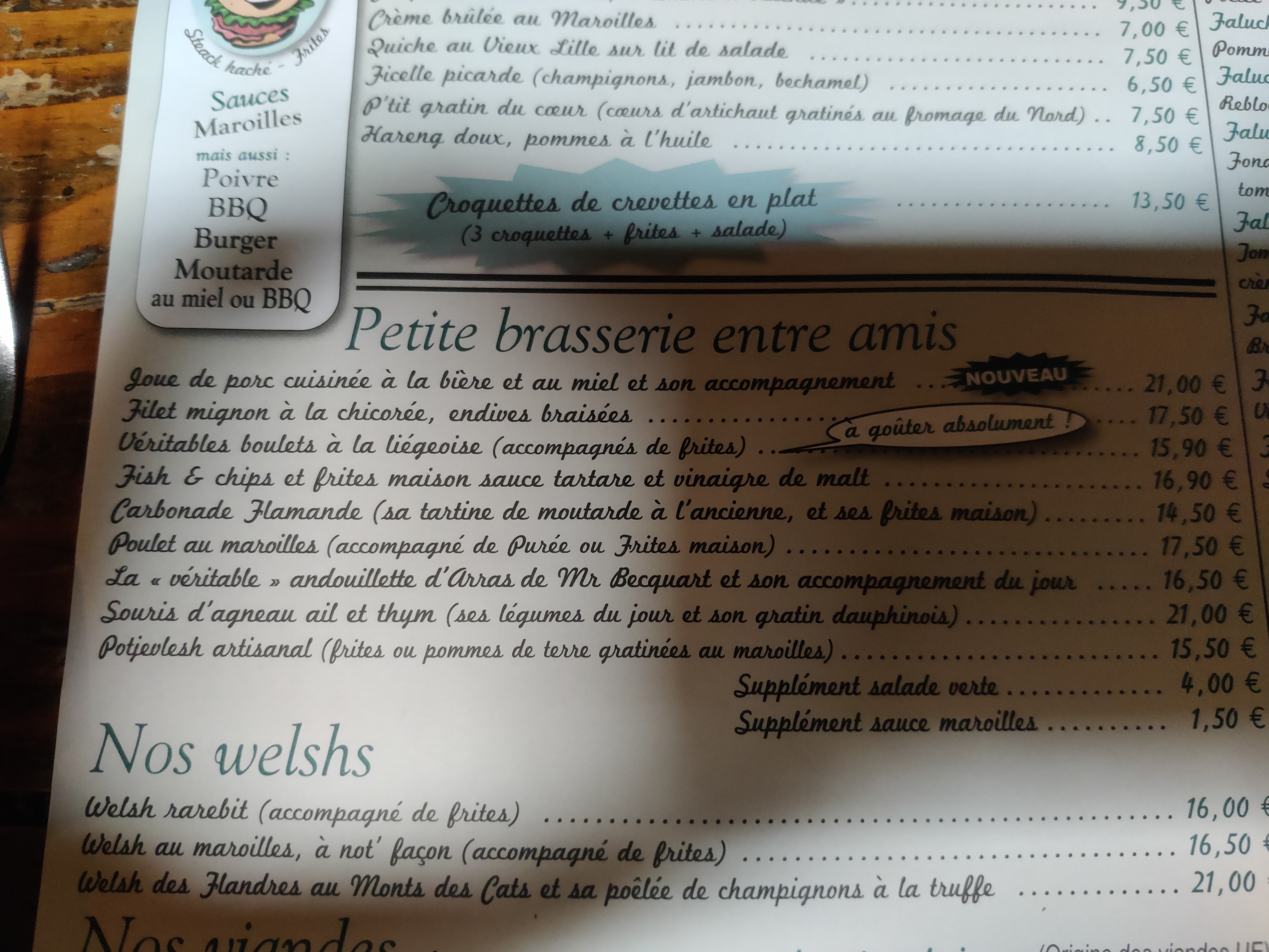 Excellent repas : joue de porc au miel, endives avec de vraies frites maison et un bon baba au rhum en dessert où l'on met soi-même la dose de rhum préparé. Petit conseil : le café, en fin de repas, est servi à l'ancienne (je n'en dis pas plus). Grand choix de bières dont de bonnes pressions ; aussi au choix une vingtaine de faluches gratinées (je n'ai pas goûté mais ça avait l'air trop bon) ; déco soignée et service au top (dynamique et toujours un petit mot sympa pour la clientèle). Les prix sont peut être un peu élevés mais la qualité et la quantité sont bien là donc les prix peuvent se justifier.
