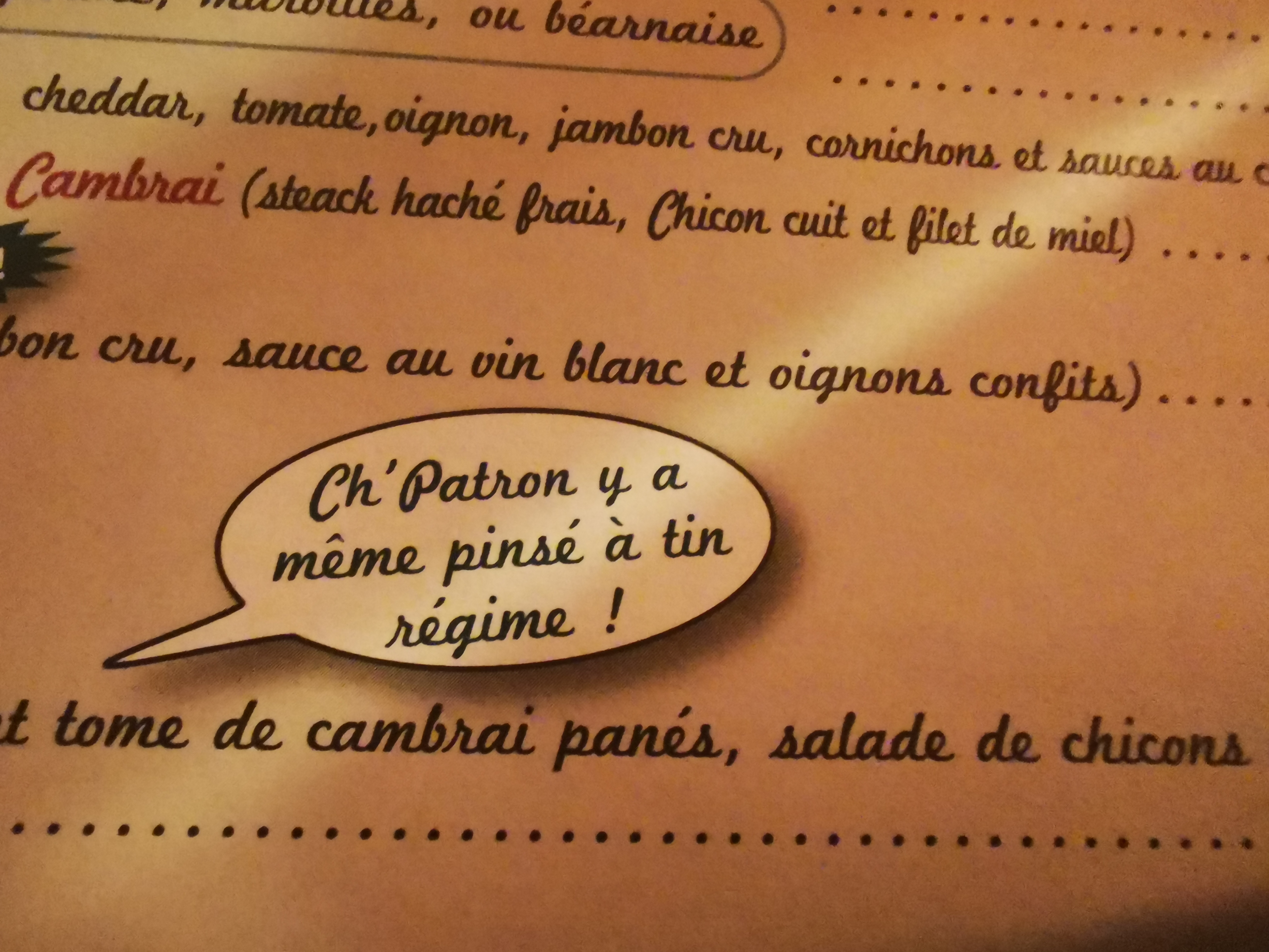 Un moment de partage avec de la famille bretonne. Ils ont été charmés. Pour nous qui sommes de la région, nous avons retrouvés nos souvenirs de jeunesse de nos parents ou grands parents et même certains meubles ou vaisselles.....Cuisine familiale et ambiance conviviale. On discute même avec les tables voisines !!!!! C'est ça les vrais personnes chti's... On recommande à 100 % Attention, les plats sont copieux :) même la salade, alors pas de régime ce jour là !!!