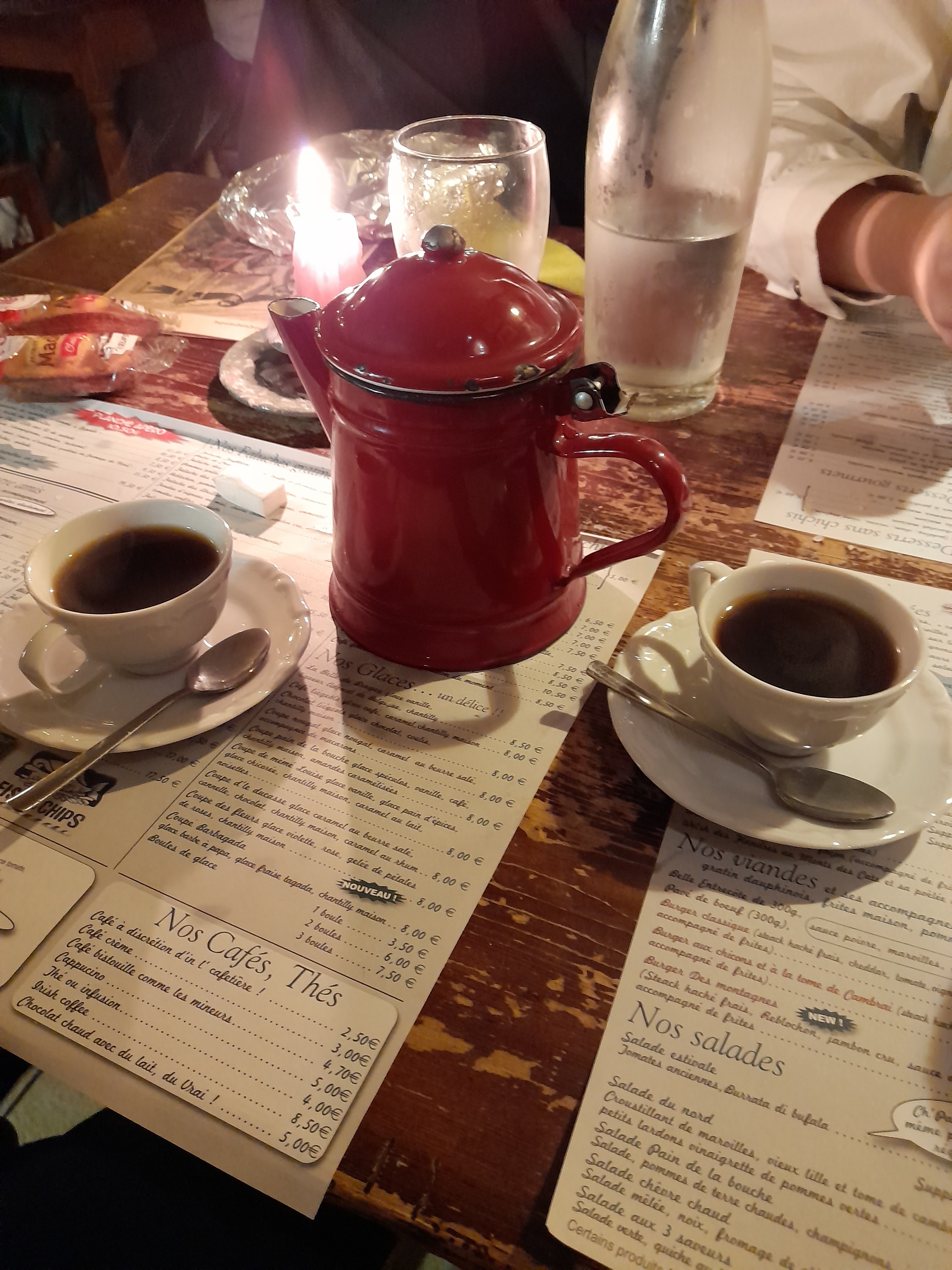 Générosité de tout le personnel en salle, souriant et chaleureux accueil. A signaler car cela réchauffe le cœur. Les plats sont régionaux et faits maison comme le gratin dauphinois ou les frites à l'ancienne. Entrecôte 300g bleue (26 €) : cuisson parfaite avec sauce au maroilles pas trop forte, 3 croquettes de crevettes grises comme à Ostende: panure pas trop épaisse, bon goût de pommes de terre et crevettes ( 19,50€). Café servi en cafetière à table, bien agréable. Nous avons été séduits par le charme de cette maison au mobilier du passé, avec encore l'ancien poêle cuisinière et tous les objets d'antan ... bougies partout créant une ambiance très chaude. Dans cette ville de Lens qui souffre tant socio-économiquement, ce restaurant est le symbole d'un esprit positif et entreprenant.