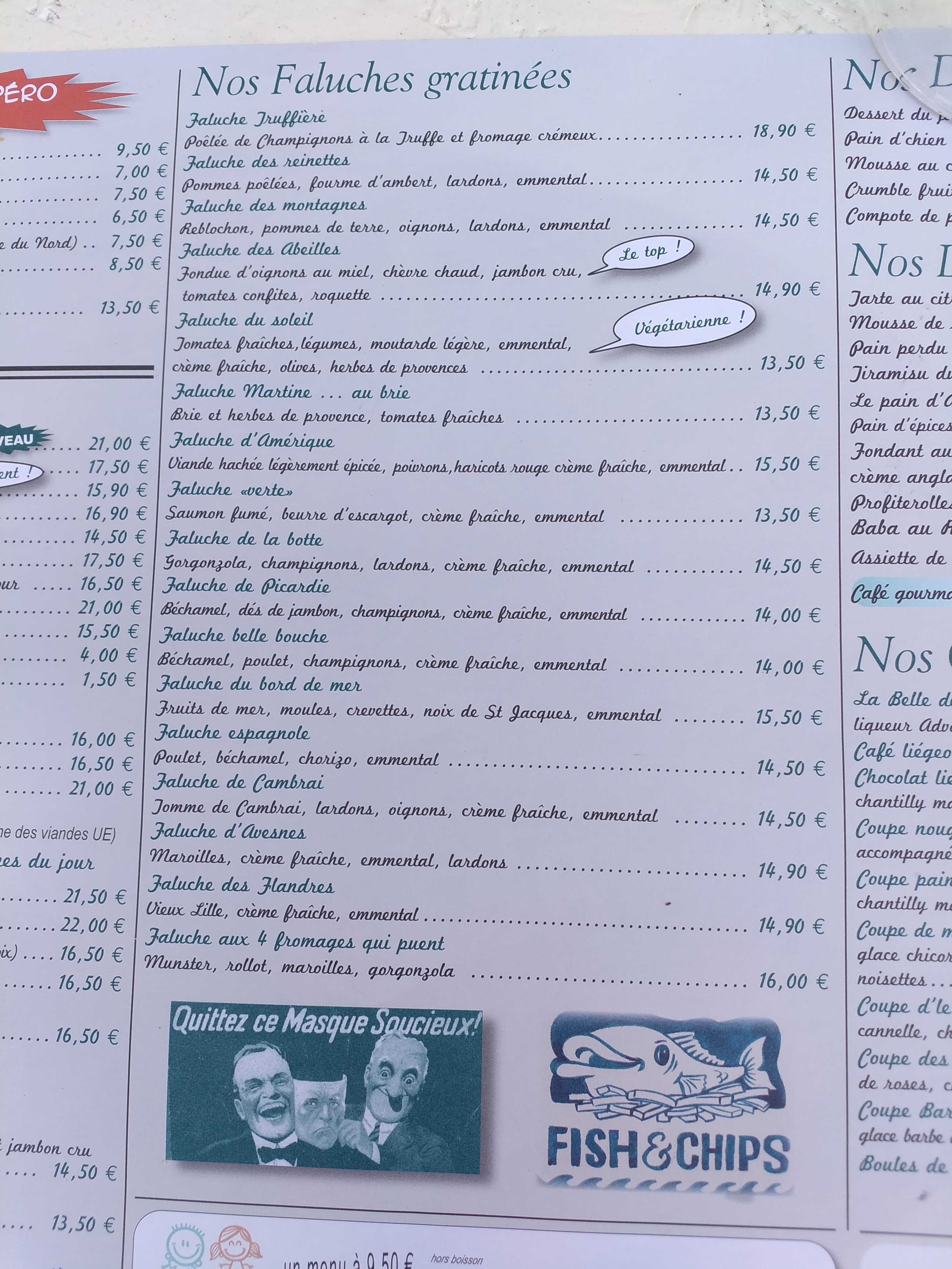 Un restaurant comme on les aime avec une identité, une ambiance d'autrefois, de tradition ! Exactement ce qu'on peu attendre d'un restaurant ici. Des spécialités du nord, la spécialité de la maison : les faluches, des plats plus traditionnel mais toujours avec une petite touche du nord ! On s'est tout simplement régalés. Nous y avons mangé le soir et c'était tellement bon que nous avons réservé pour le lendemain midi. Beaucoup de plats donnent envie et ce serait dommage de ne pas en tester plusieurs. Les prix sont dans les standards, entre 13 et 20 euros approximativement. On s'en tire à une trentaine d'euros entrée/plat/dessert. Le côté relationnel est au top, très bon service, assez rapide et très amical. Franchement on a passé un super moment. Adresse incontournable pour un passage à Lens, situé tout proche de la gare en plus, c'est vraiment pratique. Pensez à réserver la veille, le restaurant était complet les deux fois où nous y sommes allés.