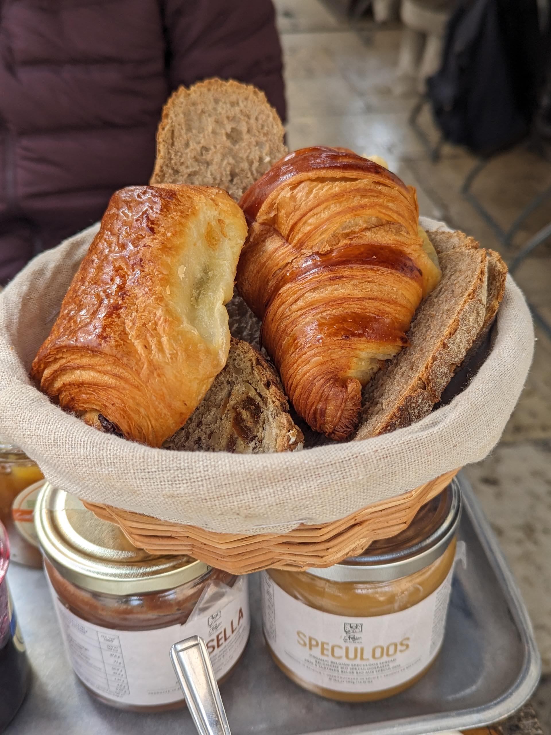 Un dimanche matin, superbe branch å base d'oefs, fromages, croissant salé avec jambon, viennoiseries, pain, confitures, pates à tartiner biologiques et caffé. Ça cale pour la journée, dans une ambiance vivante et avec un service des plus accueillants. Absolument conseillé!