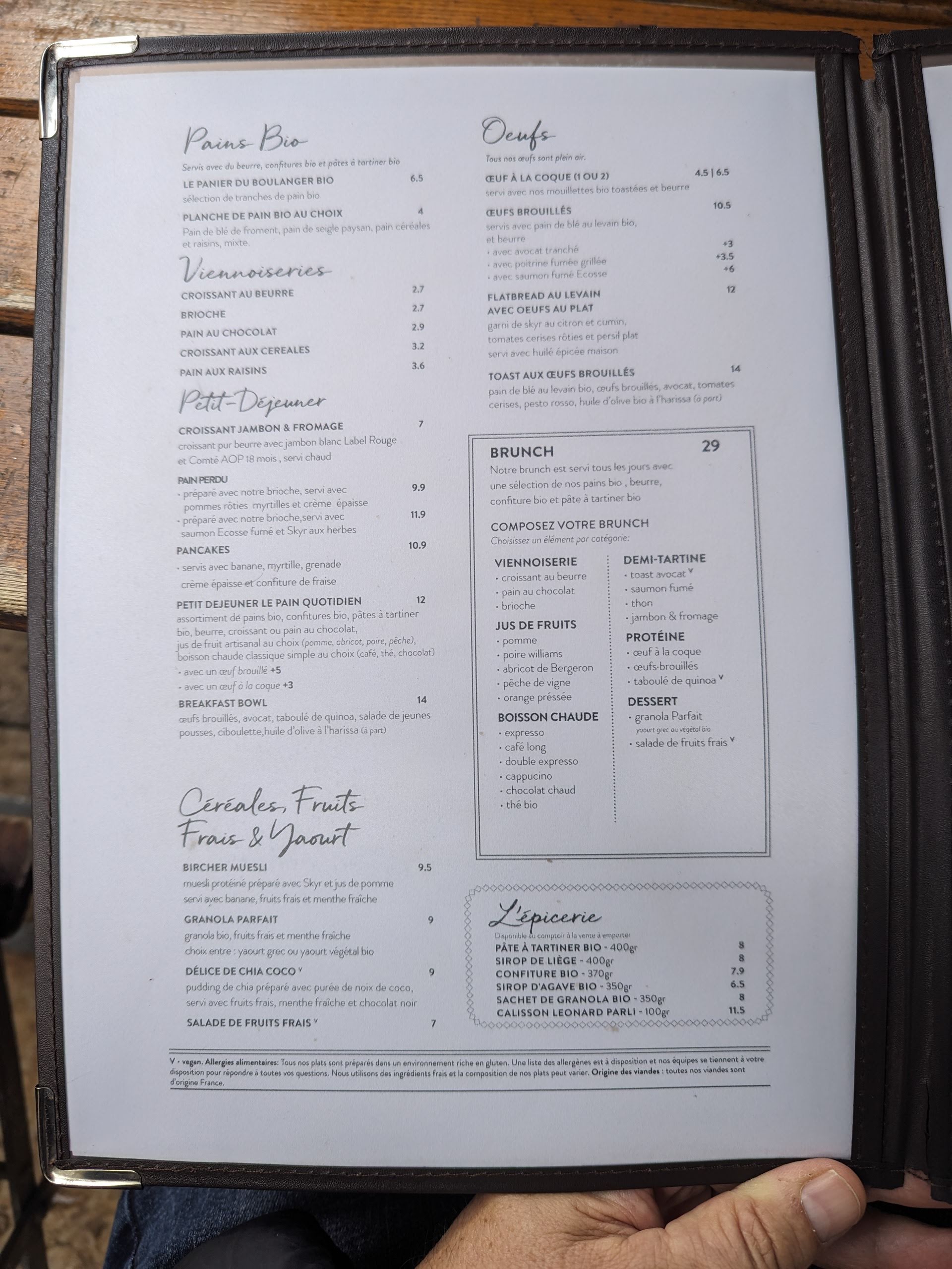 Très bons produits. Le brunch est excellent et très complet (oeuf, différents pains, jus de fruit frais à la minute, un large choix de pâte à tartiner et confiture, une boisson chaude, une assiette salée au choix et j'en passe). Bref, un régal et vraiment copieux. Le prix est assez élevé (compter une vingtaine d'euro environ pour le brunch) mais la qualité est vraiment là.