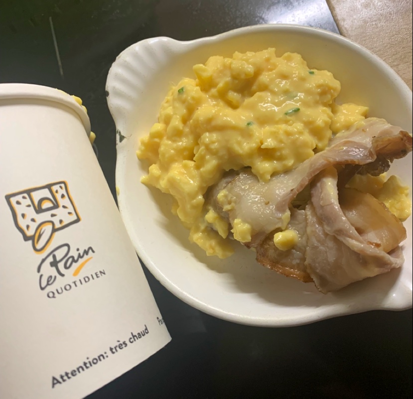 Voici le contenu de ce bol (je ne comprends d’ailleurs pas ce choix de contenant) d’œuf brouillés avec poitrine qui fait 13€. UNE BLAGUE! Arrivé froid de surcroît. (Le “attention très chaud” sur le bol une blague aussi. Pour couronner le tout un pain au chocolat soit disant bio de la veille (froissé et pas frais) en plein samedi matin à 2€30 petit déjeuner raté, argent perdu. 1ere et dernière commande.