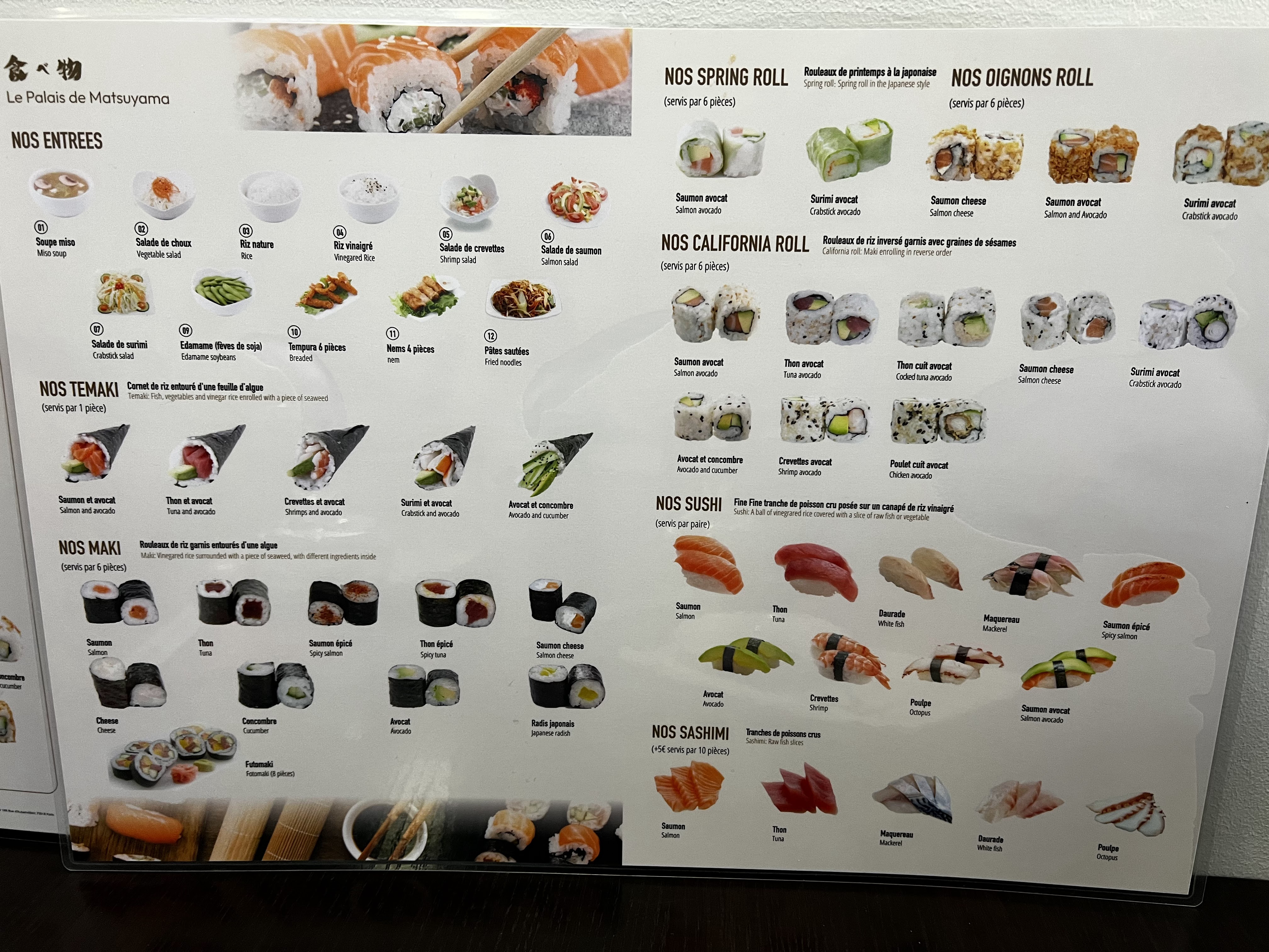 Ayant l'habitude d'aller à Sushi Kyo,une seule chose à dire :rien à voir!!!!Nous n'iront plus au Palais de Matsuyama!!Les sushi très fade sans goût...les serveurs aimable mais la serveuse très désagréable,à la limite mal à l'aise telment elle était désagréable!....payé 69e pour 2 adultes et 2 enfants dans le vide....très déçu!plus jamais...service très long malgré le peu de monde dans le restaurant!nous retourneront à nos habitudes chez Sushy Kyo!