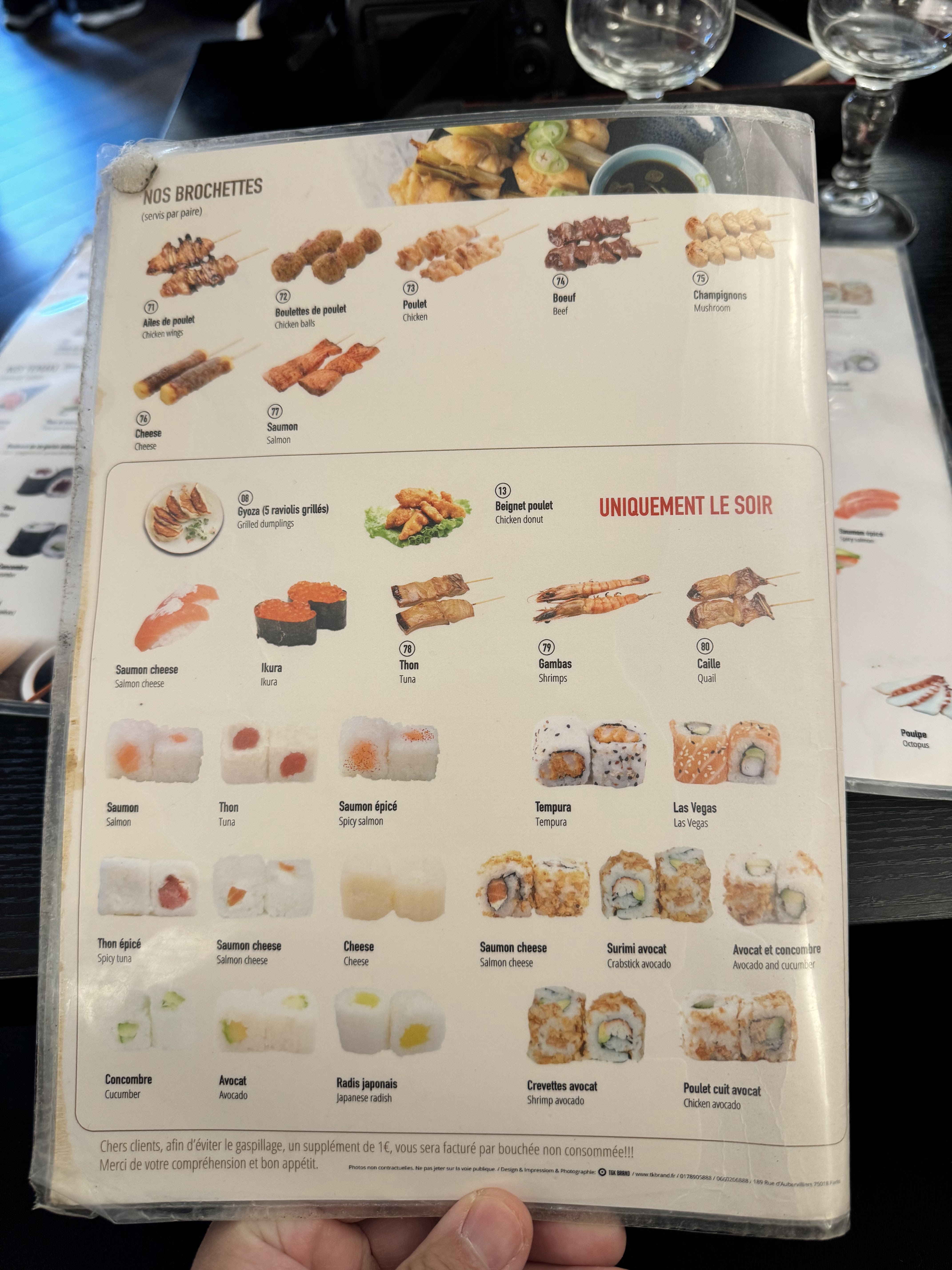 Beaucoup de choix en sushi, mais faites attention au brochette qui ont un gout très fort de fumée pour certaines