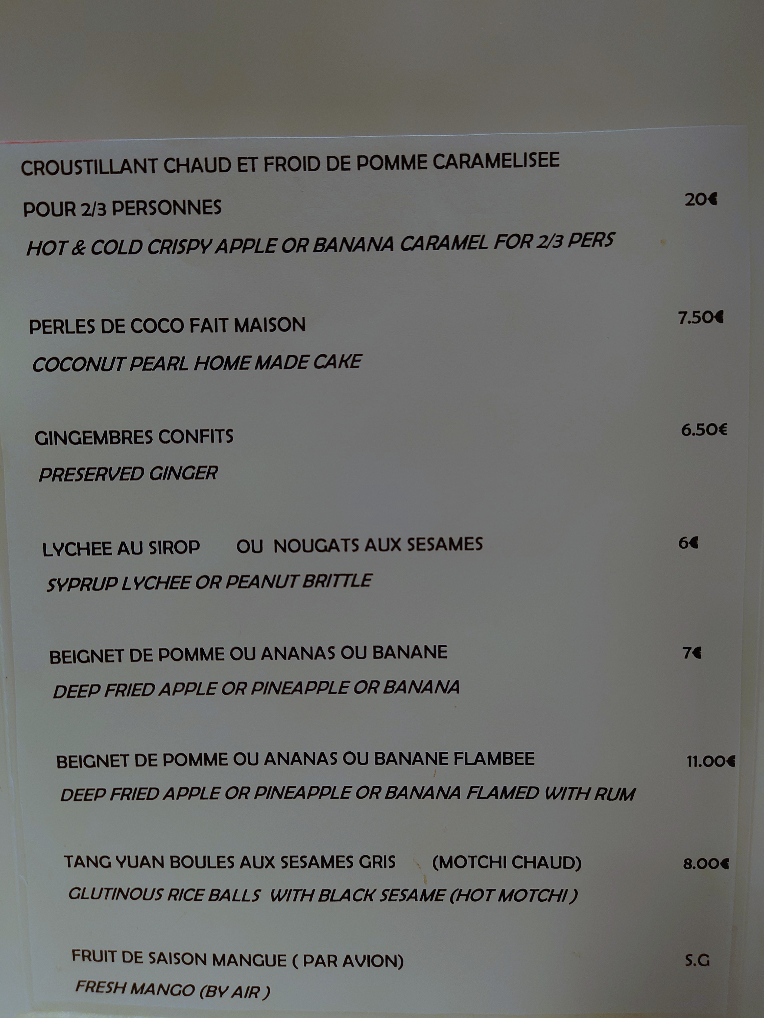 J’hésite toujours à franchir la porte d’un restaurant chinois. Trop de plats réchauffés de chez Tang. Ici tout est fait sur place. Excellente surprise. Un canard laqué magnifique. Le patron est un personnage attachant qui a eu plusieurs vies. N’hésitez pas à discuter avec lui.