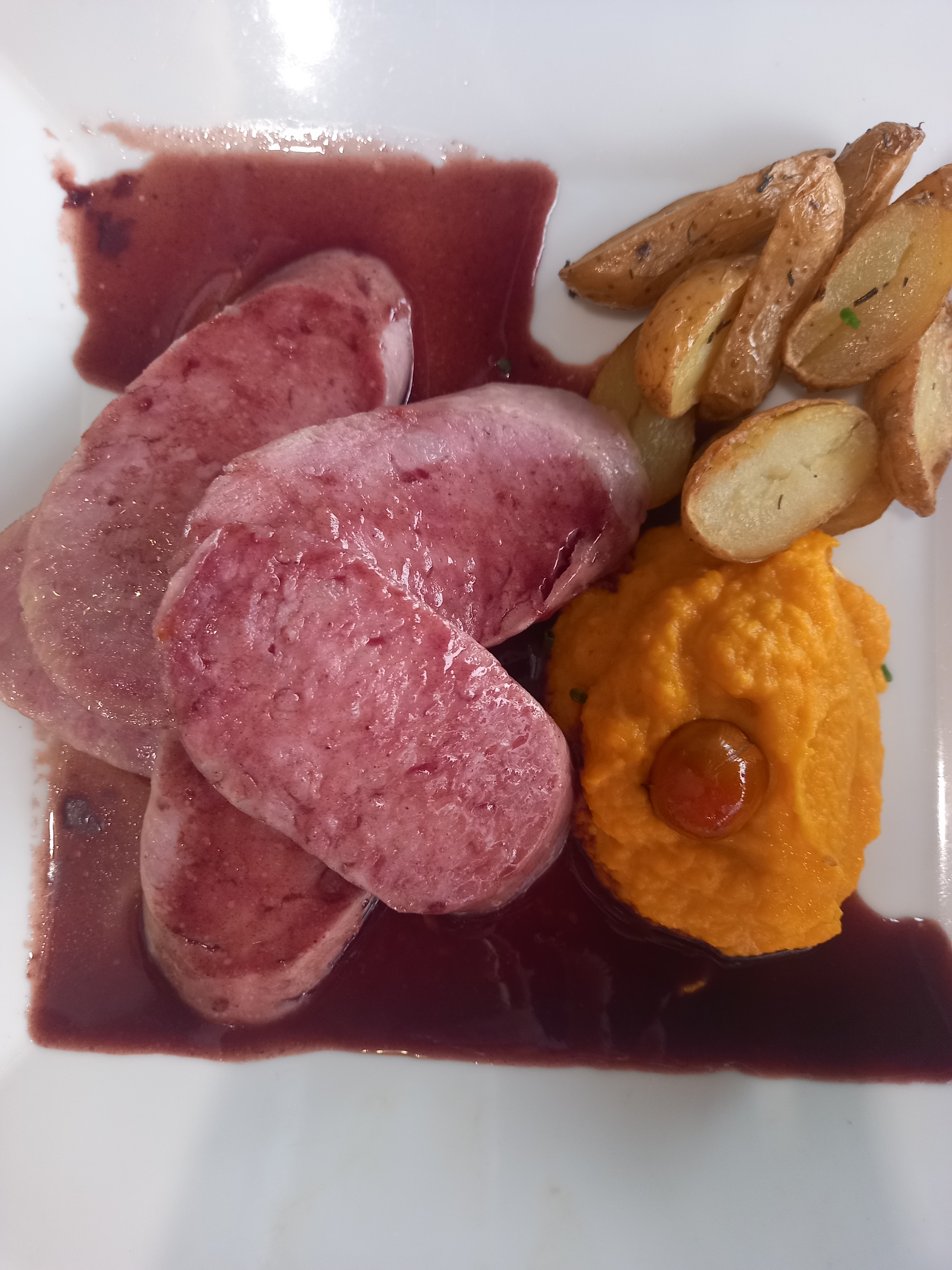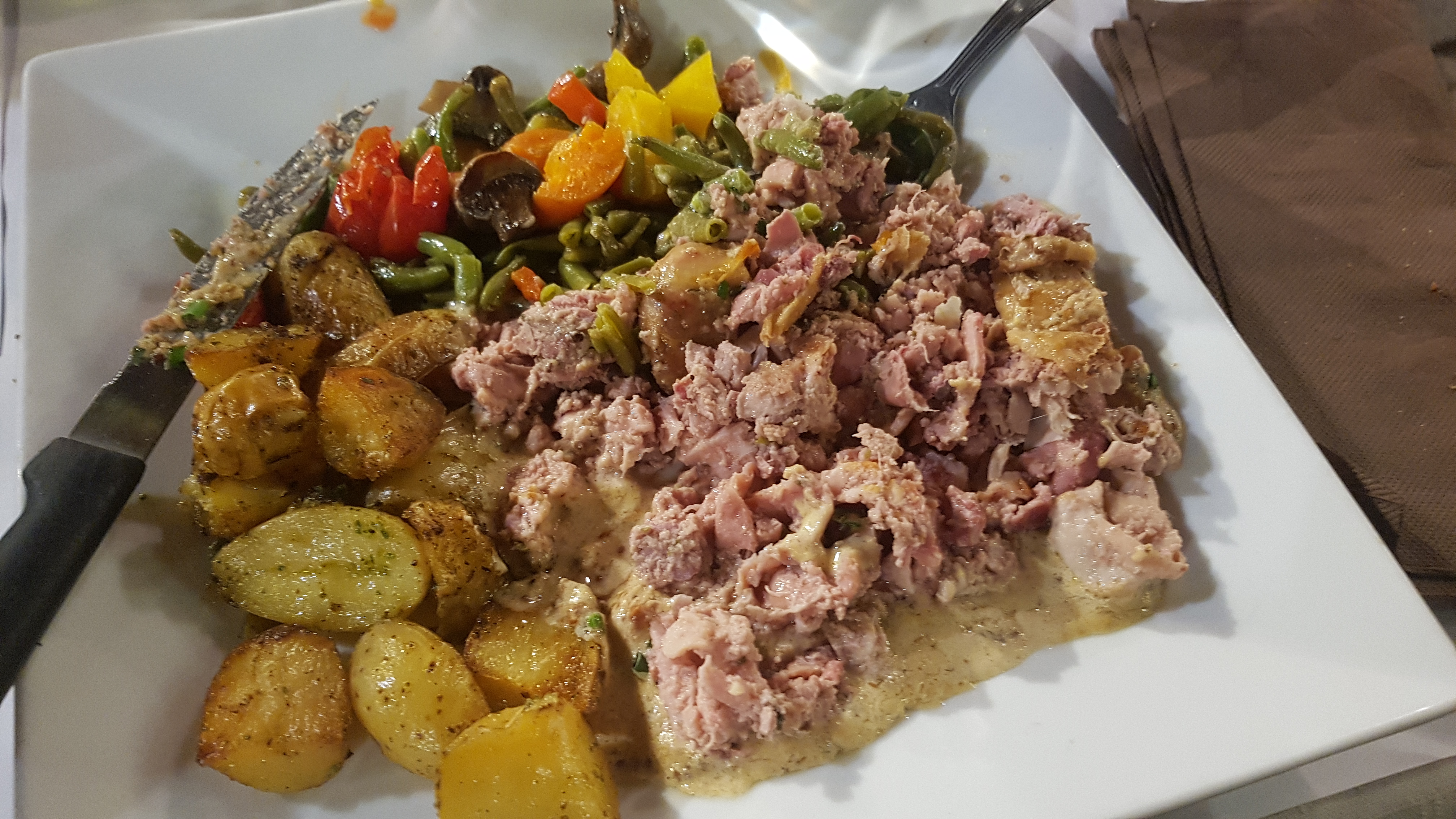 Salade pas bonne avec sauce en bouteille plastique puisque j’ai retrouvé l’opercule dans mon assiette. Ensuite viande de bœuf bonne mais les pommes de terres pas cuite et dur. Pour un menu à 46€ quelle arnaque. Bref à éviter, attrape touriste.