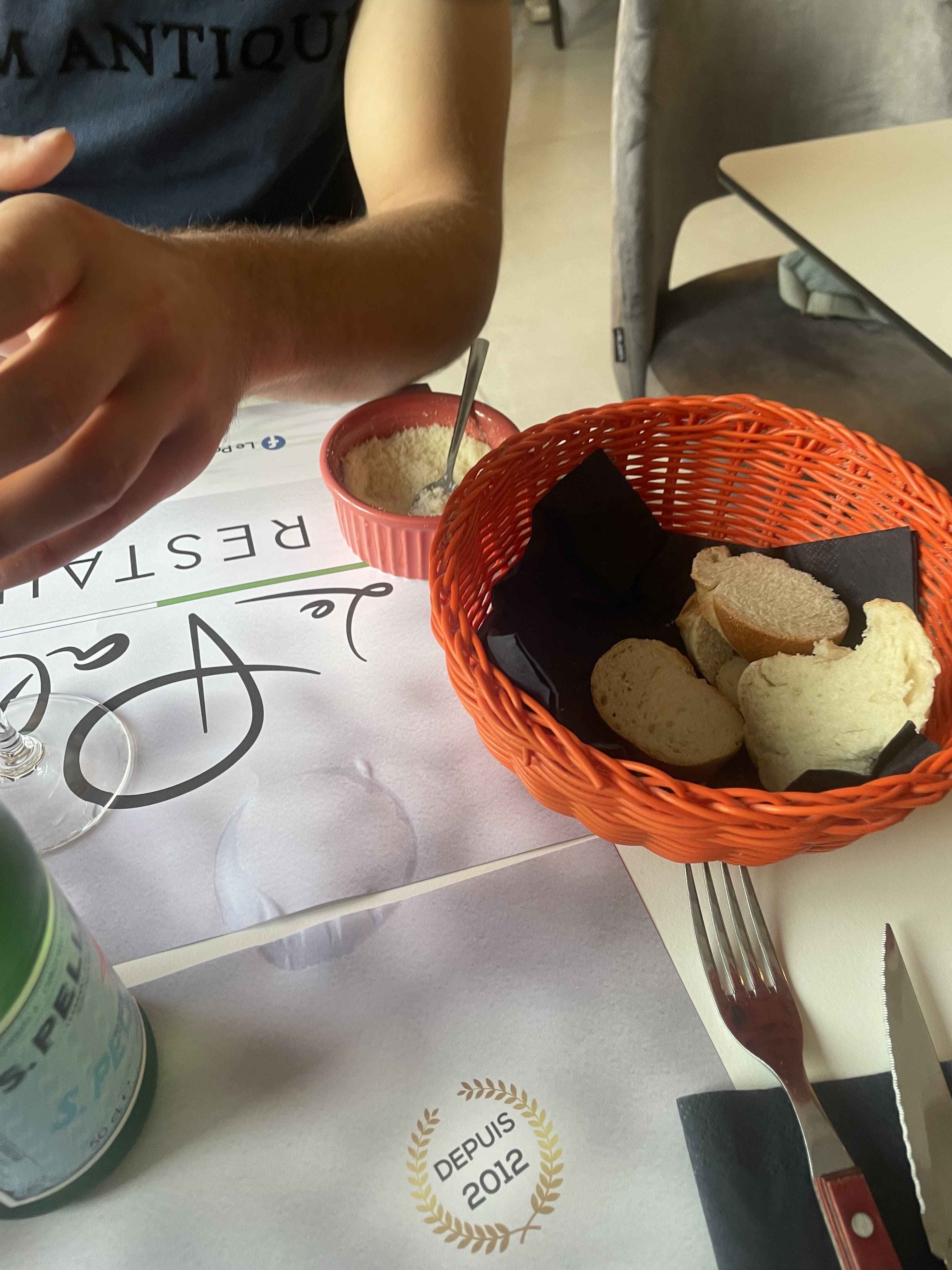 Avant de nous y rendre, nous avons consulté les avis positifs.. Nous aurions dû prendre en compte les avis négatifs plutôt. Nous appelons pour réserver. On nous dit que c’est possible, que l’on nous trouvera une place. Accueil glacial. Nous sommes installés devant la porte qui dessert l’extérieur, mon conjoint assis dans le passage, ce qui lui vaut même une remarque d’un membre du personnel… Un menu pour deux… Un QR code sur le set de table pour consulter le menu, nous sommes sauvés, on ne se battra pas pour regarder la carte.. Et ben non celui-là ne fonctionne pas ! Les boissons arrivent toutes en même temps, aussi bien l’apéritif que les boissons demandées pour le repas… On nous met une corbeille de pain, qui a surement trainée sur une dizaine de tables avant d'arriver sur la nôtre !! (voir photo) Ce n´était ni bon, ni mauvais, simplement banal ! J'ai encore la bouche pleine lorsqu'on vient nous débarrasser… du jamais vu !!! Je confirme les commentaires concernant la vaisselle : verres et assiettes ébréchés ! Au moment de l'addition, pas un mot, on ne vous annonce même pas le montant à régler… Nous vous déconseillons fortement ce restaurant, passez votre chemin au moins vous ne serez pas déçus !