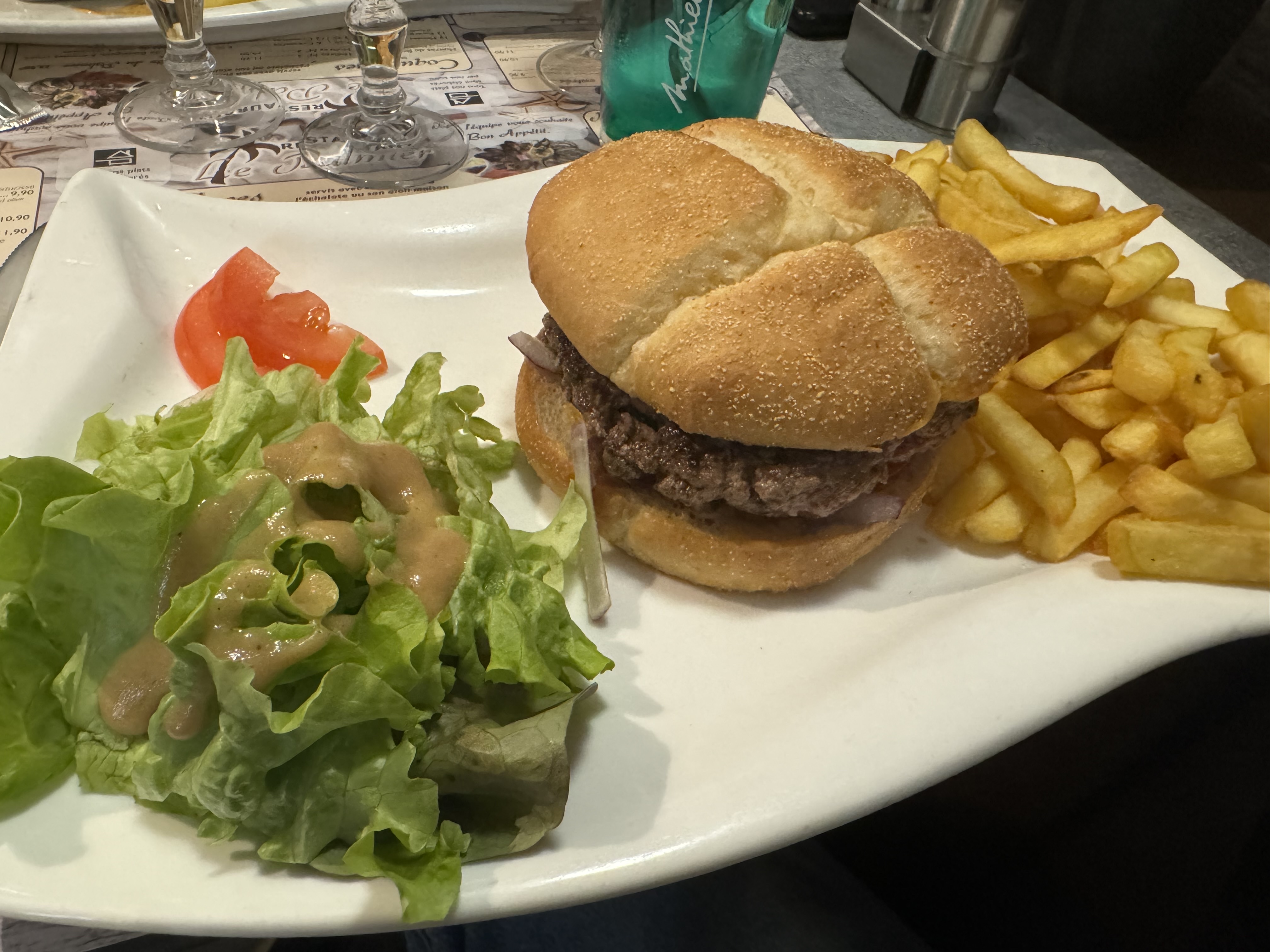 Accueil très sympathique. Alors qu’il pleuvait énormément, la dame nous a ouvert la porte et nous a accueilli avec beaucoup de gentillesse. Serte le restaurant est tout petit mais c’est très agréable. Les plats sont corrects. L’hamburger était délicieux, cuisson saignante parfait avec salade et frites. On aura jamais eu un aussi bon accueil, le personnel est très gentils et souriants. Vous serez très bien accueilli.