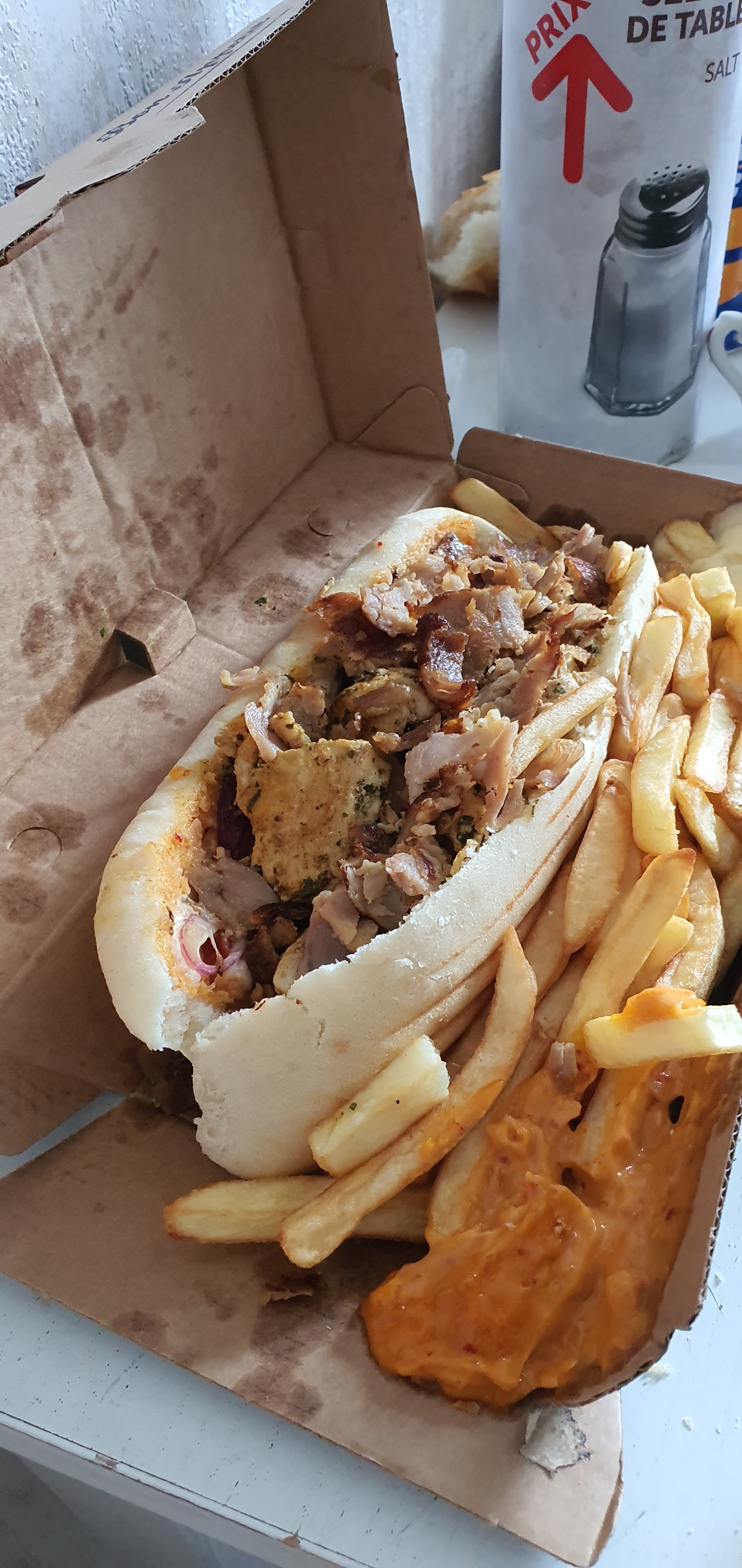 La viande de kebab est bonne, pas grasse avec du goût. Le pain et les frites sont surgelés et il n'y a pas trop d'hygiène lors de la confection des plats. Ensemble correct.