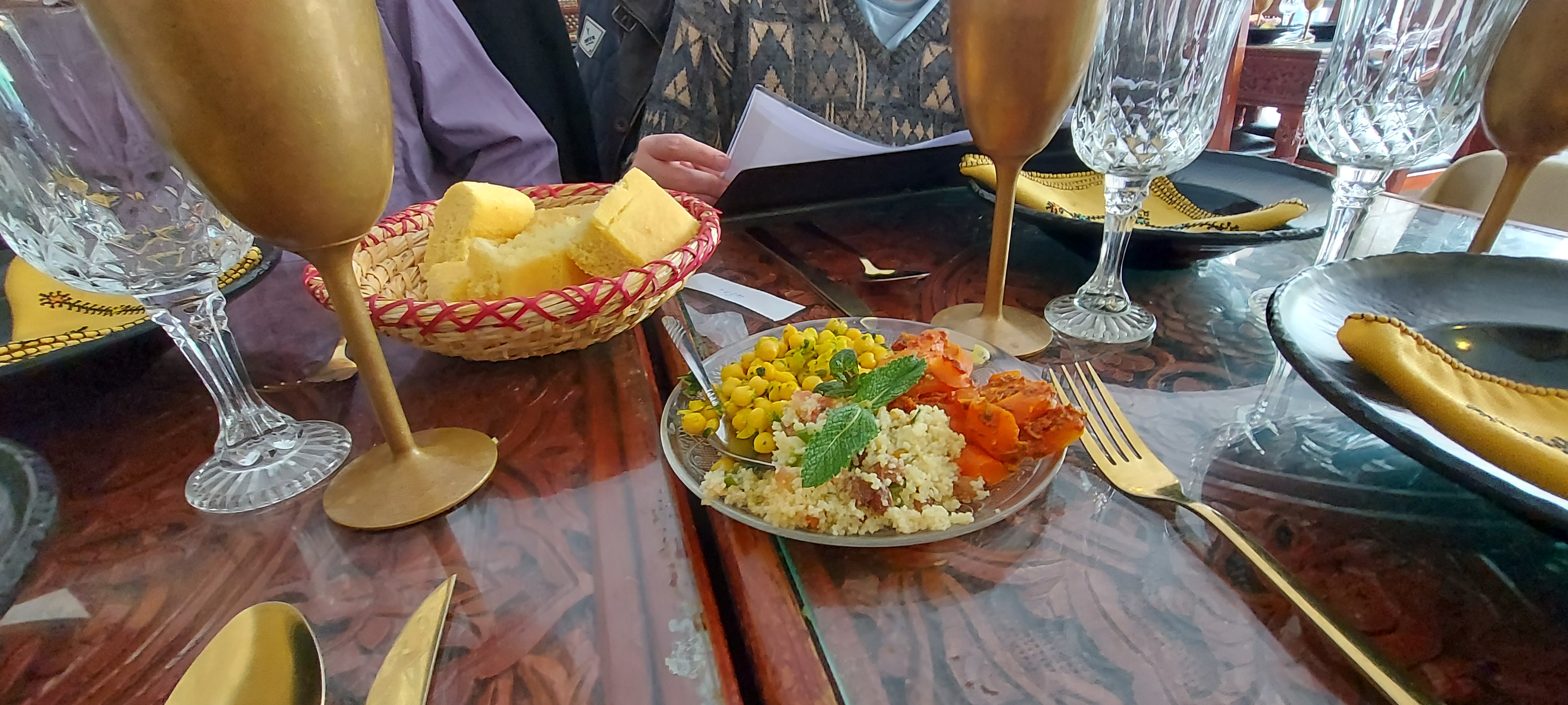 Couscous délicieux, 7 légumes, belles épices. Pastilla extra. Cadre avec une belle évocation du Maroc. Pas assez d'appétit pour gouter aux belles patisseries. On reviendra.