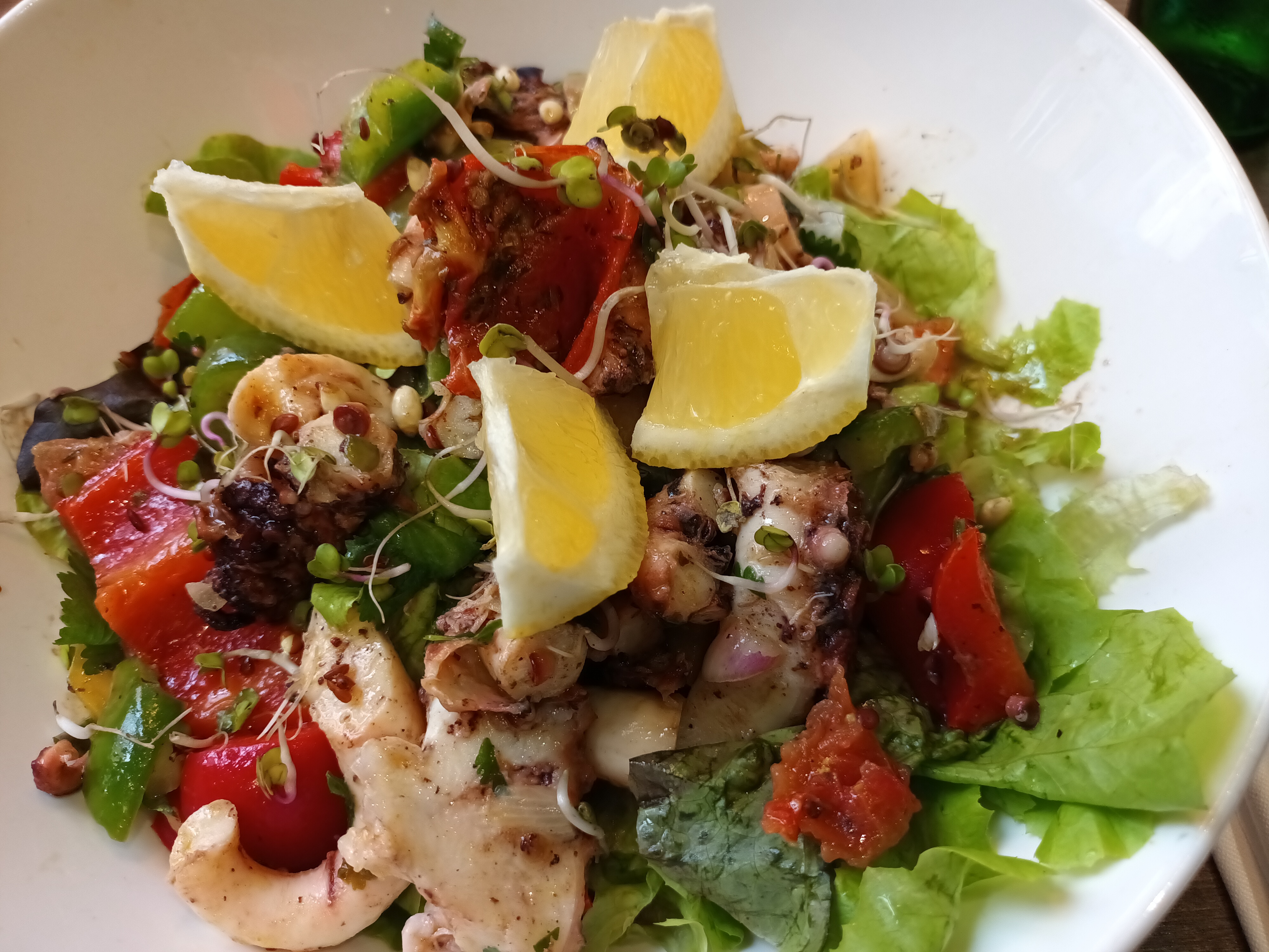 Produits frais et cuisine maison. Nous avons pris une salade avec 2 boules de burrata pesto et pignons de pin, un régal. Et le serveur est très attentif et agréable. Un très bon moment.