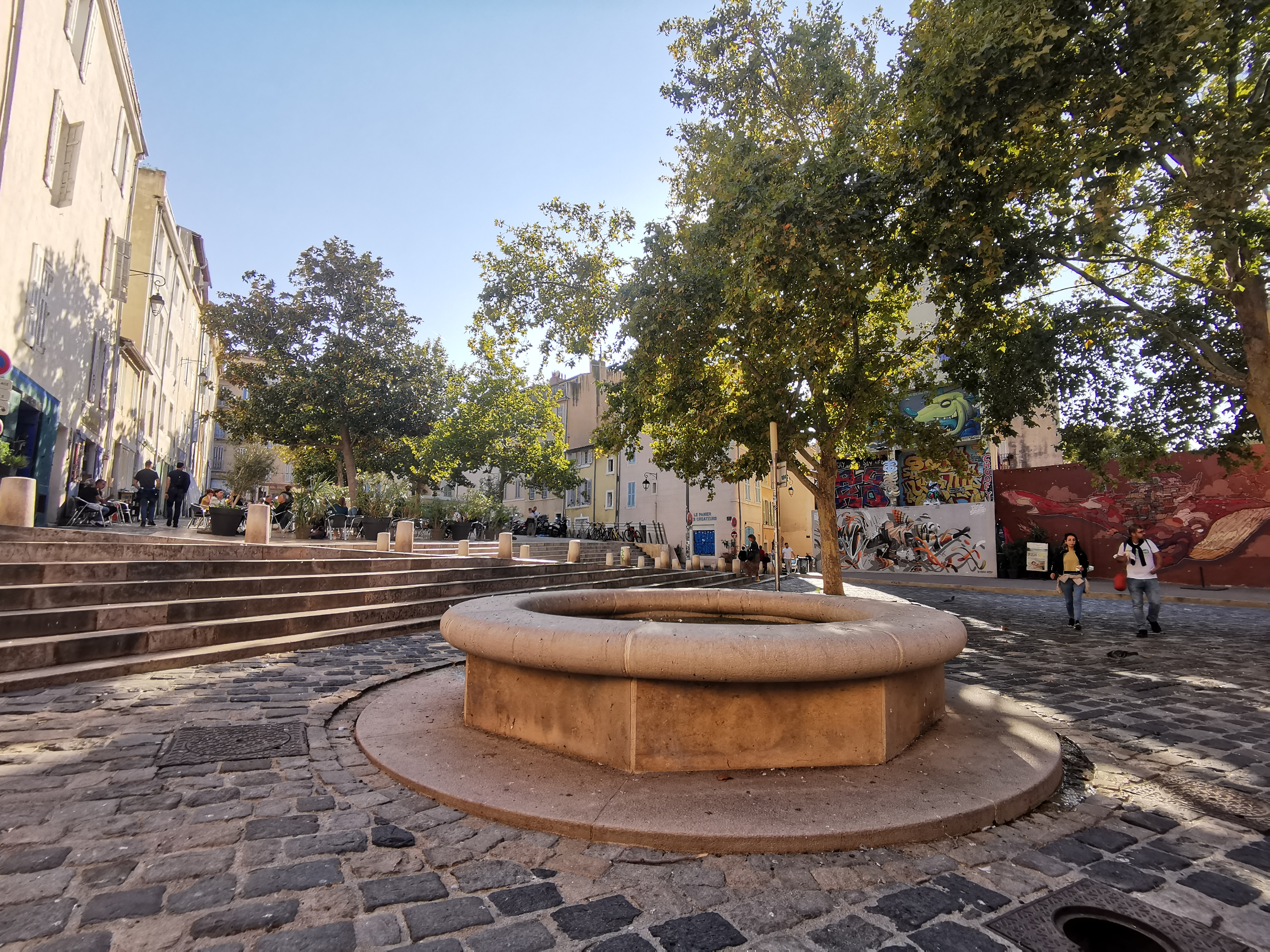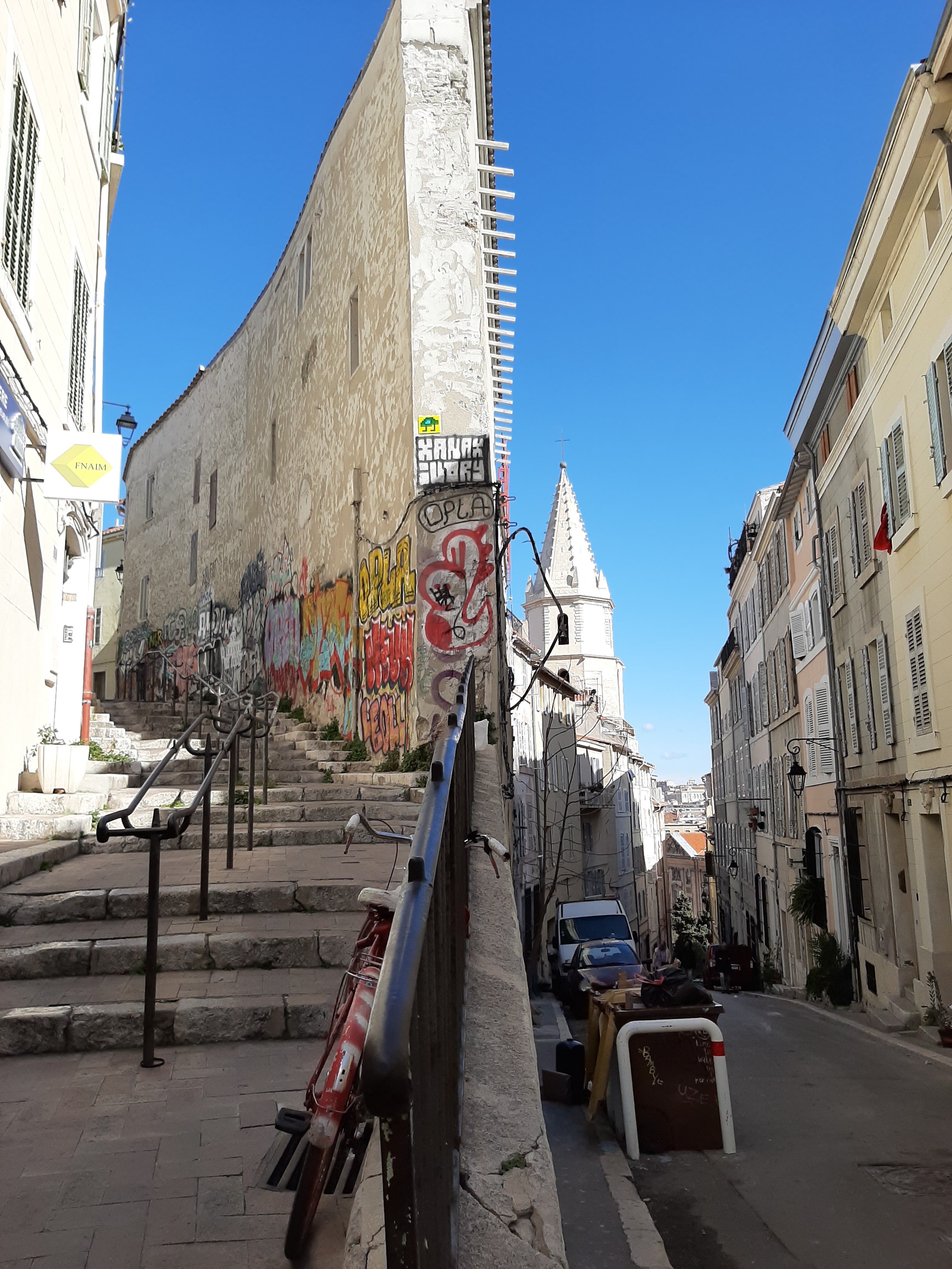 Charmant quartier calme et piétonnier de Marseille. Petites place, restaurant, escaliers … et murs tagués !! Bien agréable de déambuler au hasard des ruelles. A voir.