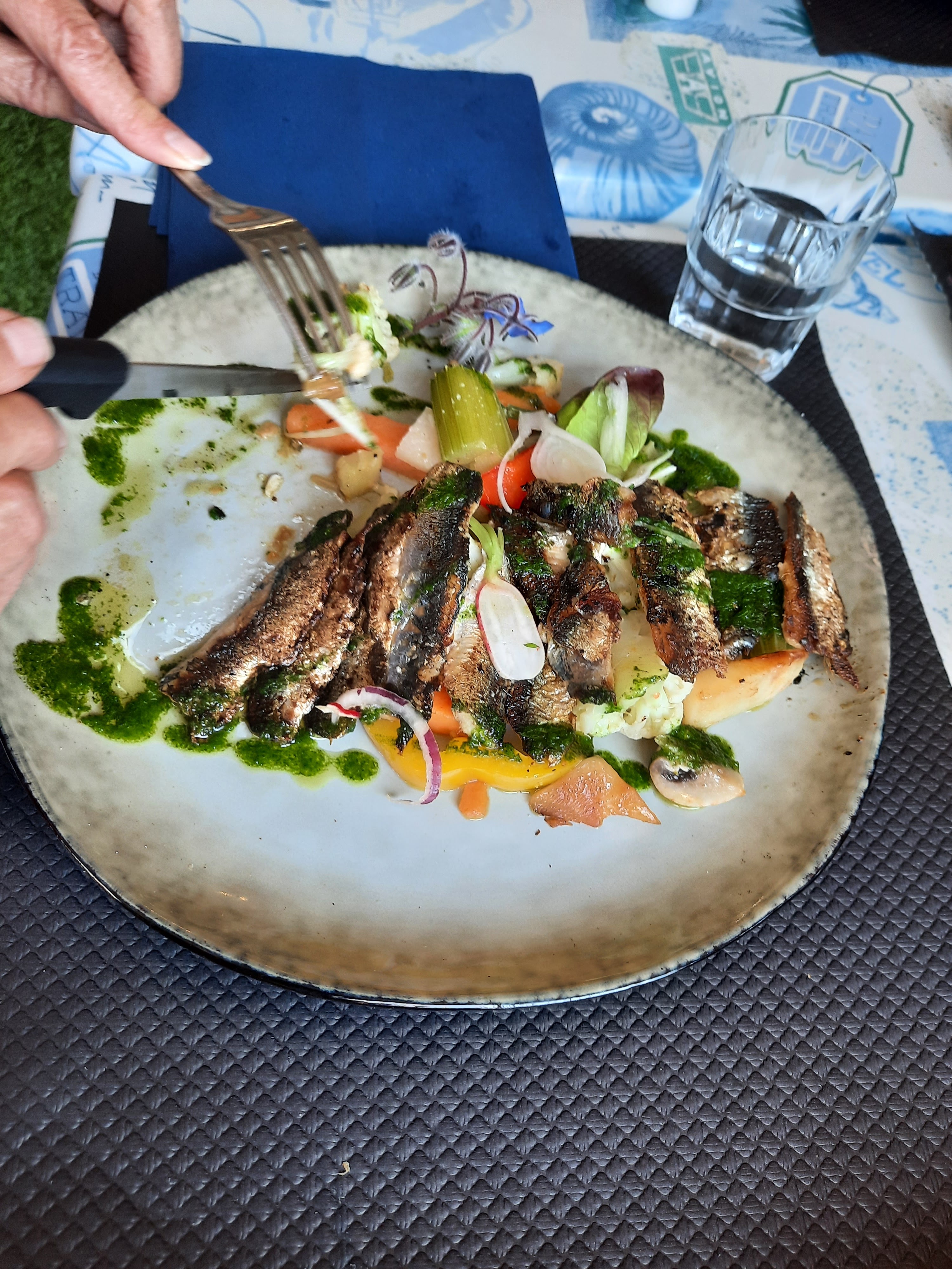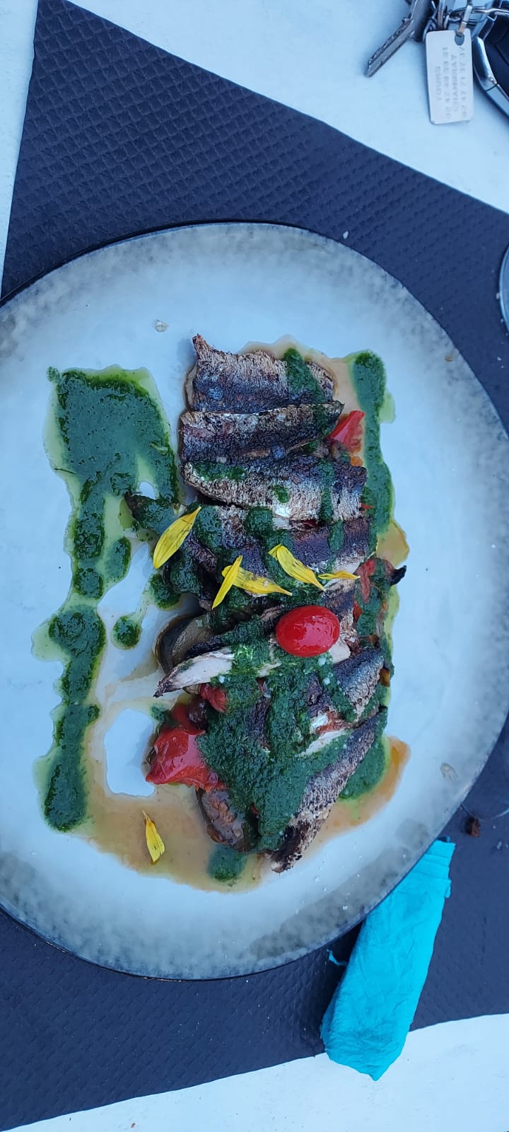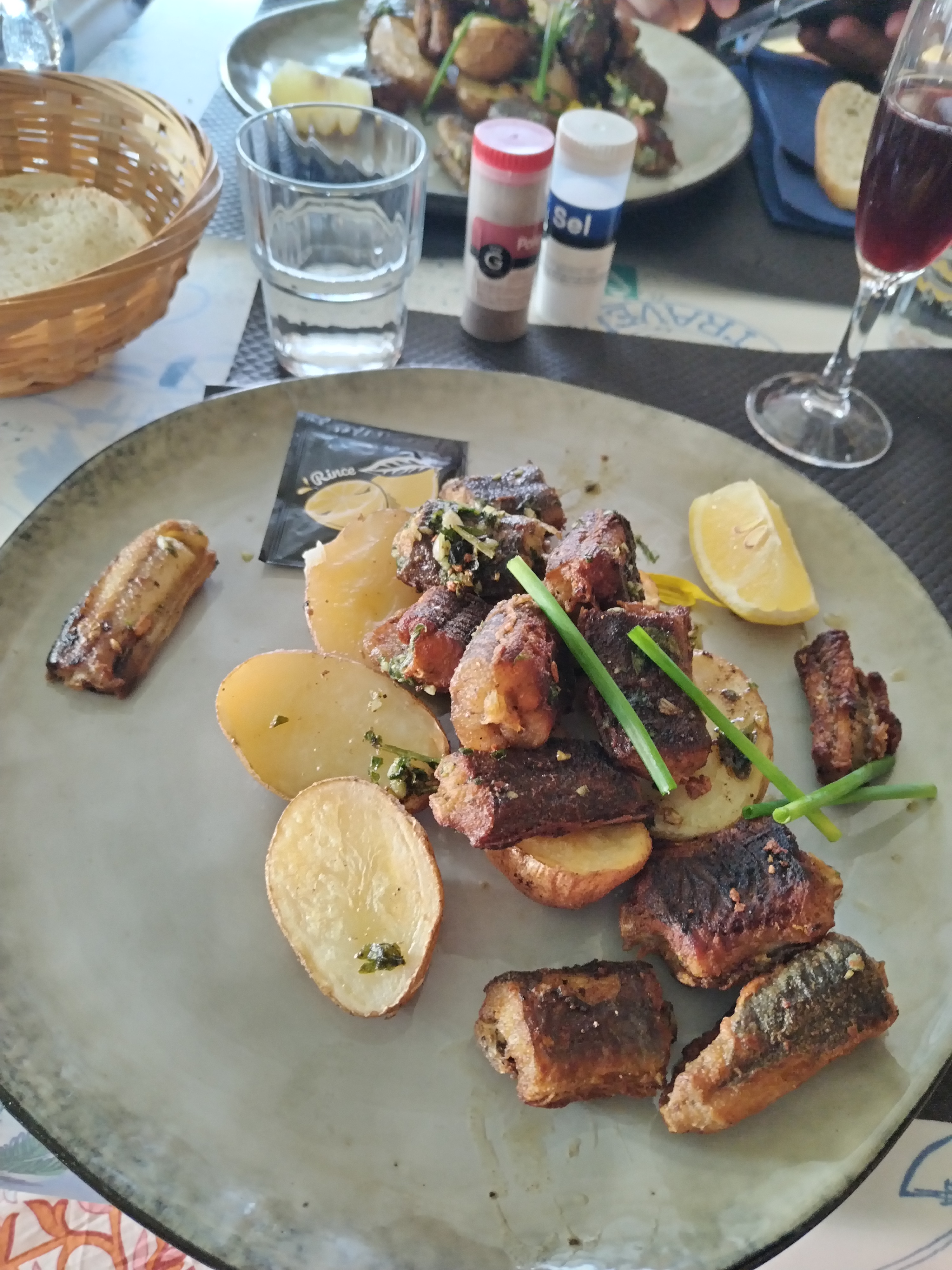 Très bon accueil avec une chaise haute pour bébé. Apéritif rillettes de poisson très bon, fruits de mer frais. Juste déçus par nos pavés de thon extrêmement salés, le sel a complètement masqué le goût du plat. Le plat de sardines et le bœuf ont été très appréciés. Le dessert maison semblait très bon mais nous n'avions plus le temps.