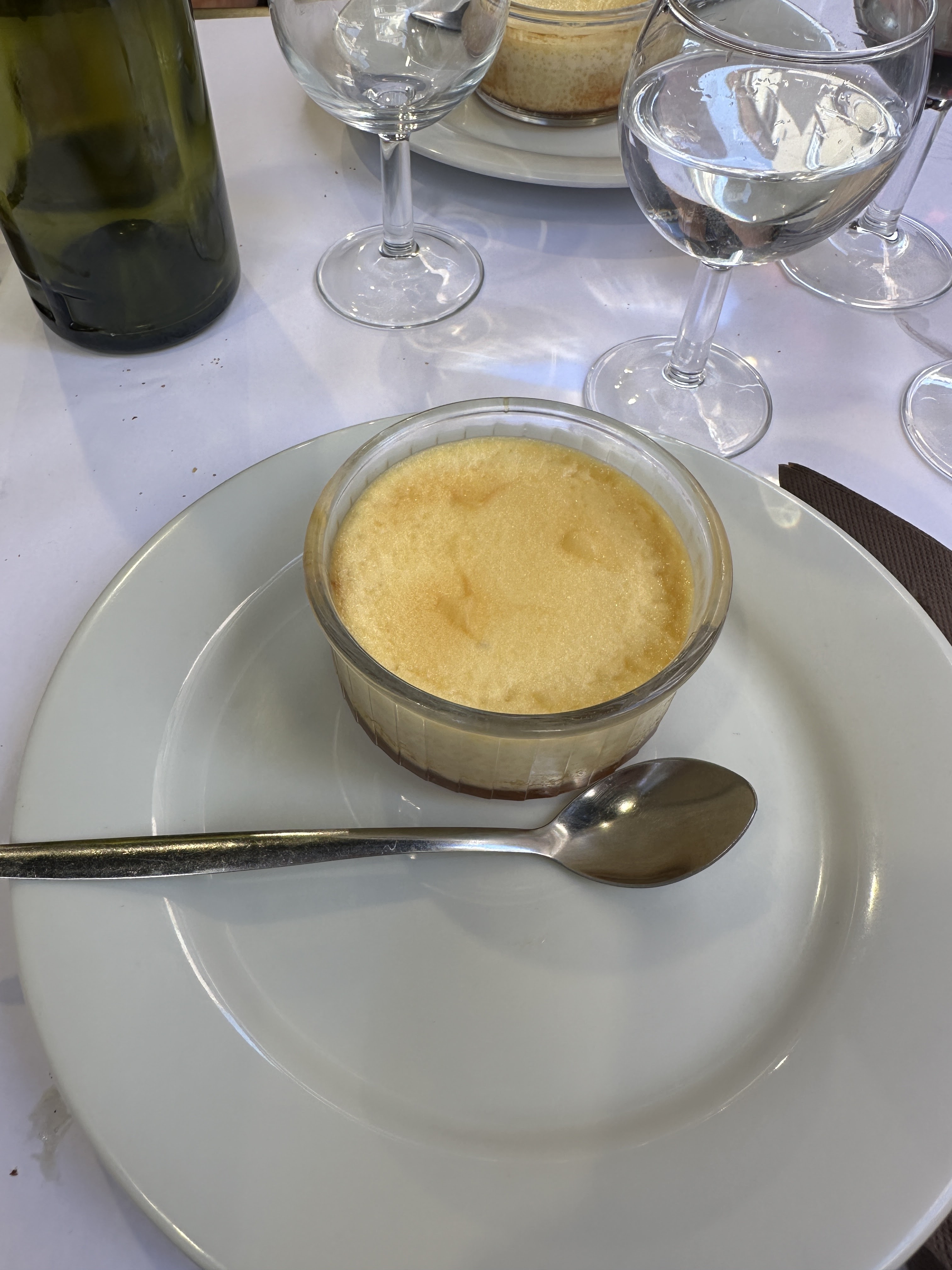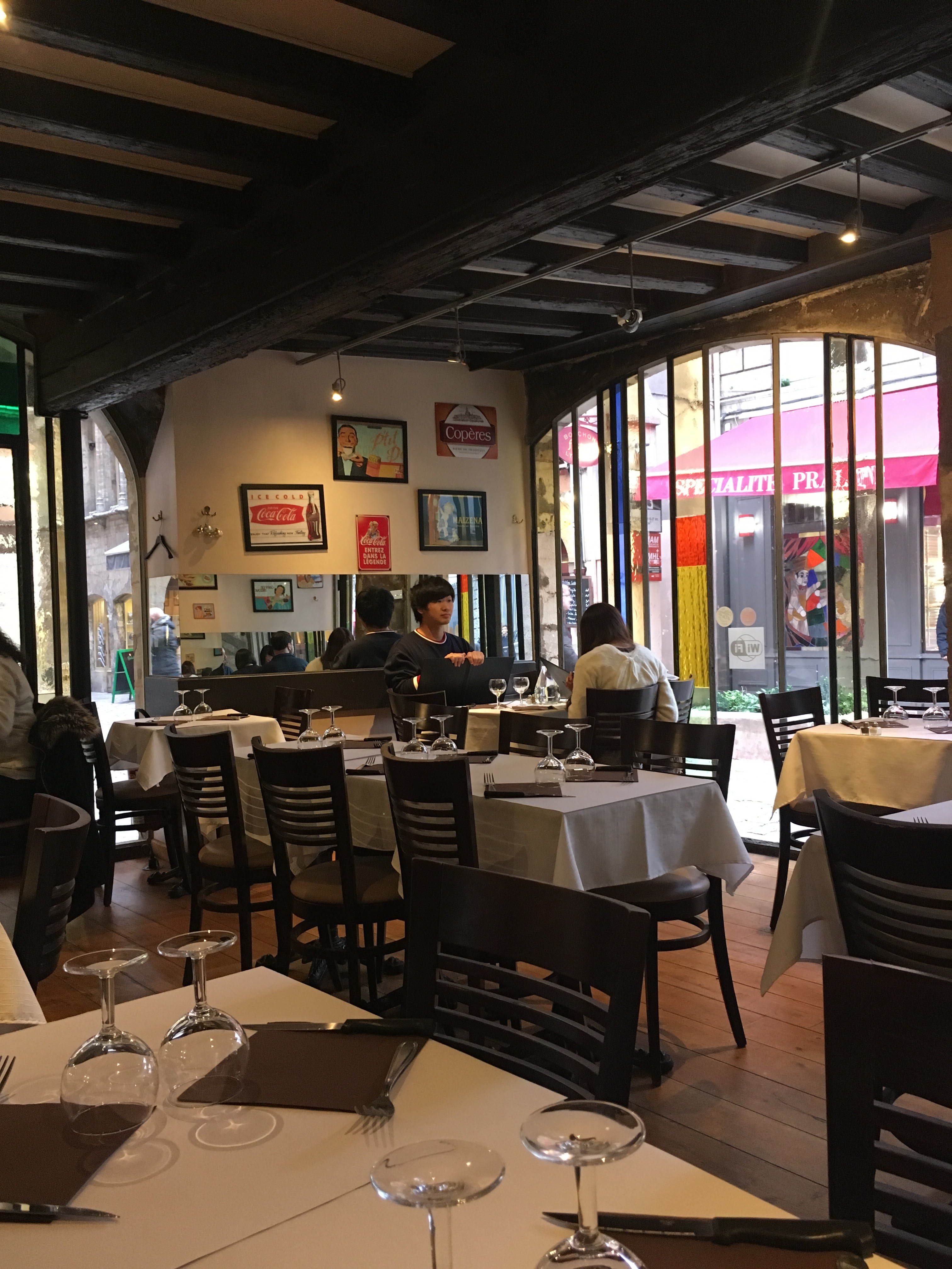 On se fait inviter à s'assoir quand on regardait le resto d'en face. Bon aller la dame est gentille. Les tarifs à la carte et les boissons sont ahurissant... le st marcelin est bon ainsi que la quenelle au brochet mais bon... le supreme de poulet est tout petit et les patates tout juste cuitent... la créme caramel ça allait mais bon... n'a de bouchon que le nom et le lieu... pour les touristes... merci quand mm pour le café gratuit