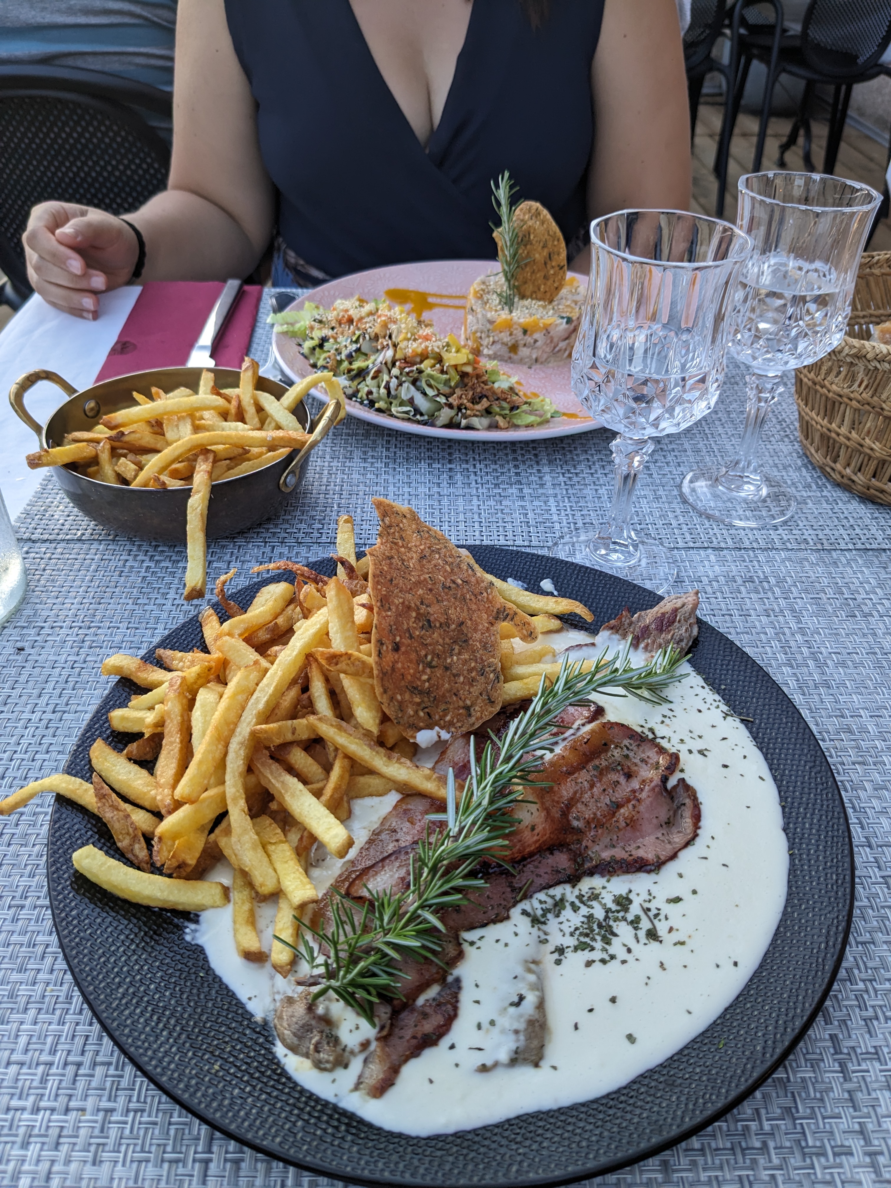 Bonsoir Super table avec belle vue sur le coucher de soleil. Assiette copieuse et cuisine raffinée. Le service au top avec une serveuse à l écoute et disponible. Juste la musique un peu forte mais agréable