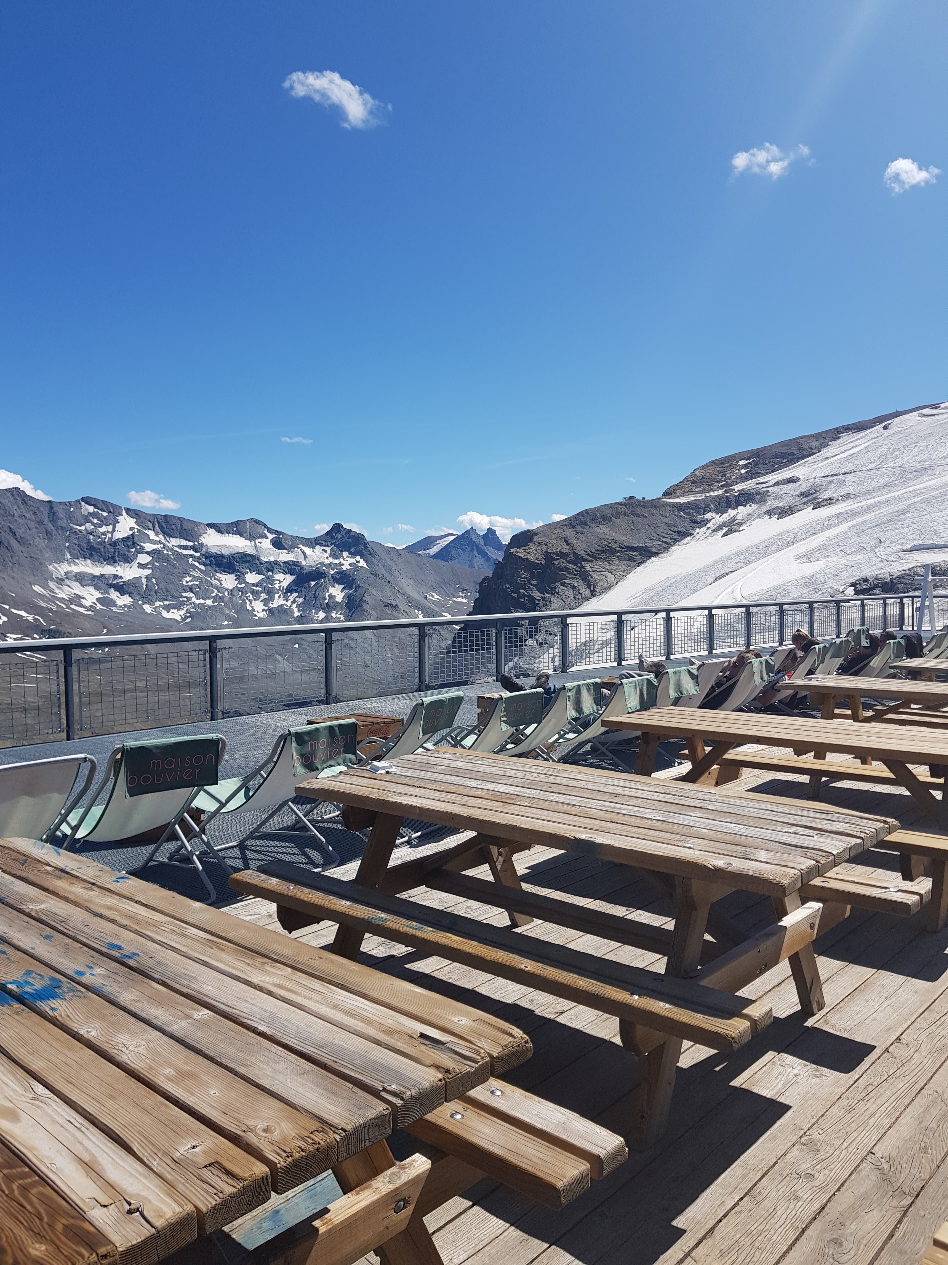 Terrasse du restaurant ensoleillée, vue incroyable sur le glacier de la grande Motte 😍 Sunny restaurant terrace, incredible view of the Grande Motte glacier 😍