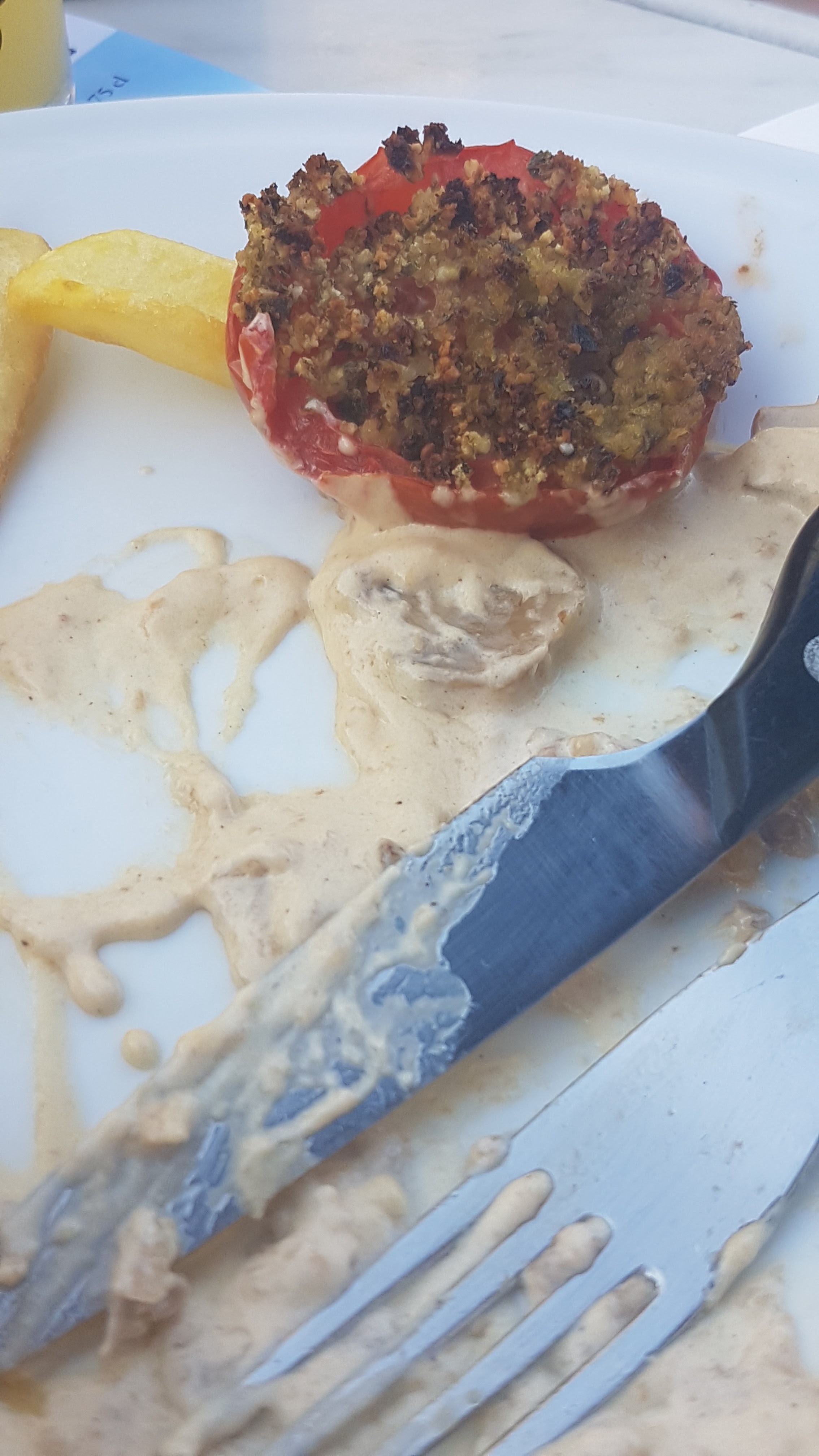 La milanaise est une milanaise, et la tomate provençale pas trop mal mais sinon... Pâtes et légumes dans sel (mm pas dans le cuisson des pâtes), les pâtes trop cuites et du padano au lieu du parmesan... ça m'a rendu triste, site le vin, un Malbec 2017... Bravo pour ça
