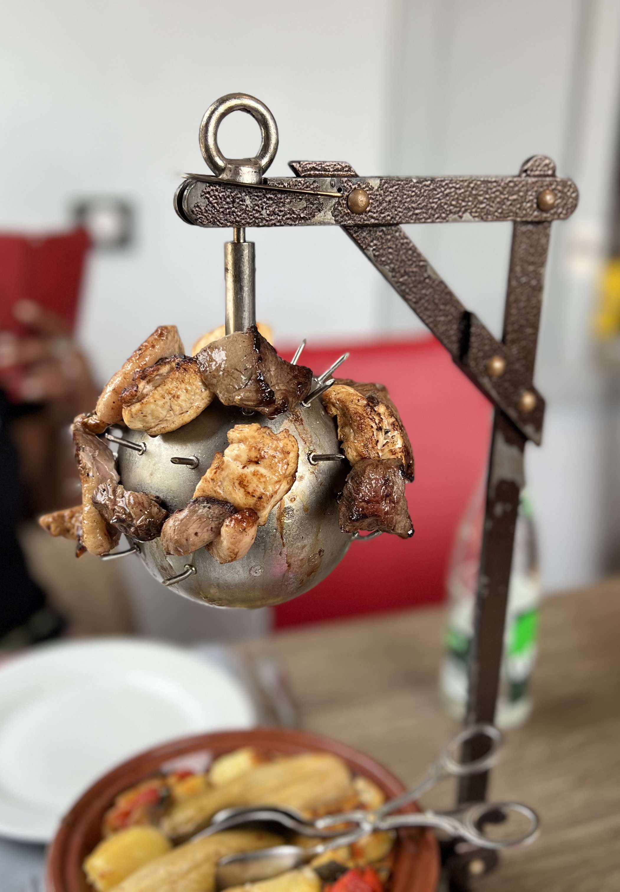 Nous avons mangé de la viande (poulet, bœuf, canard) piqué sur une boule et flambé sous nos yeux, assortie d'un gratin de pomme de terre et courgettes . La viande était de bonne qualité.