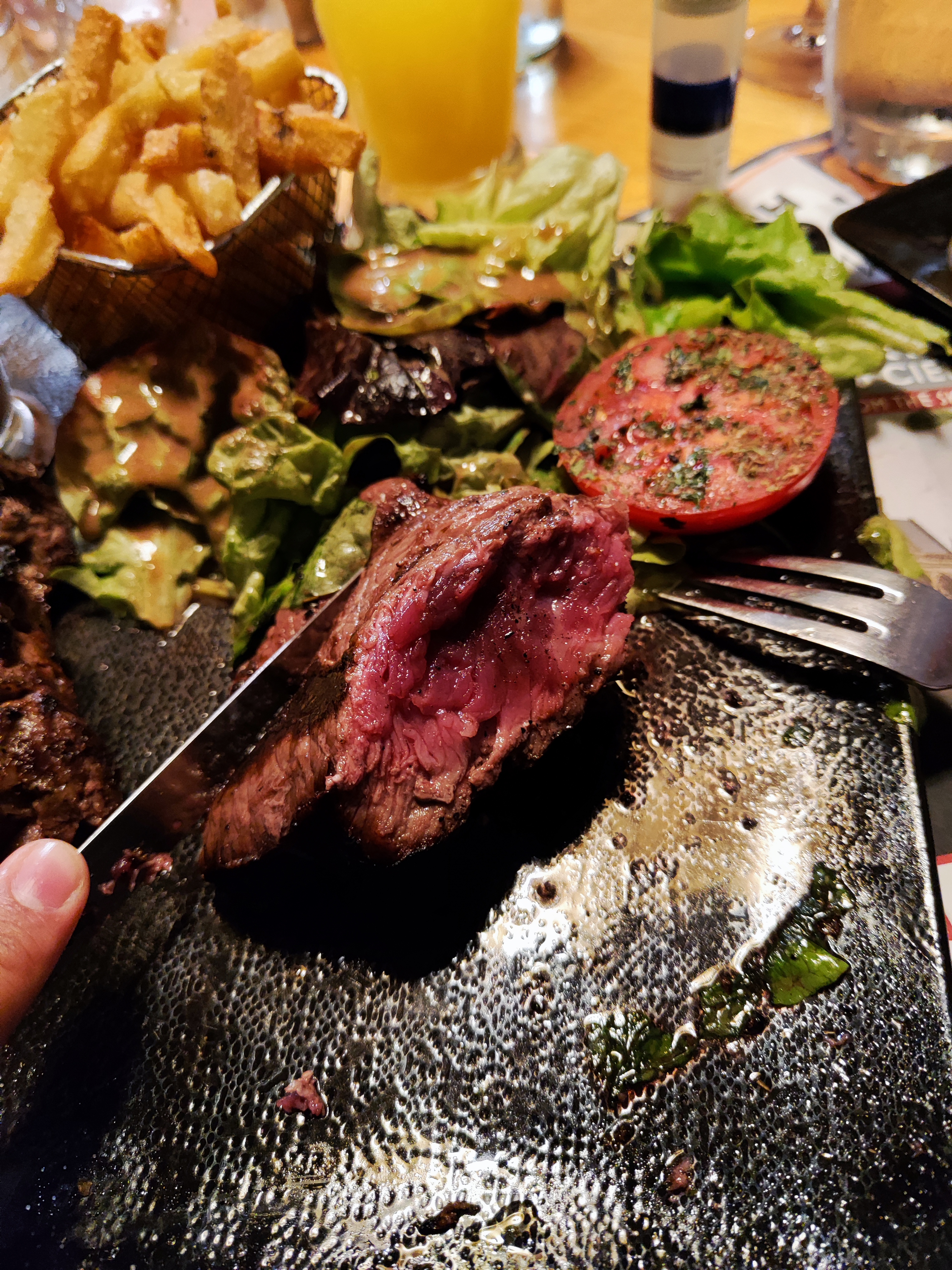 Viande délicieuse cuite selon la demande. Frite pas grasse Cadre très sympa Serveuse très souriante,le patron n a rien de désagréable. Petit point négatif c est la sauce payante mais 1e c est rien :) je recommande !!!
