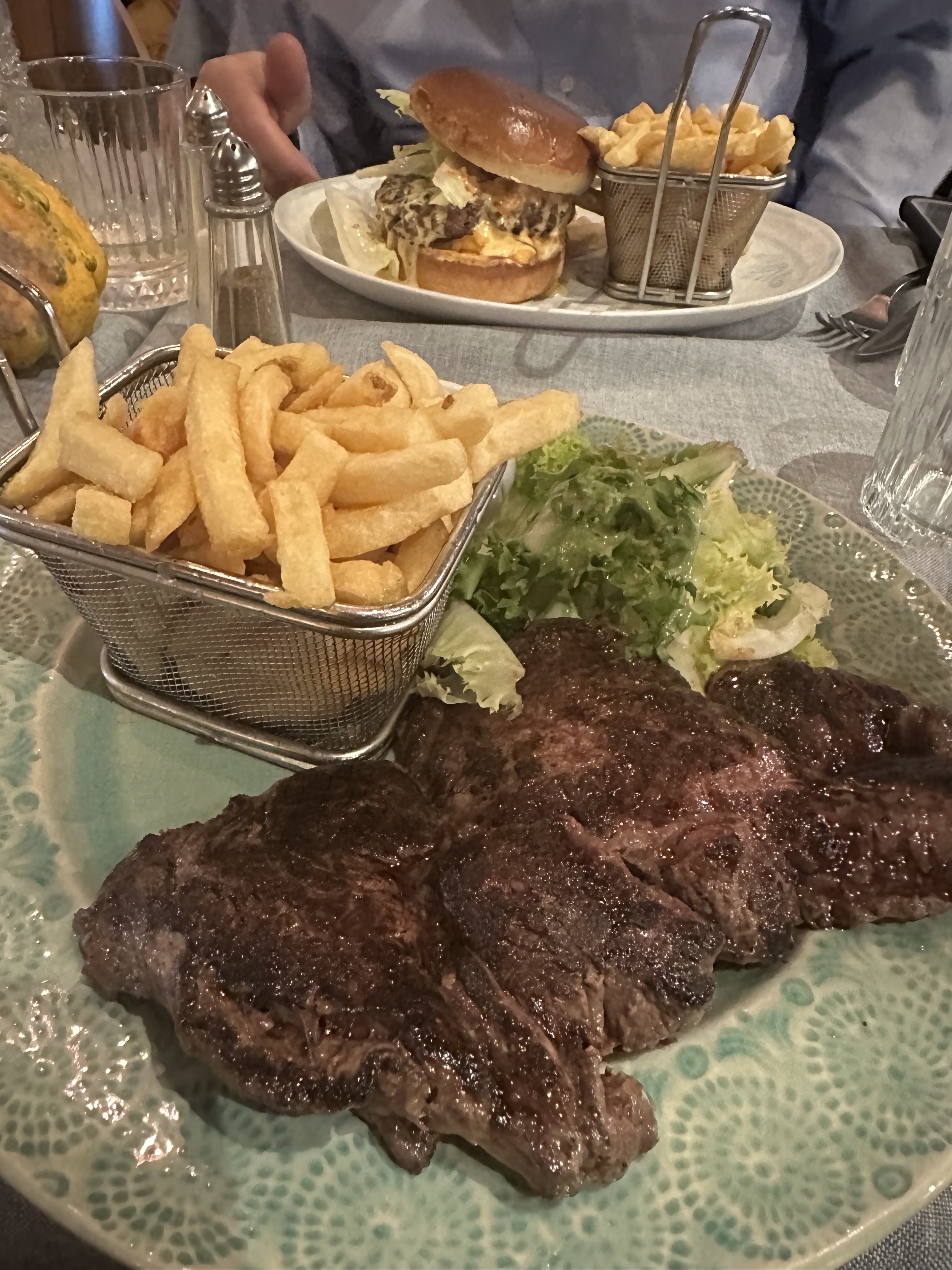 Pire burger vegetarien que j'ai mangé en 6 ans de Vegetarisme 😅 le steak avait un goût étrange, complètement brûlé dessous et il n'y avait pas de garniture à part 2 petites tranches de fromage fondu. Les frites étaient bonnes et méritent 1 étoile. Les salades baignaient dans la sauce et le carpaccio ressemblait à un steak recomposé. Le service vraiment pas au niveau et arrogant et le serveur n'a pas voulu entendre notre mécontentement.