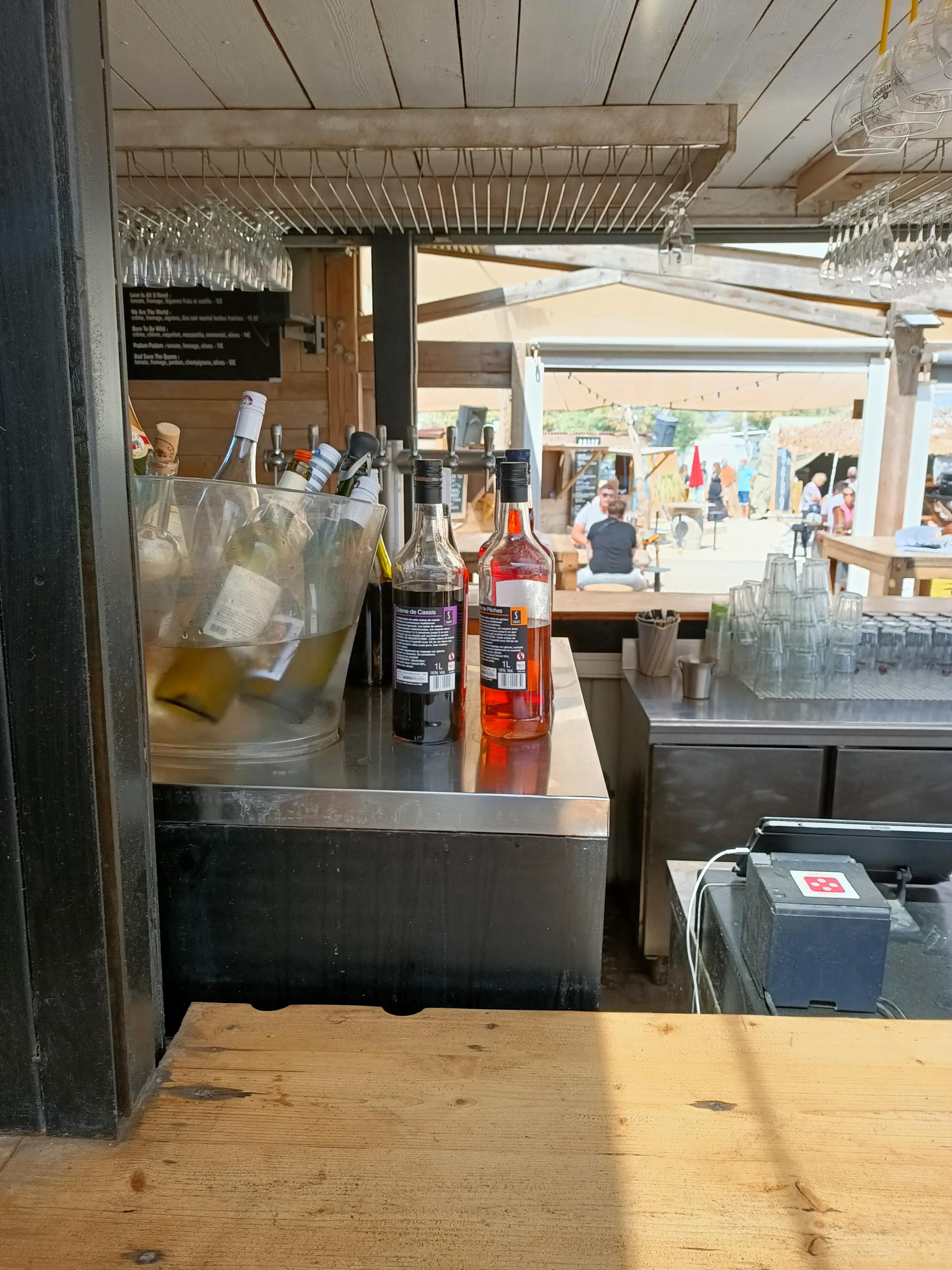 Nous sommes venus à 2 pour dîner Nous avons commencé par un cocktail, le mien avec un cheveu dedans, on l'a fait changer, ça peut arriver Pour manger nous n'avons pas trop pris de risque vu l'endroit, une pizza pour ma part, insipide mais je m'y attendais, j'ai du demander de la sauce piquante On sent au service que le serveur tient difficilement son plateau Nous commandons une bouteille à table, le jeune serveur réussit à ouvrir la bouteille tant bien que mal mais casse le bouchon Nous décidons de partir le plus vite possible et demandons un bouchon pour emporter la bouteille, bouchon de la mauvaise taille Note à 70€ il me semble, on a mangé mais pas des produits de qualité pour les prix qu'ils proposent (7€ pour 2 oeufs mimosa) Je ne blâme pas les serveurs qui ont eu très peu de formation je suppose mais l'équipe qui les encadre À noter tout de même le cadre sympa en bord de plage avec un espace détente