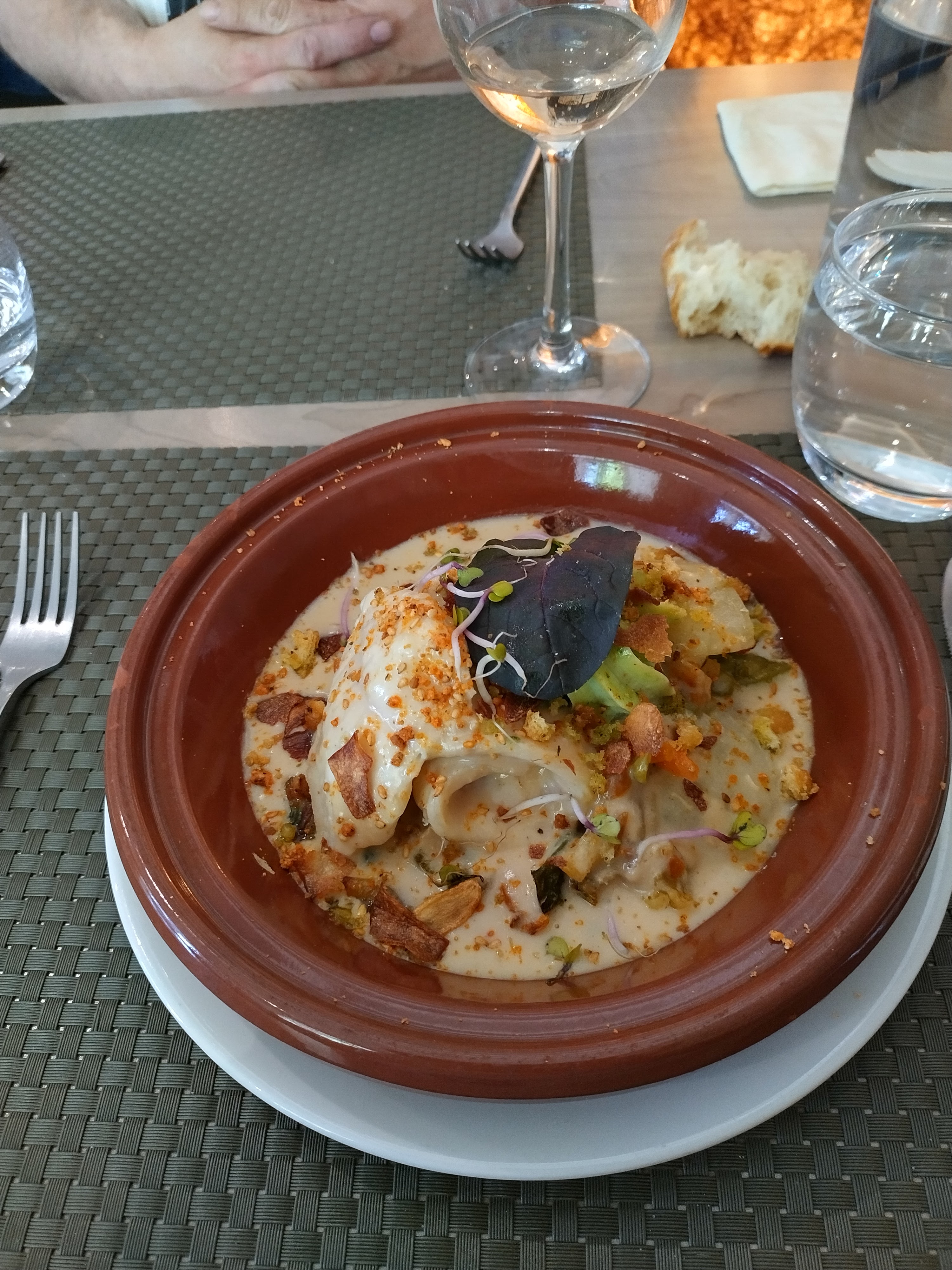 Excellent. Une terrine au p'tits oignons comme on ne s'y attend pas. Seiches aux chorizo tomates pommes de terre comme il faut . Relevé d'un Pic st Loup rosé à frais J'attends mon dessert..... Hummmm ! ! ! Je me suis régalée. Merci cuisinier.