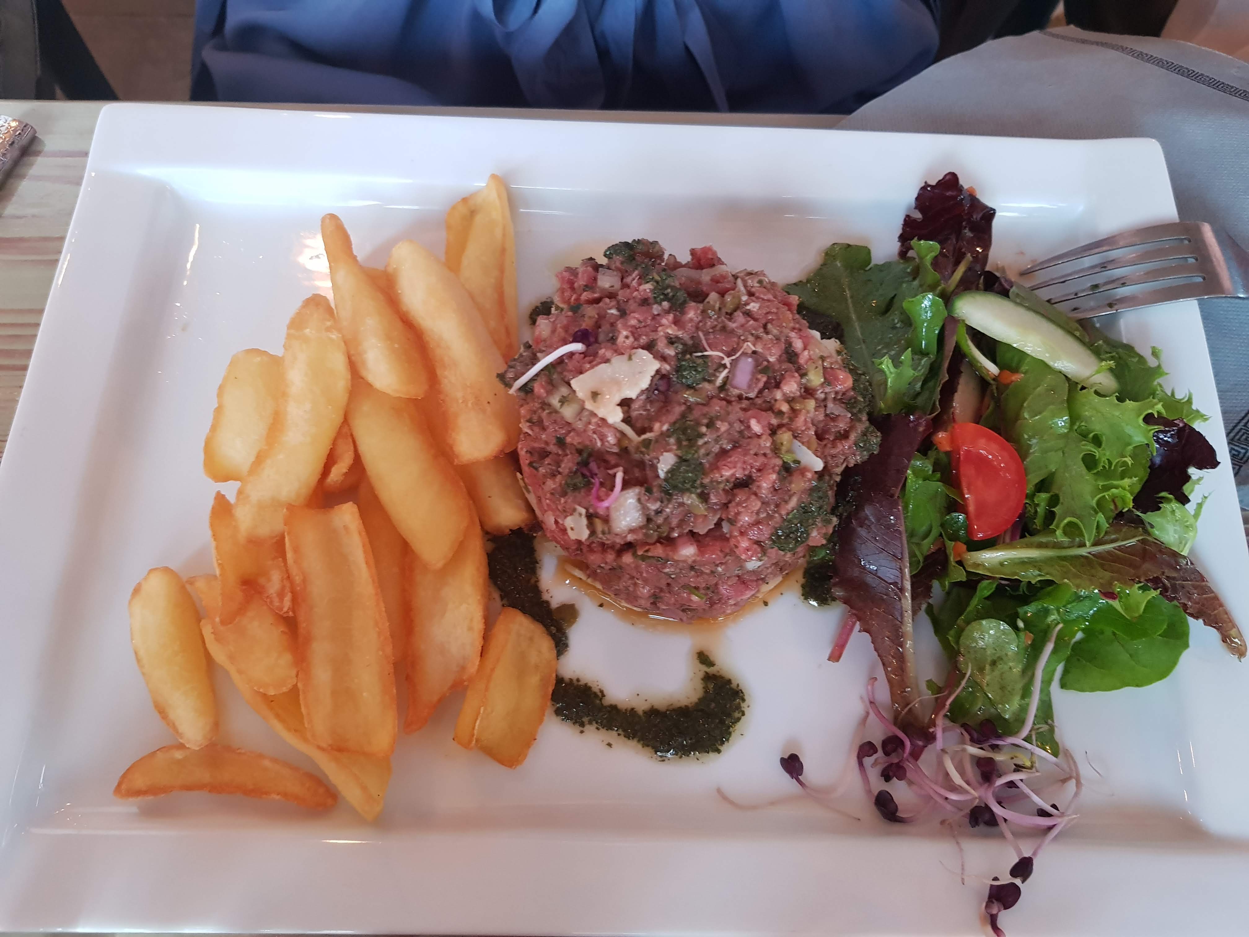 N'étant pas un grand fan du tartare, j'ai eu un peu peur en voyant la carte (restaurant choisit un peu au hasard en visitant), je suis donc parti sur un poulet riz sauce curry.. pourtant pas un habitué, j'ai trouvé ça délicieux ! Acceuil avec le sourir, lieu très sympa et attente plus que raisonnable entre les plats alors que le restaurant était bondé de monde. Bref, ne démerite pas sa reputation !