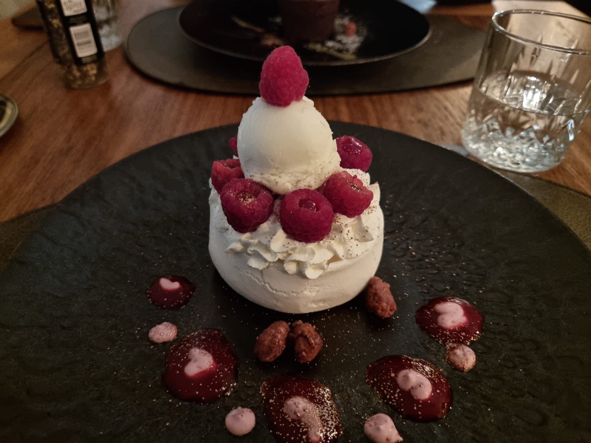 Restaurant chaleureux, service très sympathique. Nous sommes arrivés à 21h00 et pouvions encore choisir dans le menu. Il y avait un délicieux steak, parfaitement préparé avec des légumes savoureux. Après le steak, le dessert était pour moi une petite fête. Le dessert pavlova aux fraises était si frais et délicieux, le plus savoureux que j'ai jamais mangé. La particularité de ce restaurant est qu'ils servent les plats sur une assiette blanche, décorée de décorations comestibles très astucieusement réalisées !