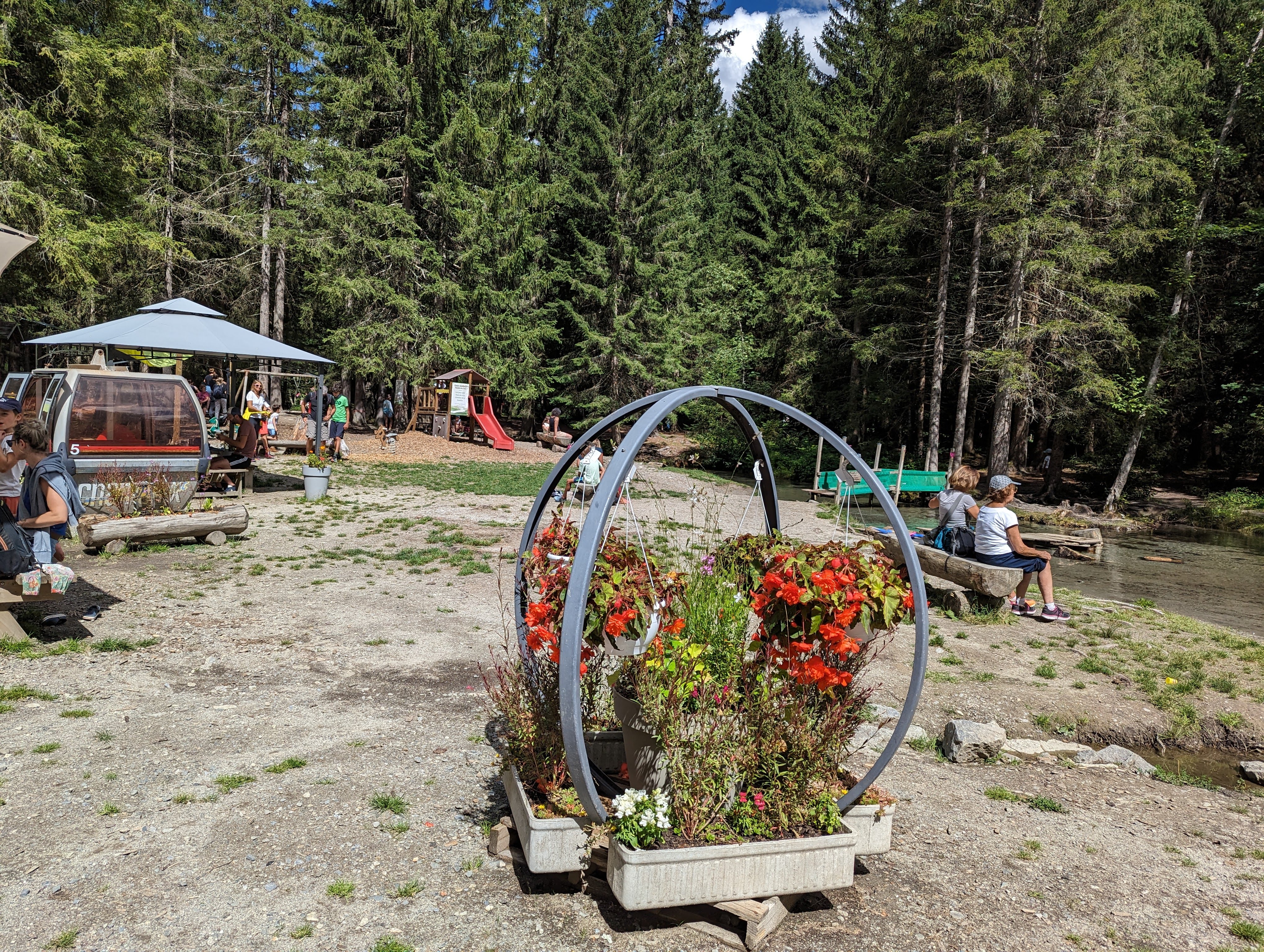 Magnifique petit endroit pour passer un après-midi. Nous avons loué des vélos au centre de Chamonix mais avons emprunté un détour car ce n'est pas trop loin, ce serait une belle promenade depuis la ville le long de la rivière. Vous devrez cependant faire un détour par le téléphérique et le parcours de golf à un moment donné. Le Café propose une grande sélection de friandises froides, des glaces aux bières. Les paiements par carte nécessitent une dépense minimale de 10€. Il y a beaucoup d'endroits où s'asseoir et différentes choses sur lesquelles les enfants peuvent jouer. Le ruisseau est une grande attraction pour pagayer, même si certains enfants ont trouvé l'eau de la montagne trop froide. Les toilettes les plus proches se trouvent à quelques minutes du sentier.