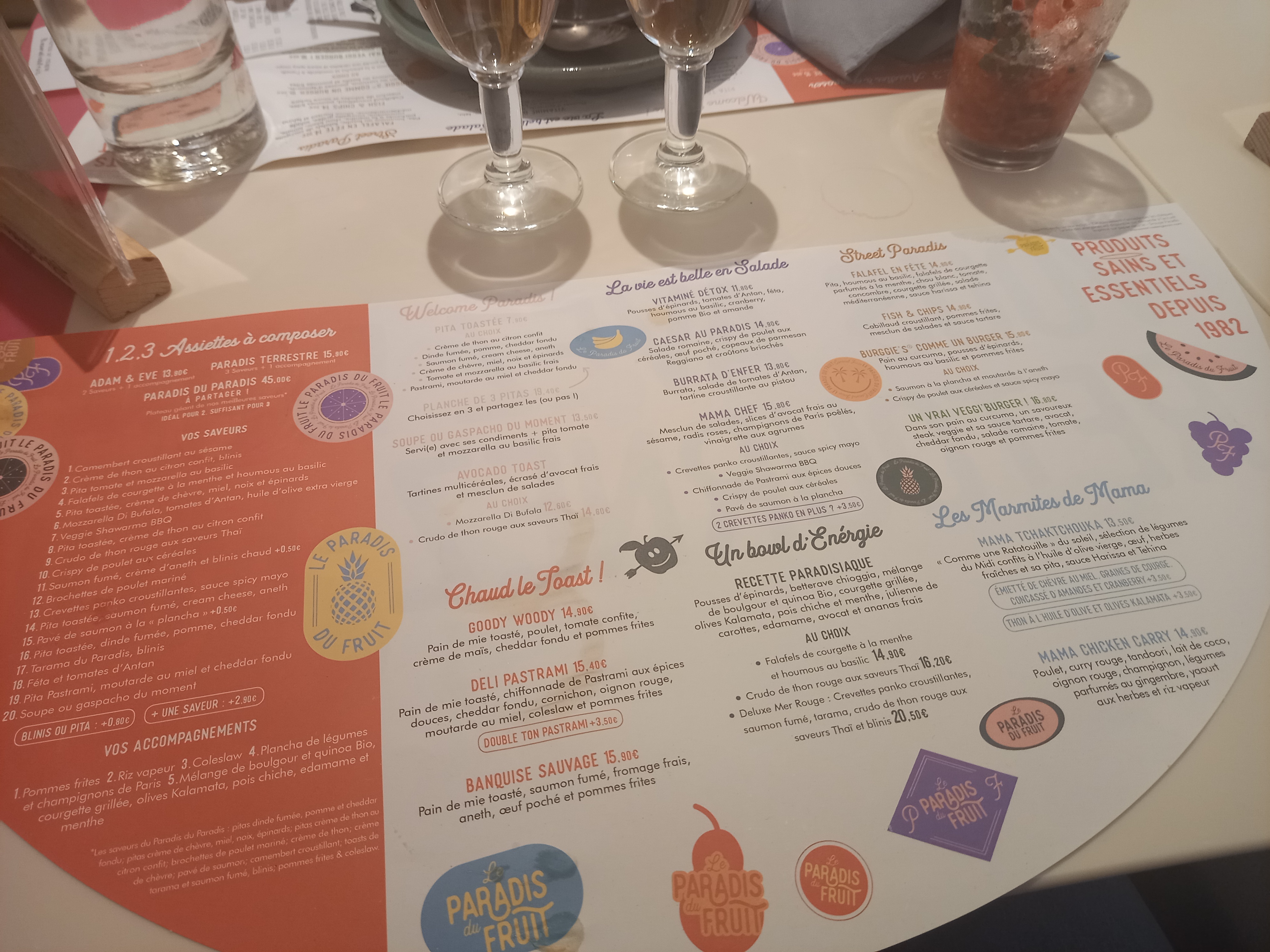 Deçu, des serveurs pas aimables, de la nourriture pas folle et un climat pas super agréable. Les boissons sont bonnes mais un peu cher. Domage, les paradis du fruit ne sont plus ce qu'ils étaient.