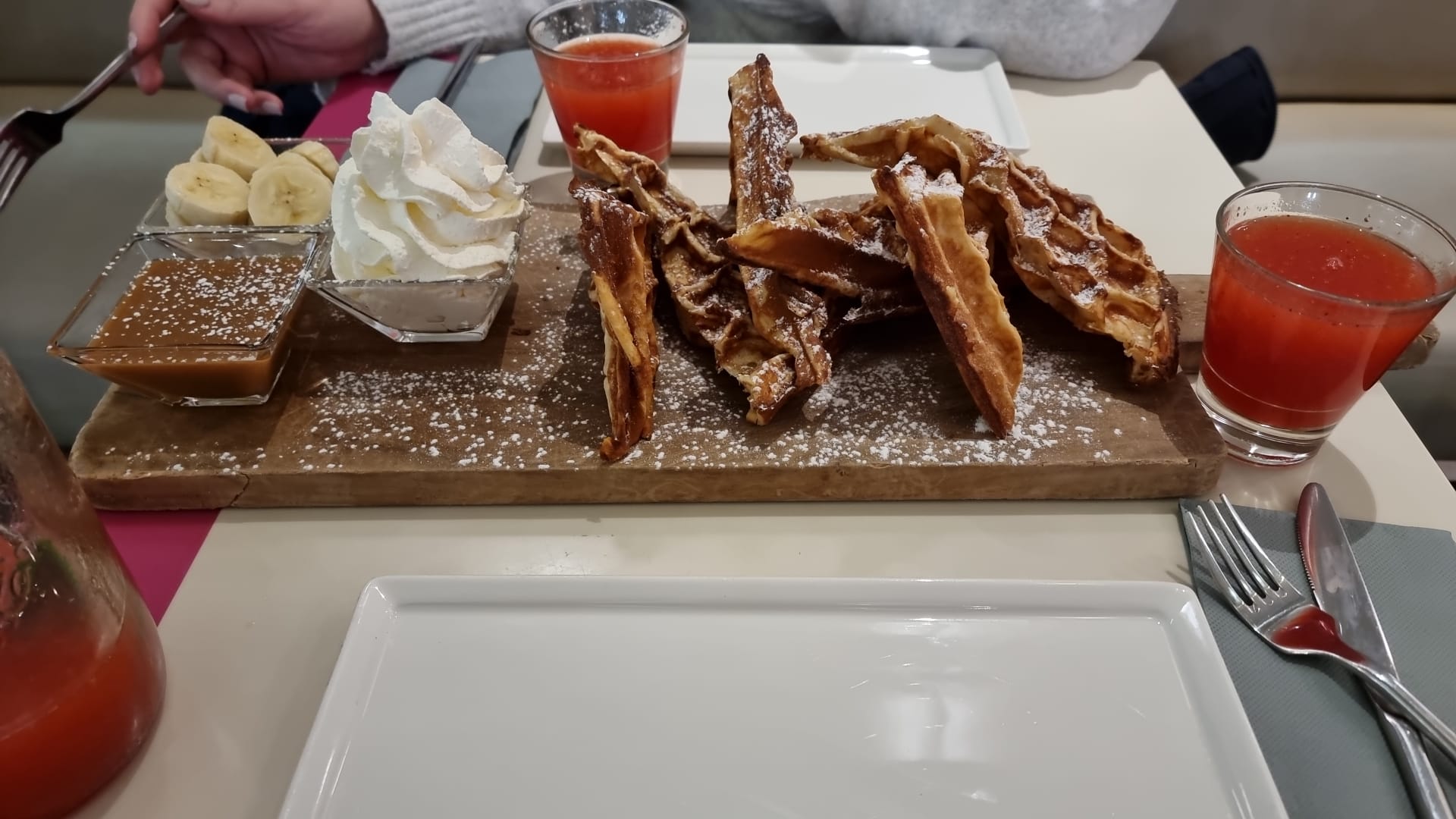 Les gaufres à partager pour 2 ou 3 sont seulement 2 gaufres coupées en 2 !!!!! Heureusement nous n étions pas 3 ! En plus de l erreur dans le choix de l accompagnement le prix est très excessif pour un petit goûter !!! Nous avons testé nous n y reviendrons plus ...dommage !