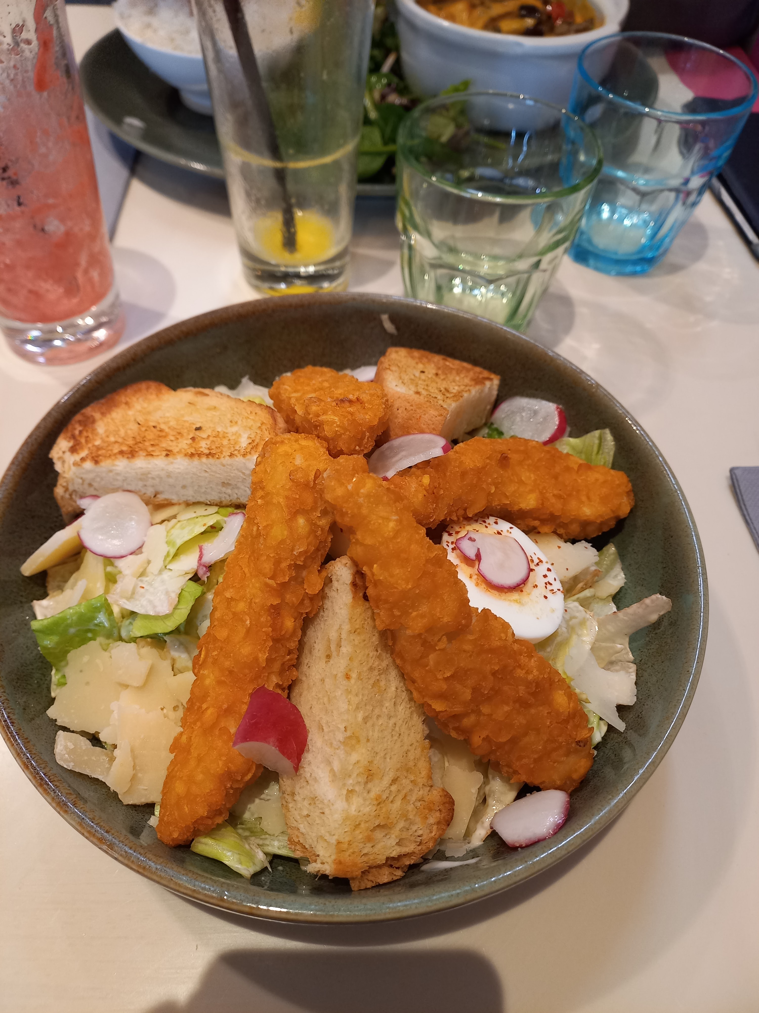 Salade César et cocktail Joséphine Baker juste avant un ciné.... parfait. Le filet de poulet est croustillant à souhait, la salade fraîche et croquante. Merci