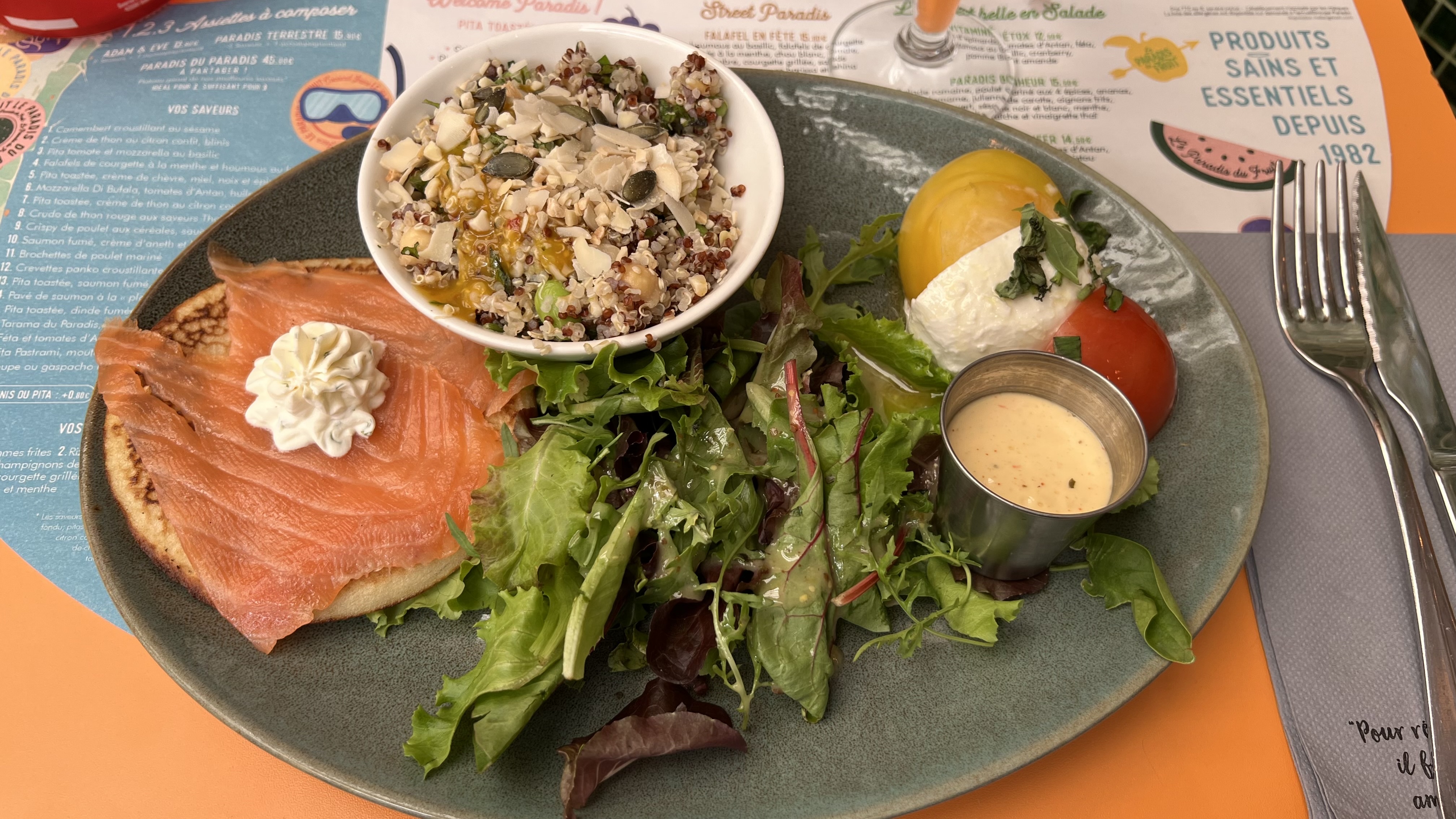 Ce qui était dans l'assiette était bon, légumes et poisson parfaitement cuits, néanmoins faire payer 14€ pour deux lamelles de saumon et 4minuscules crevettes est risqué. Quelques heures après le repas, la faim s'est faite sentir. L'assaisonnement mangue coriandre sur les crevettes est excellent. Petit bémol pour le thé à la menthe, il m'a été servi tiède. La terrasse est agréable
