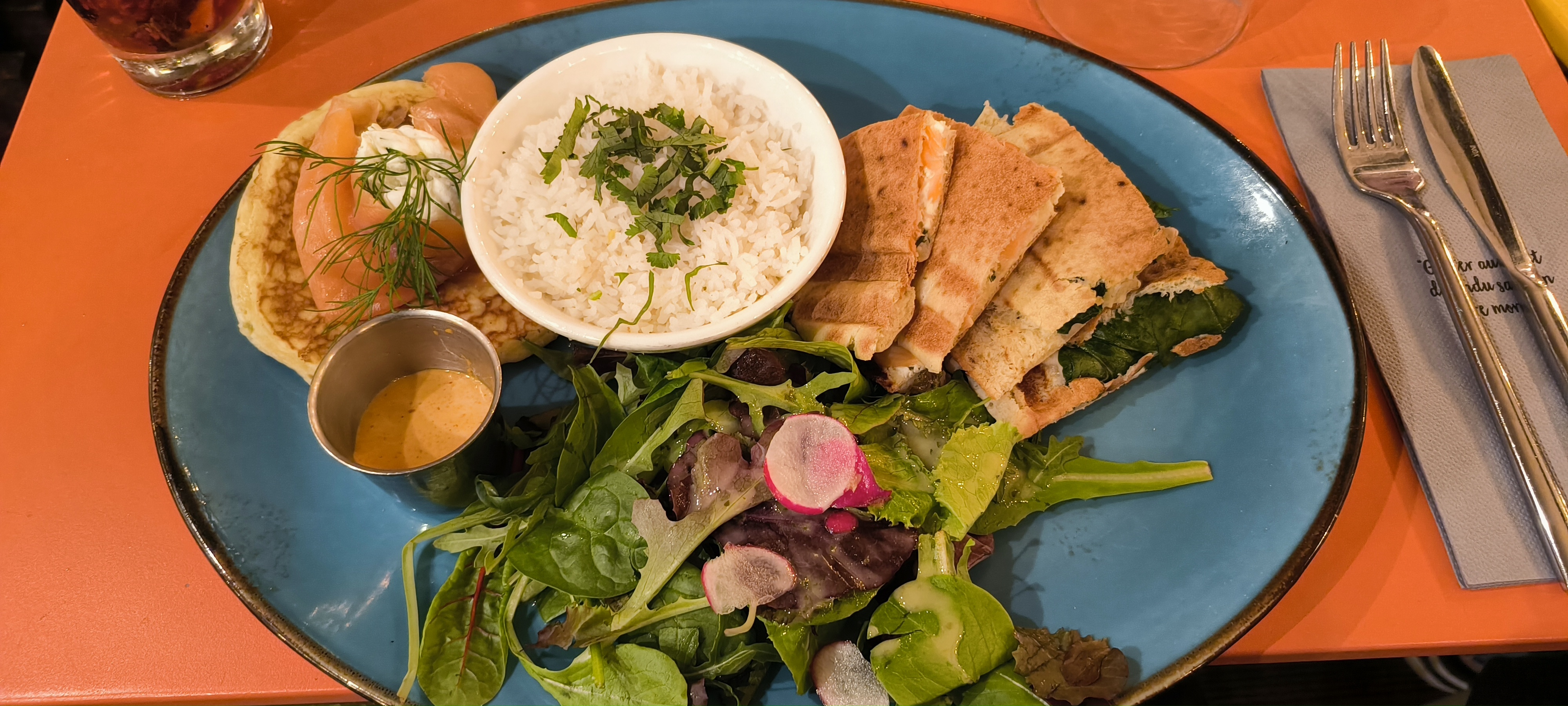 1ere visite et ce fut tres bon. Une salade copieuse, avec des surprises(melange fruits/legumes), plein de coriandre(j'en raffole). Un bon jus et dessert top !