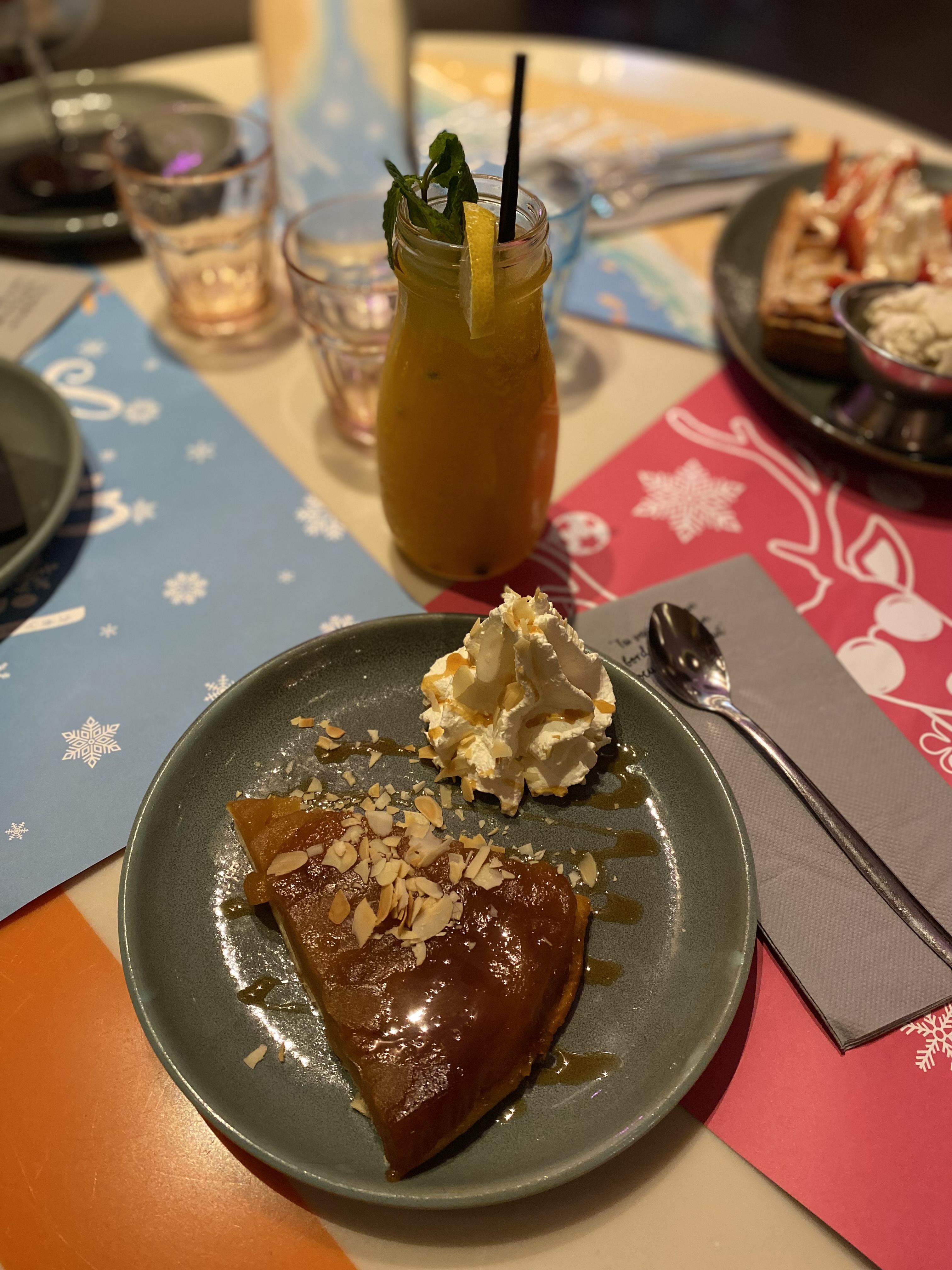 S'il était possible de mettre 0, je l'aurais sûrement fait.... Je commande une tarte tatin : je reçois une toute petite part (qui coûte tout de même environ 9e) D'ailleurs, niveau goût, c'est le même que pour une tarte tatin surgelée Lidl... Ma fiancée commande une gaufre à la fraise, la gaufre est de taille raisonnable mais elle n'est tout simplement pas bonne. Nous commandons avec ça deux jus, un verger jsp et un cocktail milk mais qui arrive sans milk mdr... Le goût du verger, je le cherche toujours, pourtant, vu le temps d'attente, il aurait pu être au rendez-vous... Quant à la salle, la musique est trop forte, et résonne de façon très désagréable. L'agencement n'est pas forcément ouf non plus, toutes les tables sont collées les unes sur les autres... (Ma fiancée trouve d'ailleurs les tables trop basses ?)