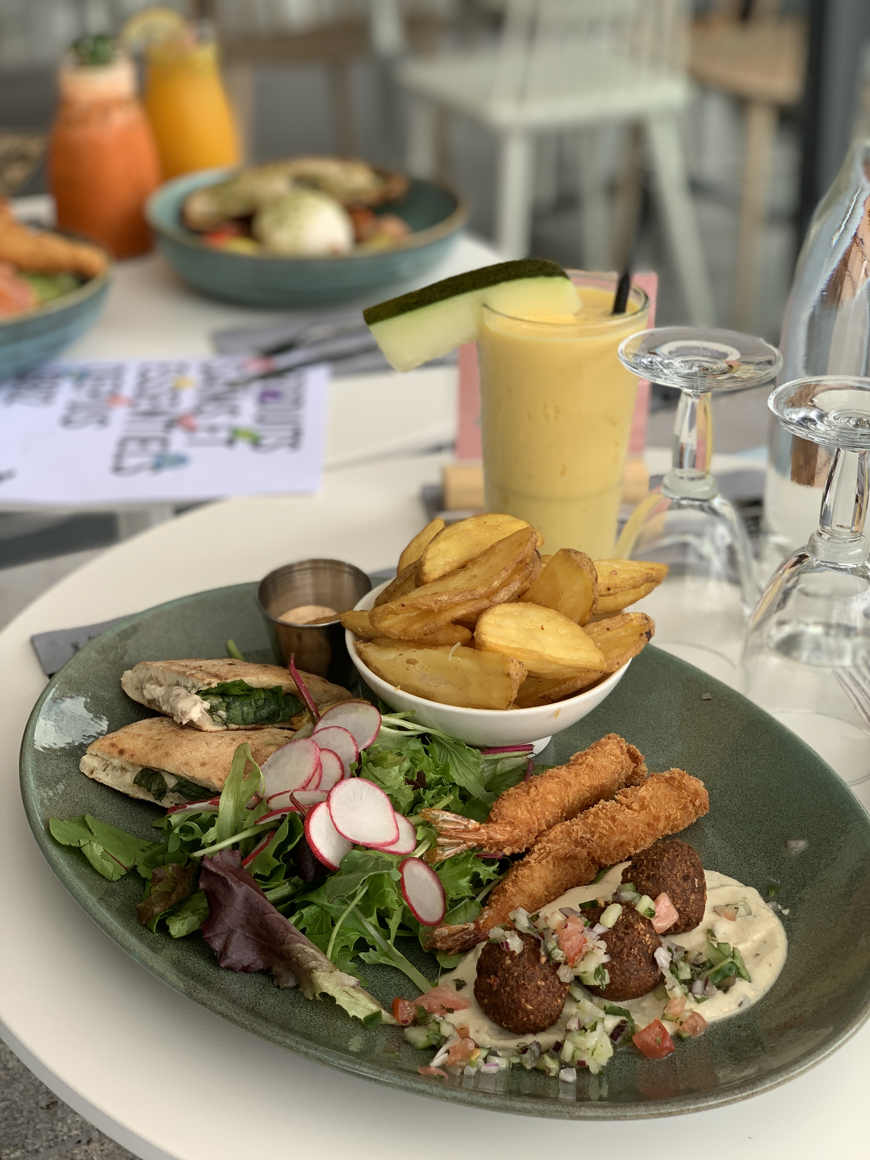 Belle découverte : plats bons et copieux. Nous avons pris les falafels en fête et maman coco rose, et les plats étaient vraiment bons et le prix raisonnable. Je n'ai mis que 4 étoiles sur 5 car les prix des cocktails et des desserts sont élevés, même si la qualité est là. Nous avons pris chacun 1 cocktail à 11€ et ma glace (excellente !) était presque à 13€! C'est très cher mais elle était très bonne. Bonne adresse mais il faut faire attention car l'addition grimpe vite :-(