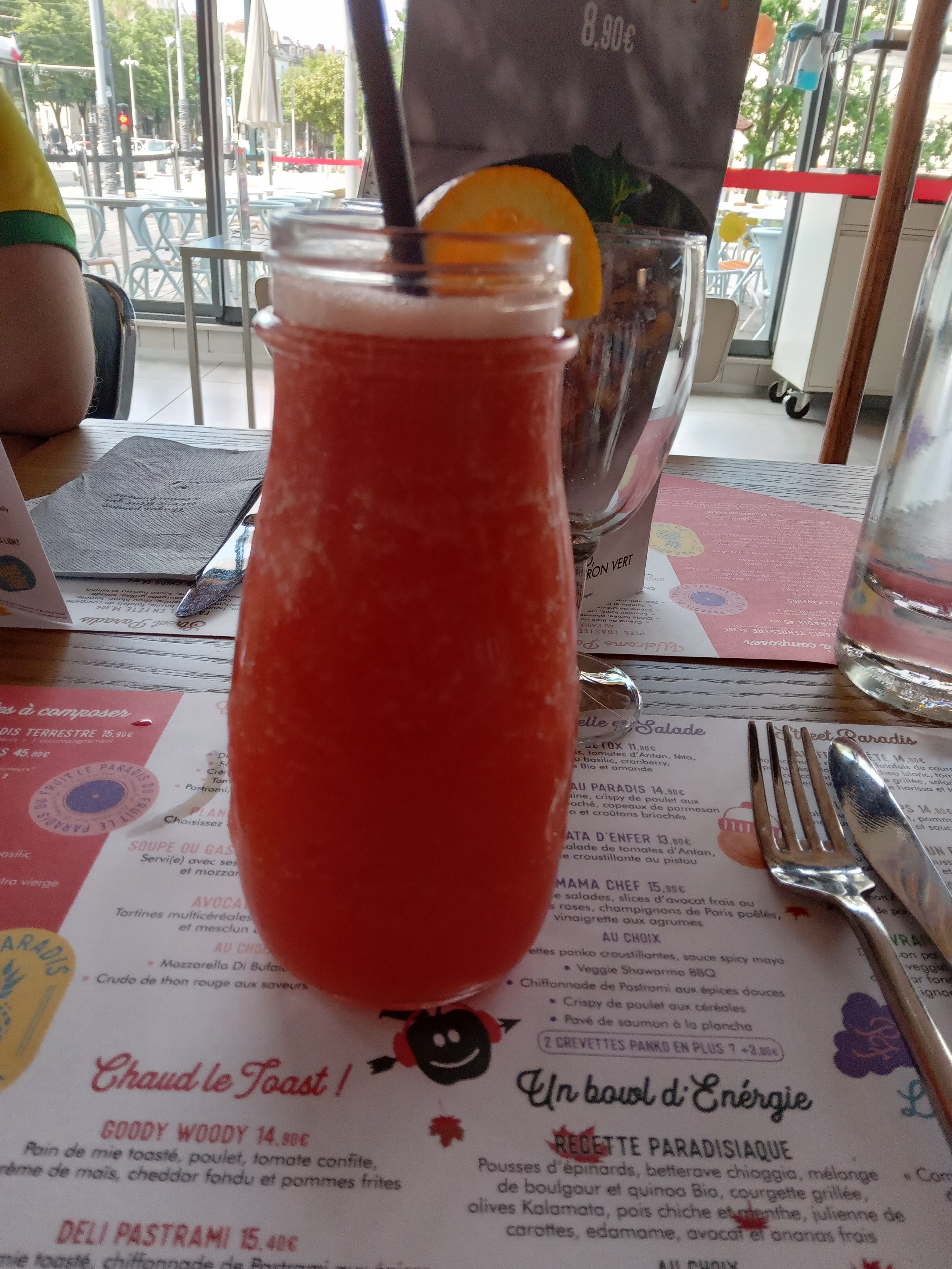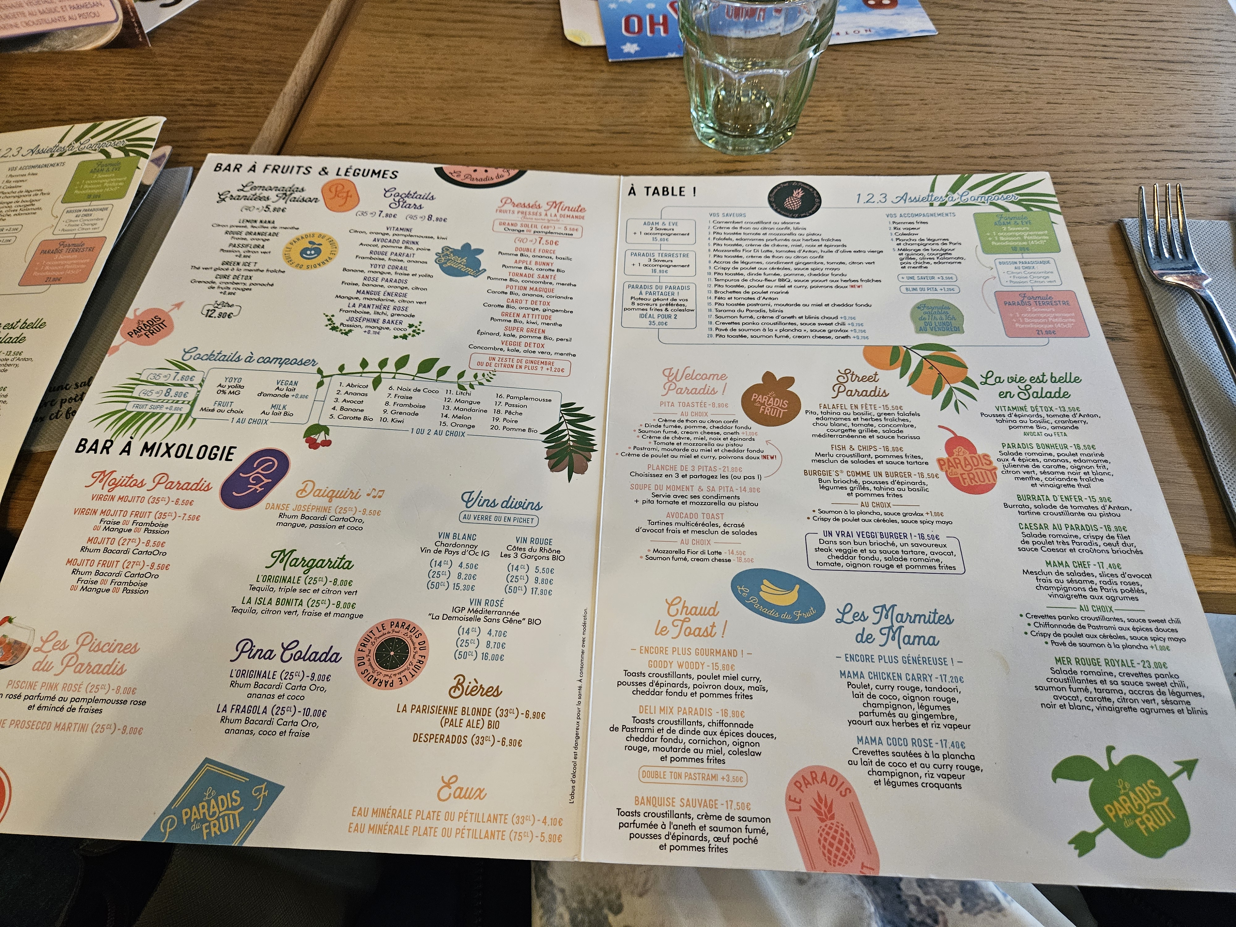 Nous avons enfin franchis le pas, et d aller a la découverte de ce fameux bar/restaurant le peradis du fruit en centre ville ce soir. Et vraiment pas déçu y a du choix au niveau de la carte. Le personnel est souriant et très proche de leurs clients ! Juste une petite remarque, si y aurait du l eau fraiche des pichets cela aurait été un petit plus (surtout en ce temps chaud) et éventuellement dire sur vos carte si c est avec ou sans alcool vos cocktails 🍸 Sinon au top l équipe ⭐️⭐️⭐️⭐️