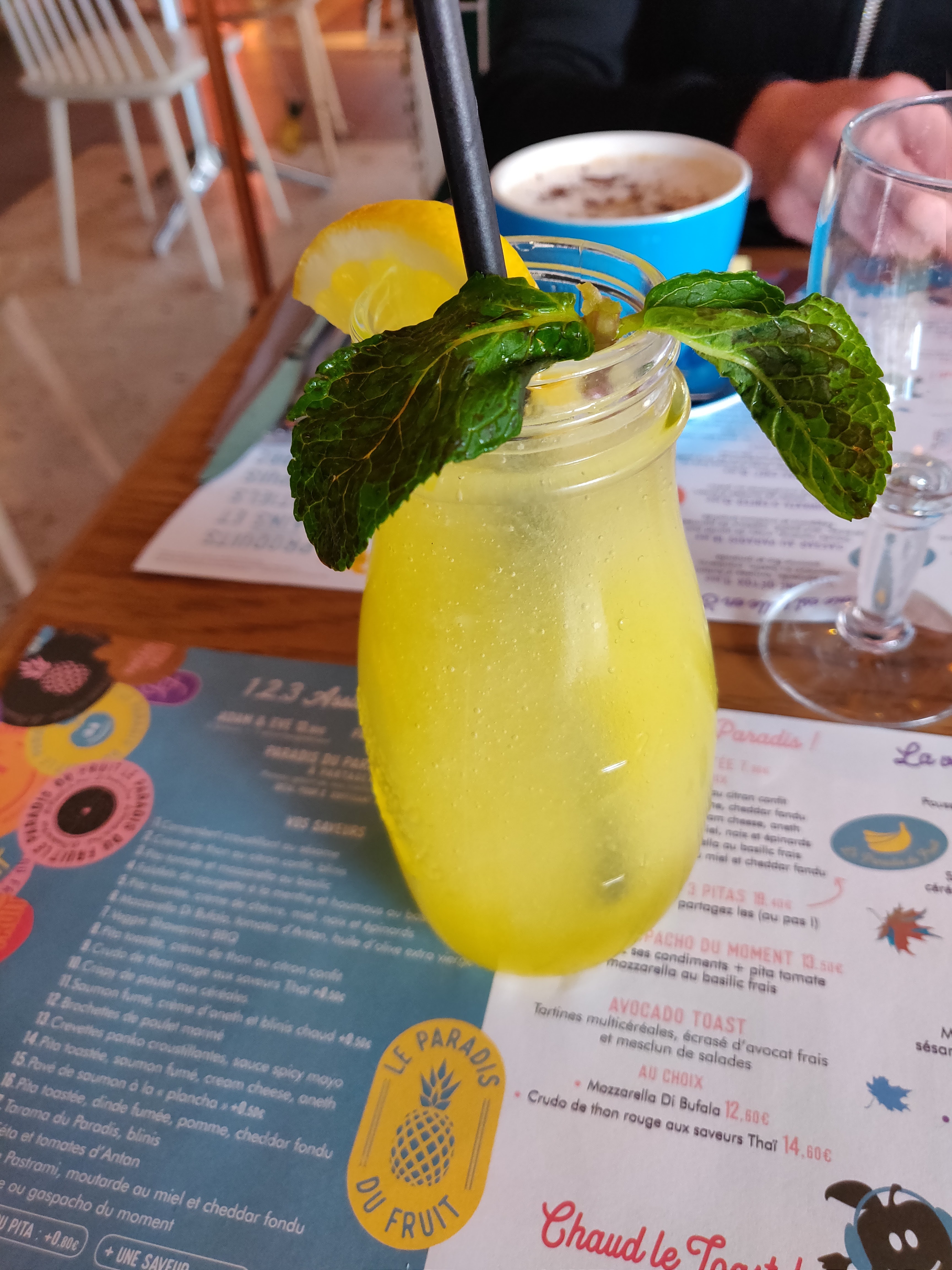 J'ai passé un très bon moment ce midi au Paradis du fruit. C'était ma première fois au centre-ville de Nantes et Je voulais juste prendre un café dans ce restaurant mais j'ai finalement fini par manger un plat si délicieux recommandé par ce garçon extraordinaire et très très malin qui s'appelle Fino (alors ce jeune homme m'a régalé avec ses petits blagues à la con 😂, j'arrêtais pas de rigoler quand je croisais son regard)fin bref, mais j'ai vraiment adoré ce que j'ai mangé, l'ambiance, et surtout cet équipe des jeunes qui font de ce restaurant un endroit agréable et convivial. Je recommande fortement et je reviendrais, ce sûre.
