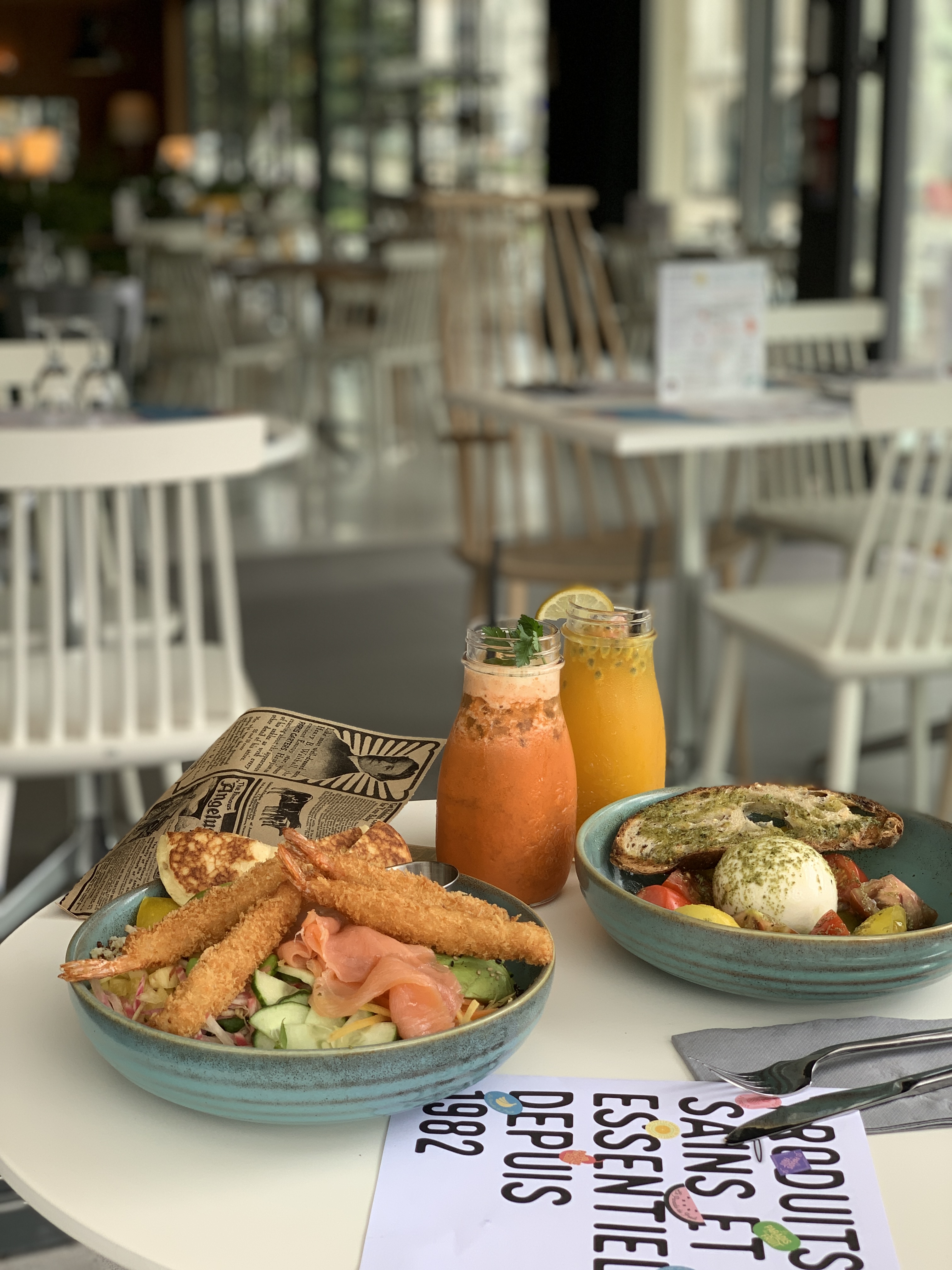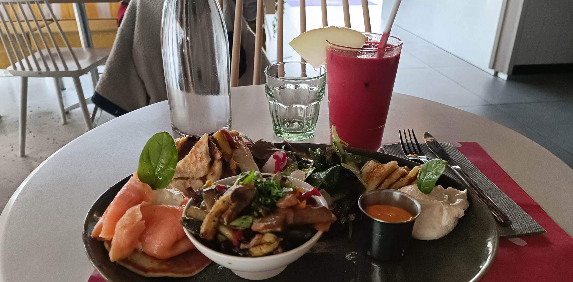 Très bel endroit, coloré, la décoration est très belle, on a l’impression d’être en été toute l’année. En ce qui concerne la carte, les produits proposés sont originaux et équilibrés. La portion des plats est correct. Je reviendrais avec plaisir pour goûter d’autre plats. Dommage qu’il pleuvait, cela aurait été très agréable de manger en extérieur sur la terrasse.